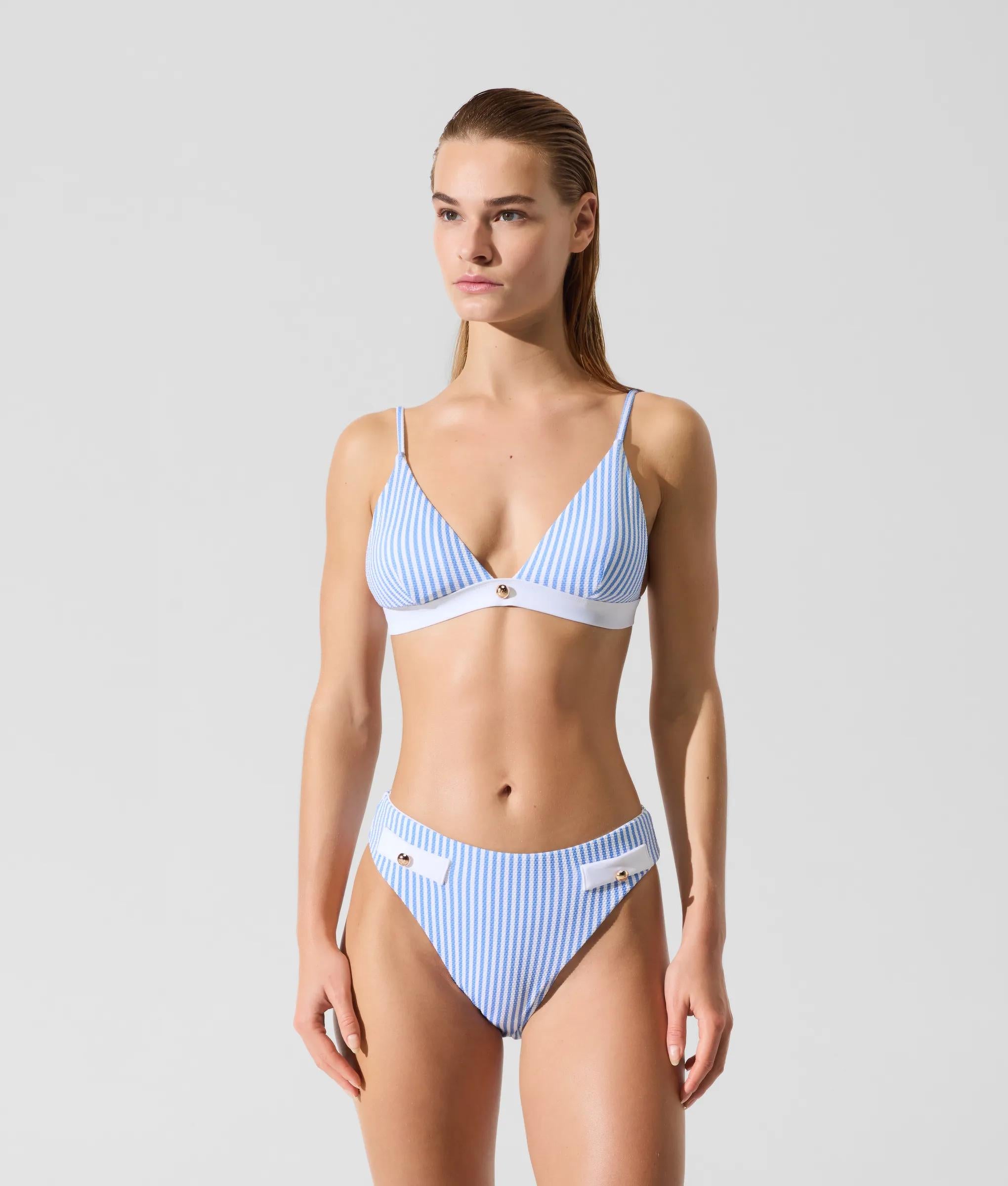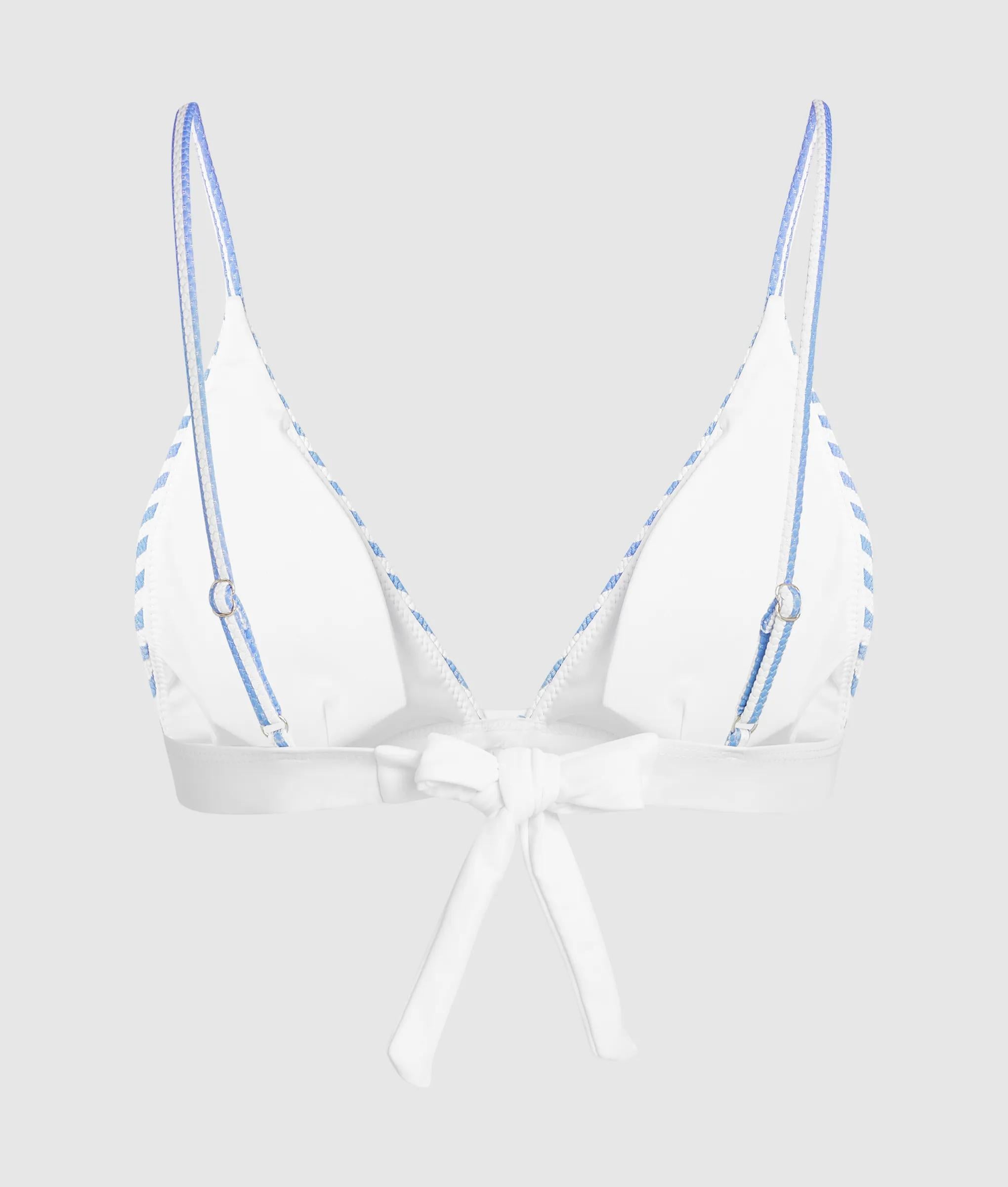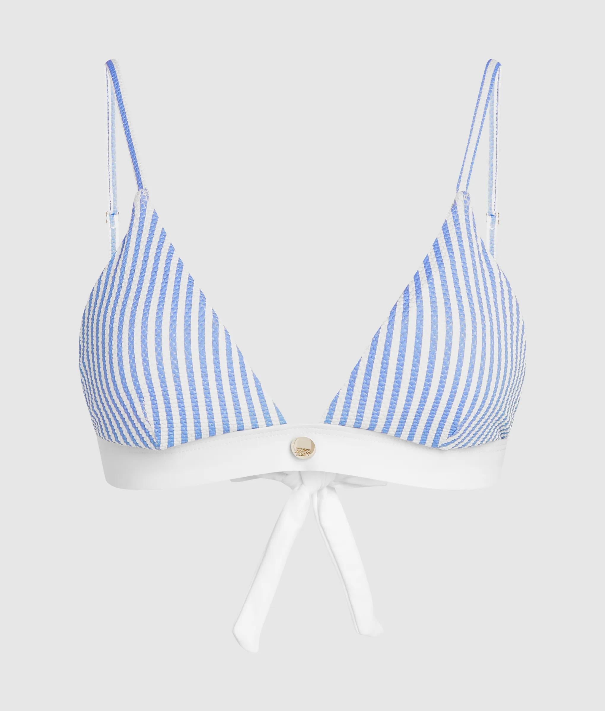 Sun-kissed and sculpted, this bikini top features triangle cups with removable padding and self-tie straps for a tailored fit. A gold button embellishment adds a sophisticated finish.