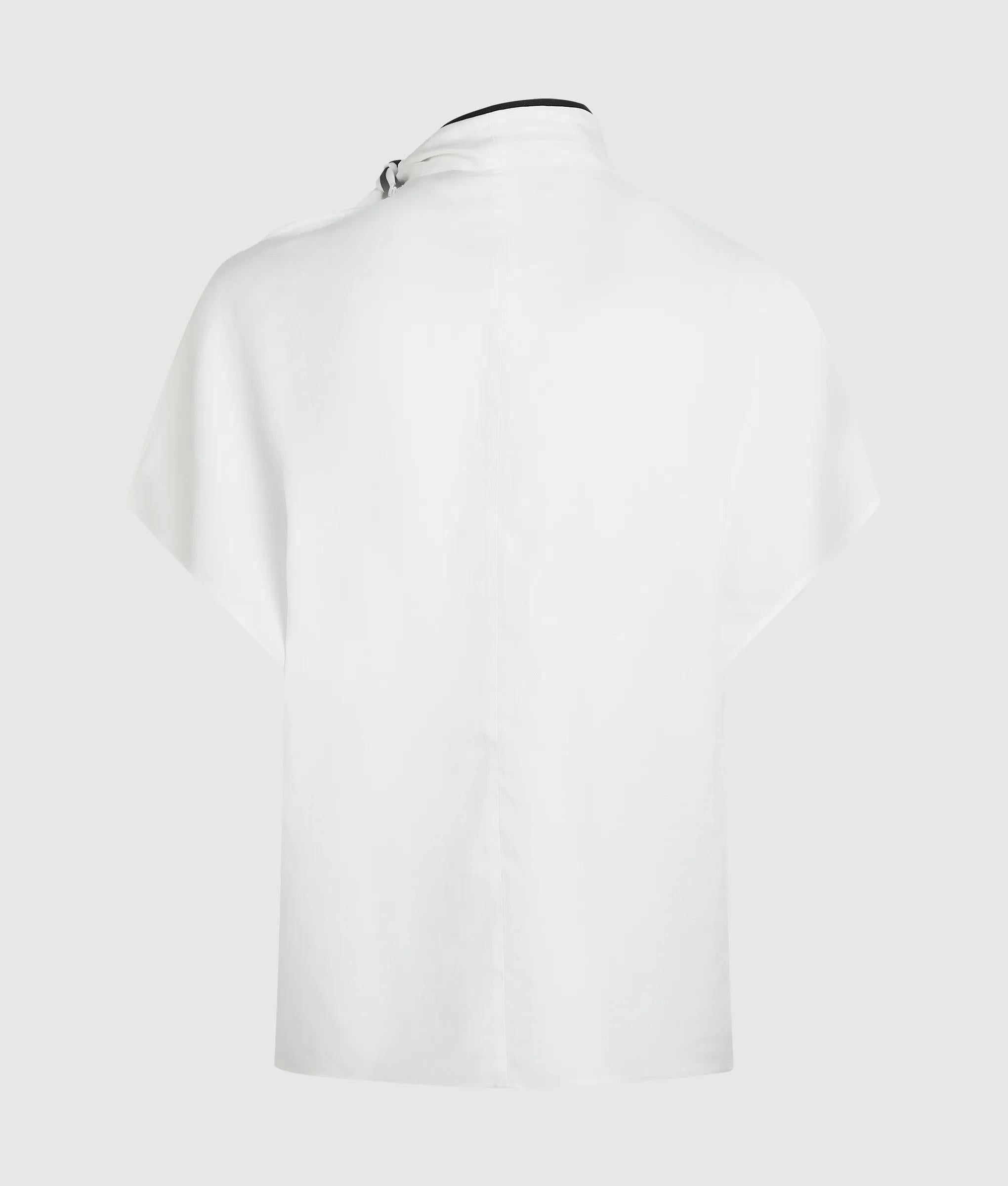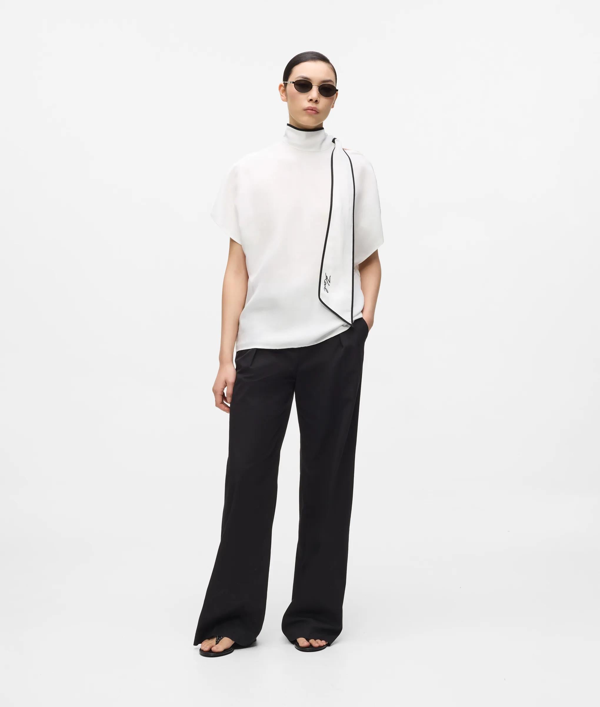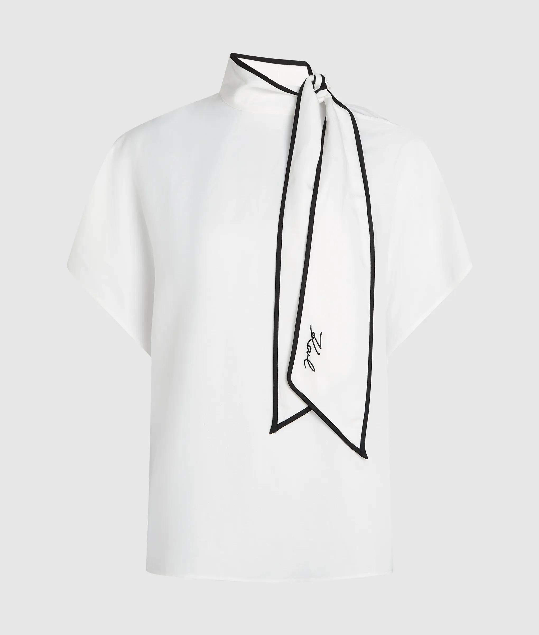 This high-neck blouse with a self-tie scarf offers a refined silhouette. Elegant piping and an embroidered Signature logo elevate the short-sleeved essential.