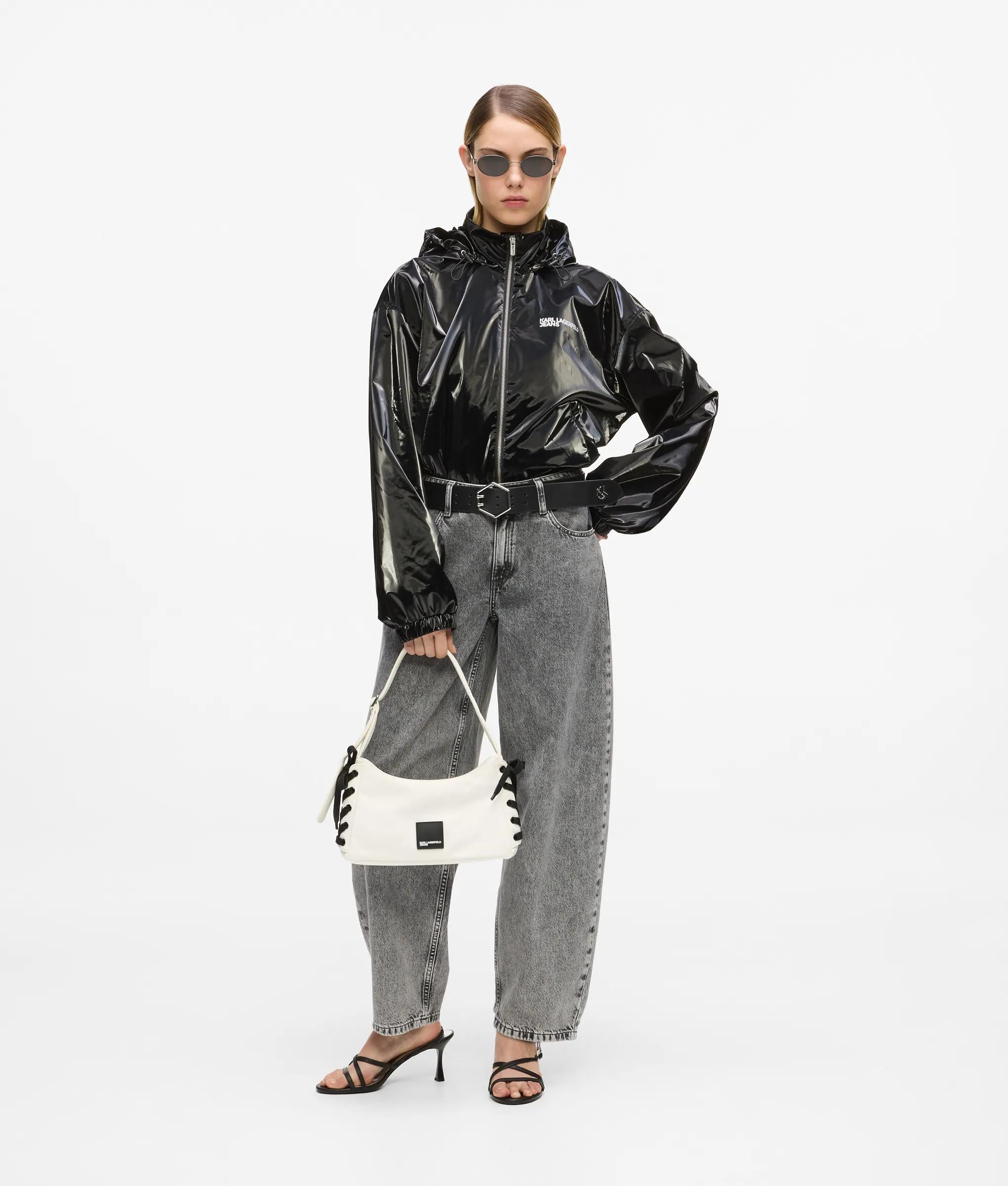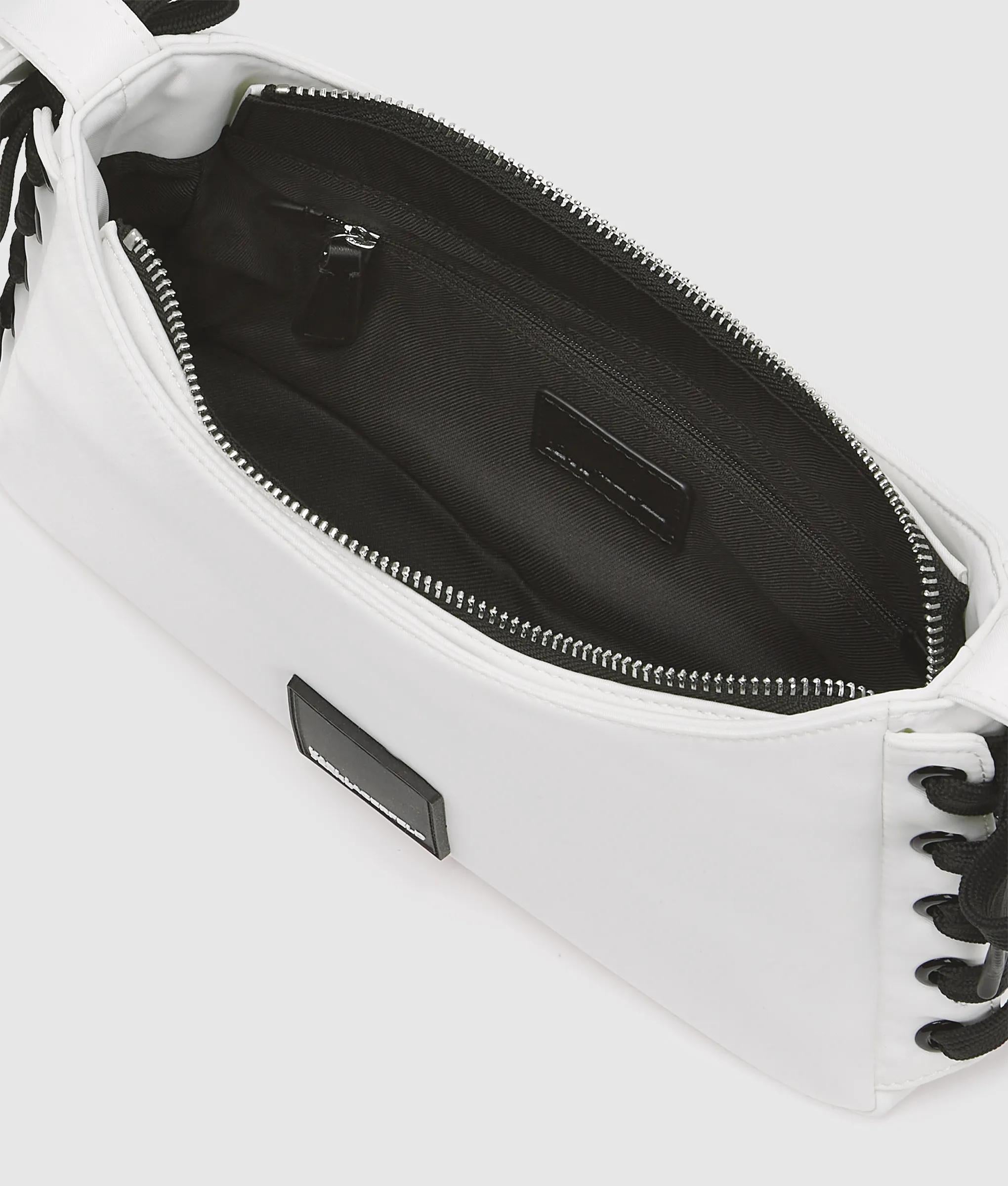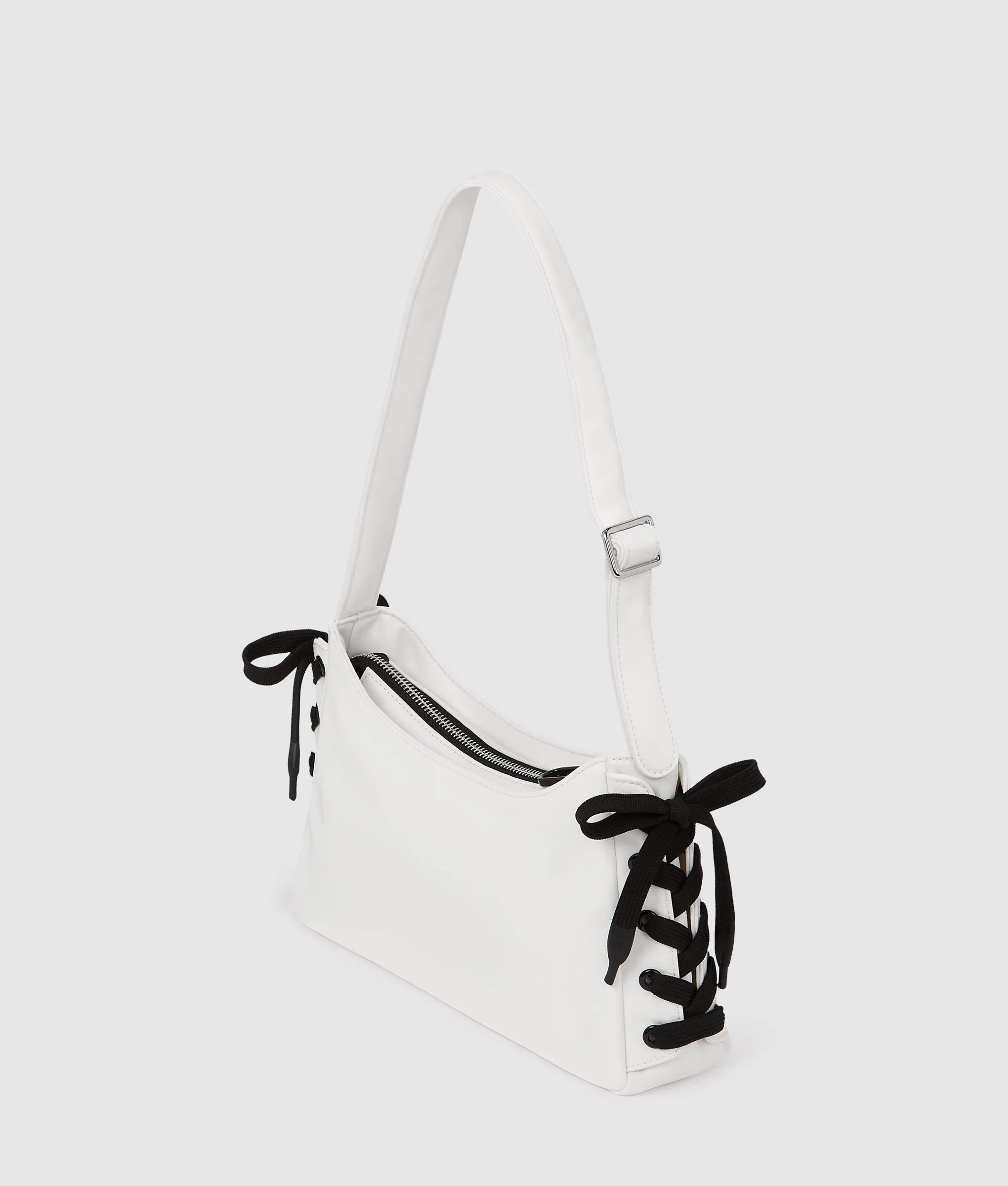 Add edge to any outfit with this shoulder bag, crafted from nylon with bold lace-up detailing for an urban feel. The adjustable strap and secure zip-top make it a perfect everyday statement piece.