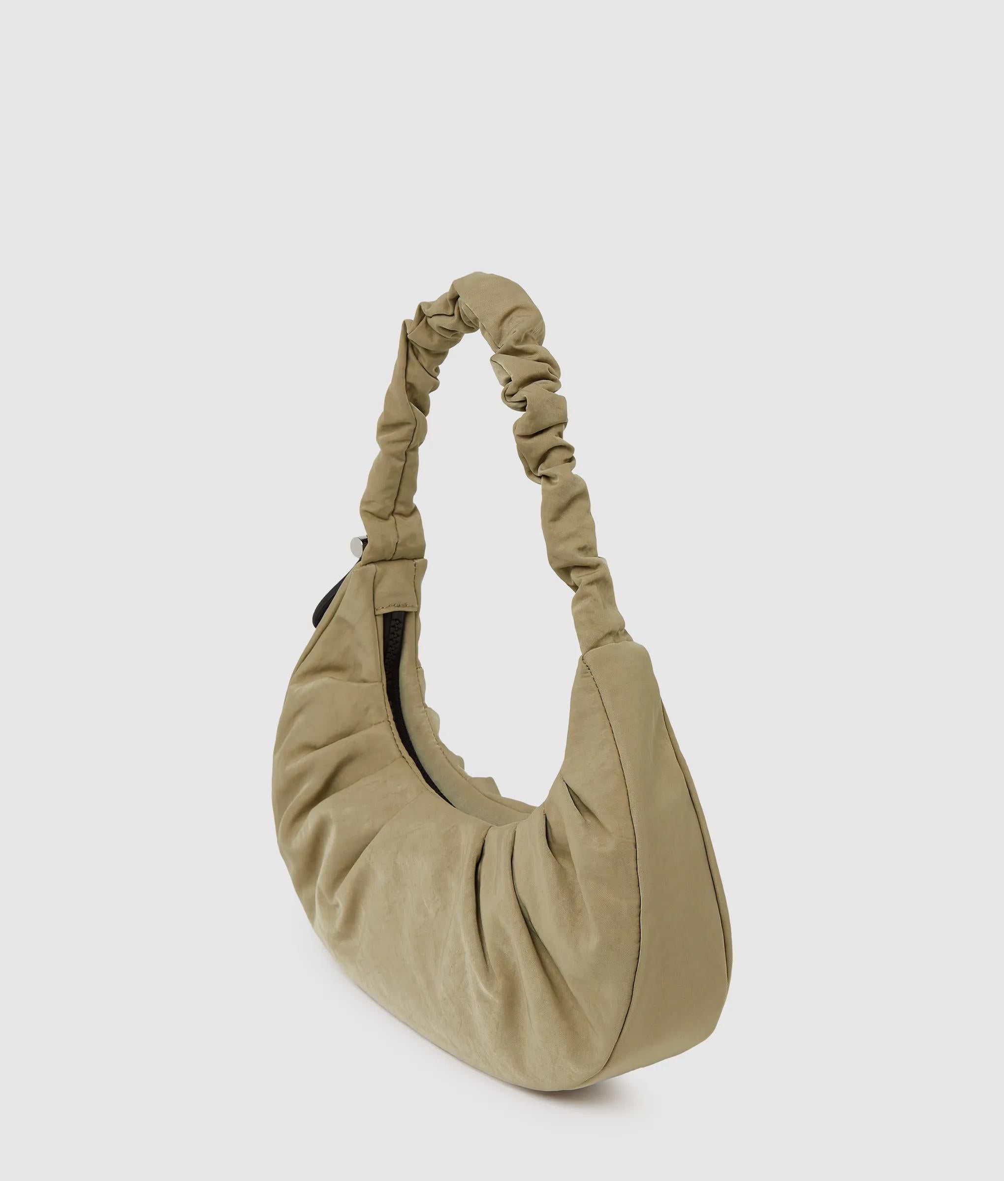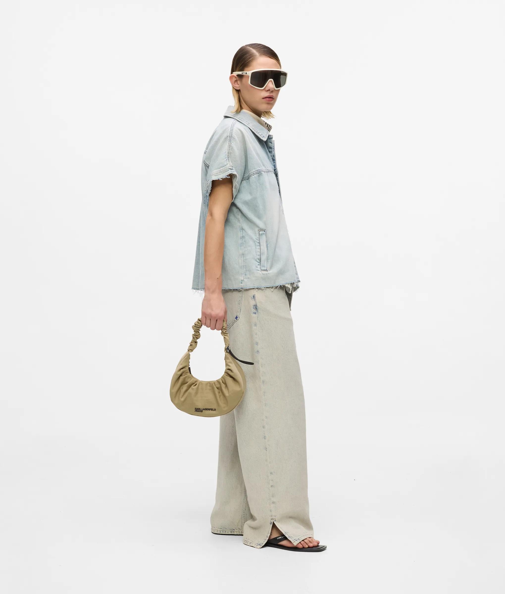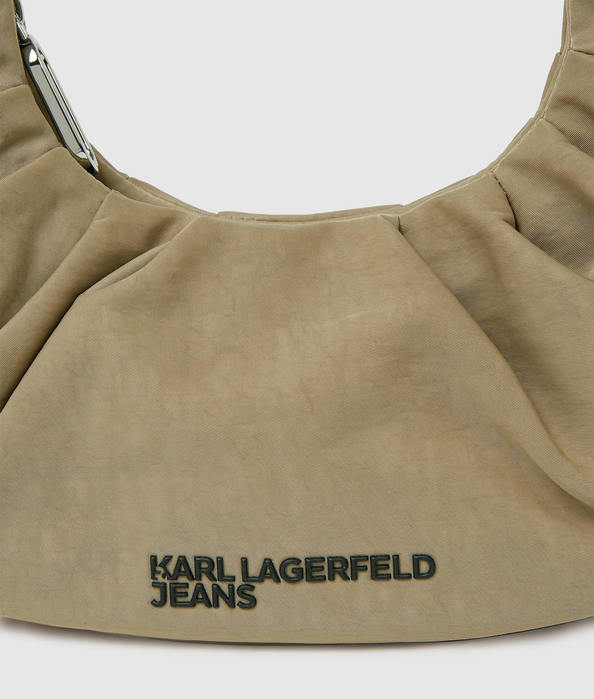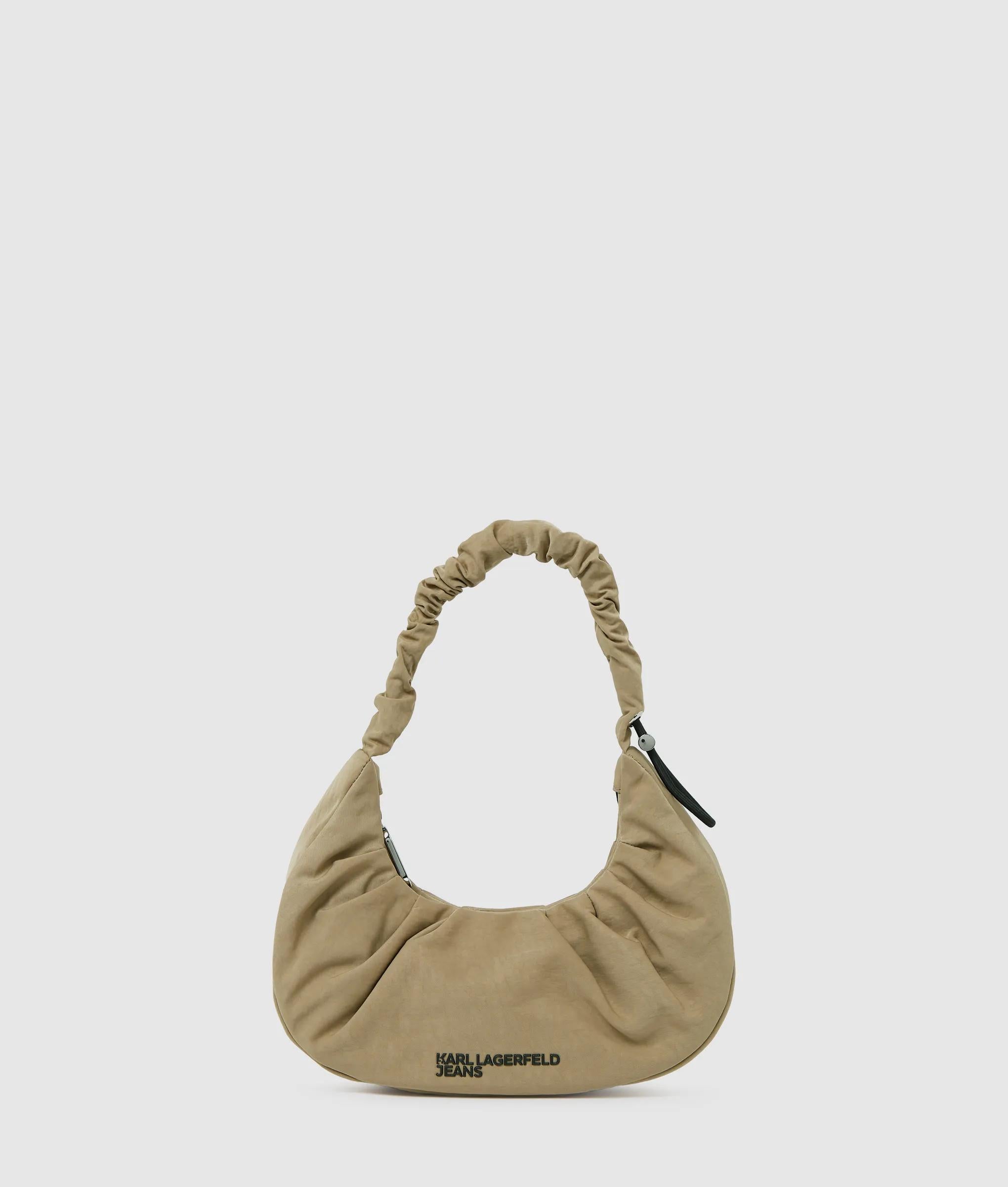 Textured nylon gathers define this small hobo bag, accented by a ruched adjustable strap with urban drawstring and toggle detailing. Topped with a contrasting KARL LAGERFELD JEANS logo.