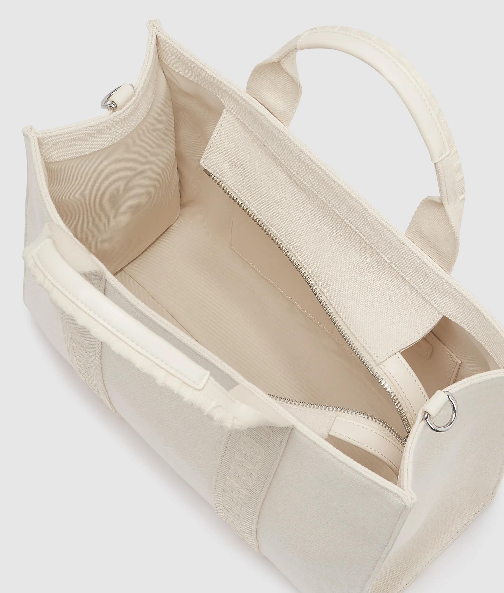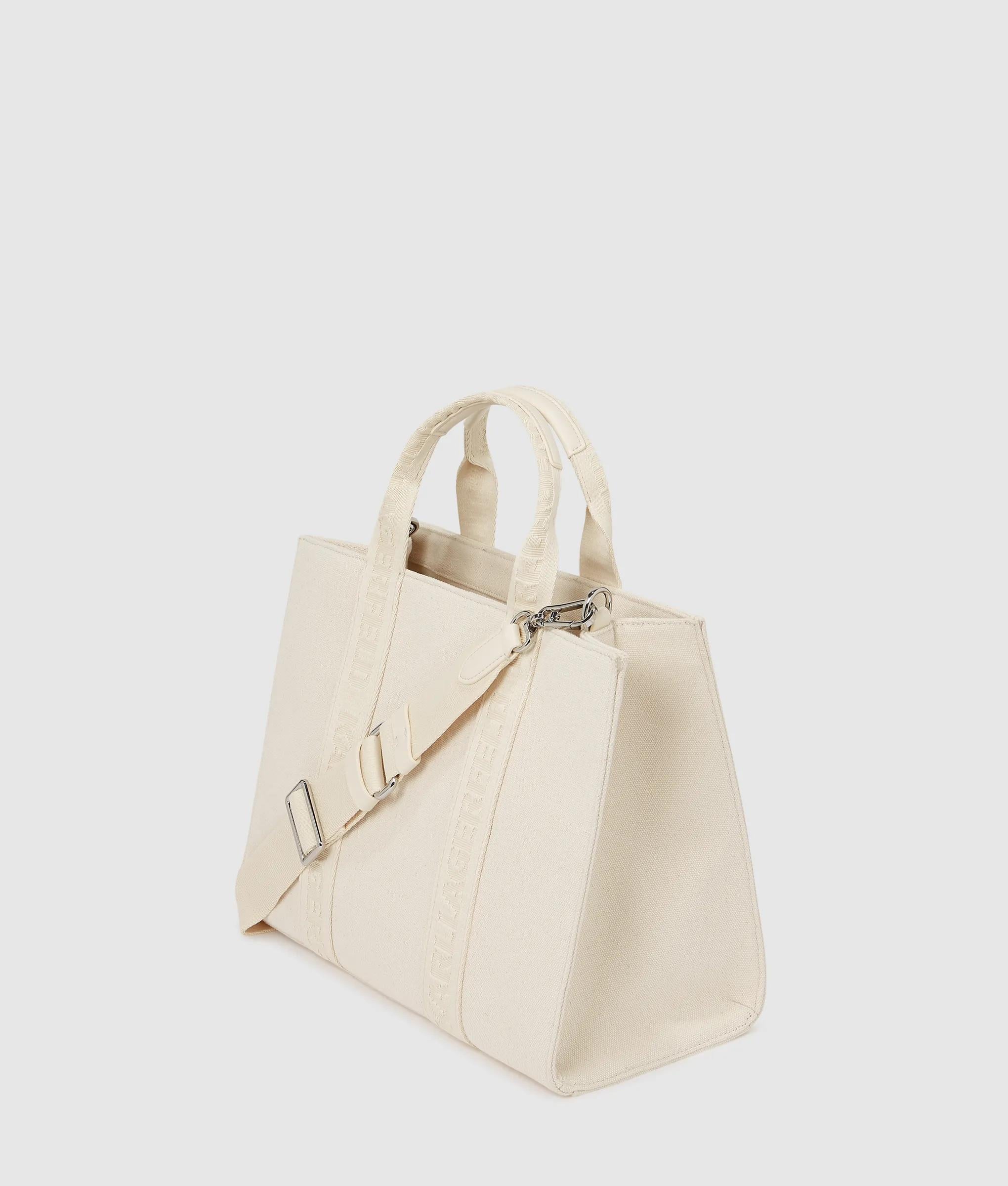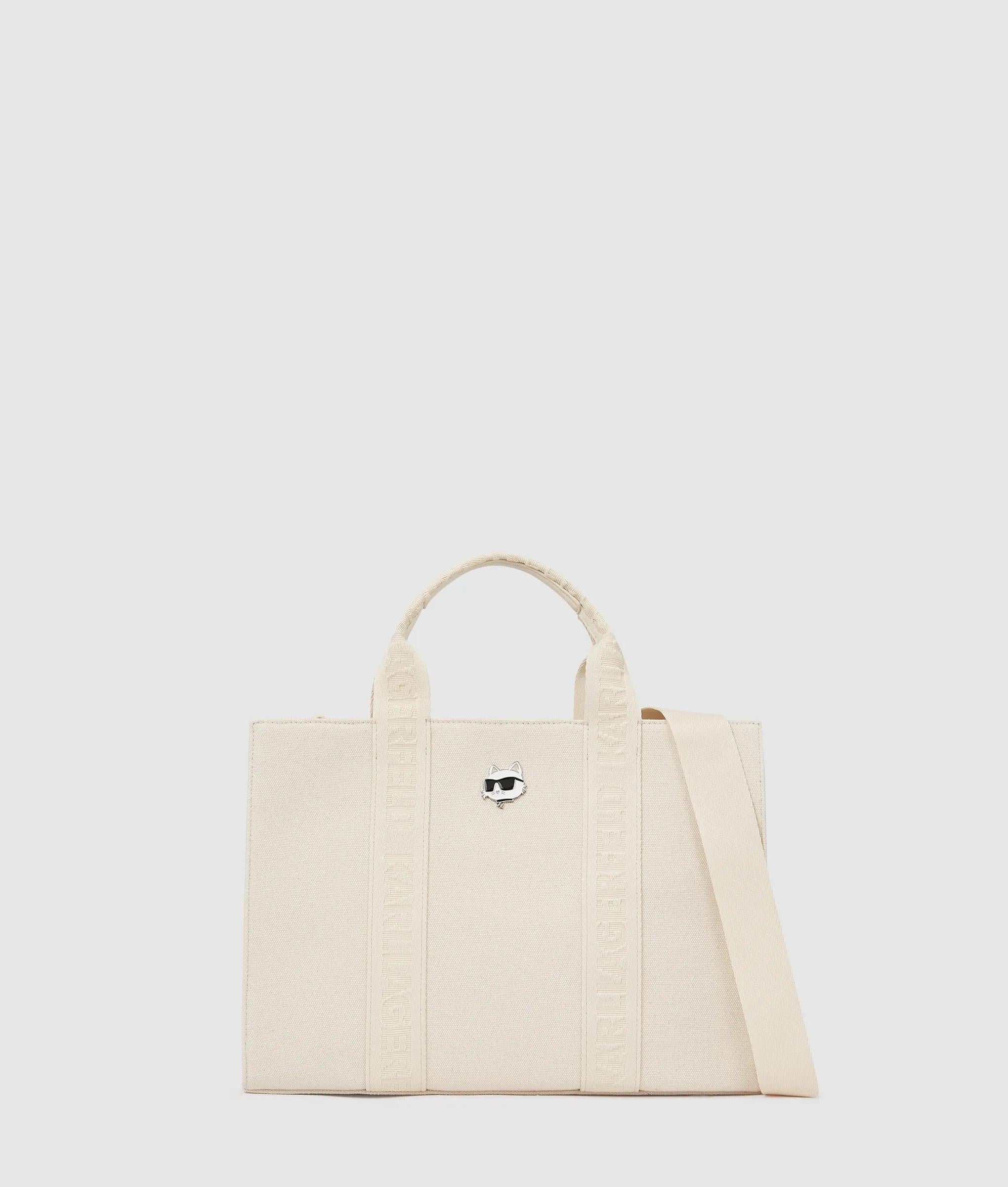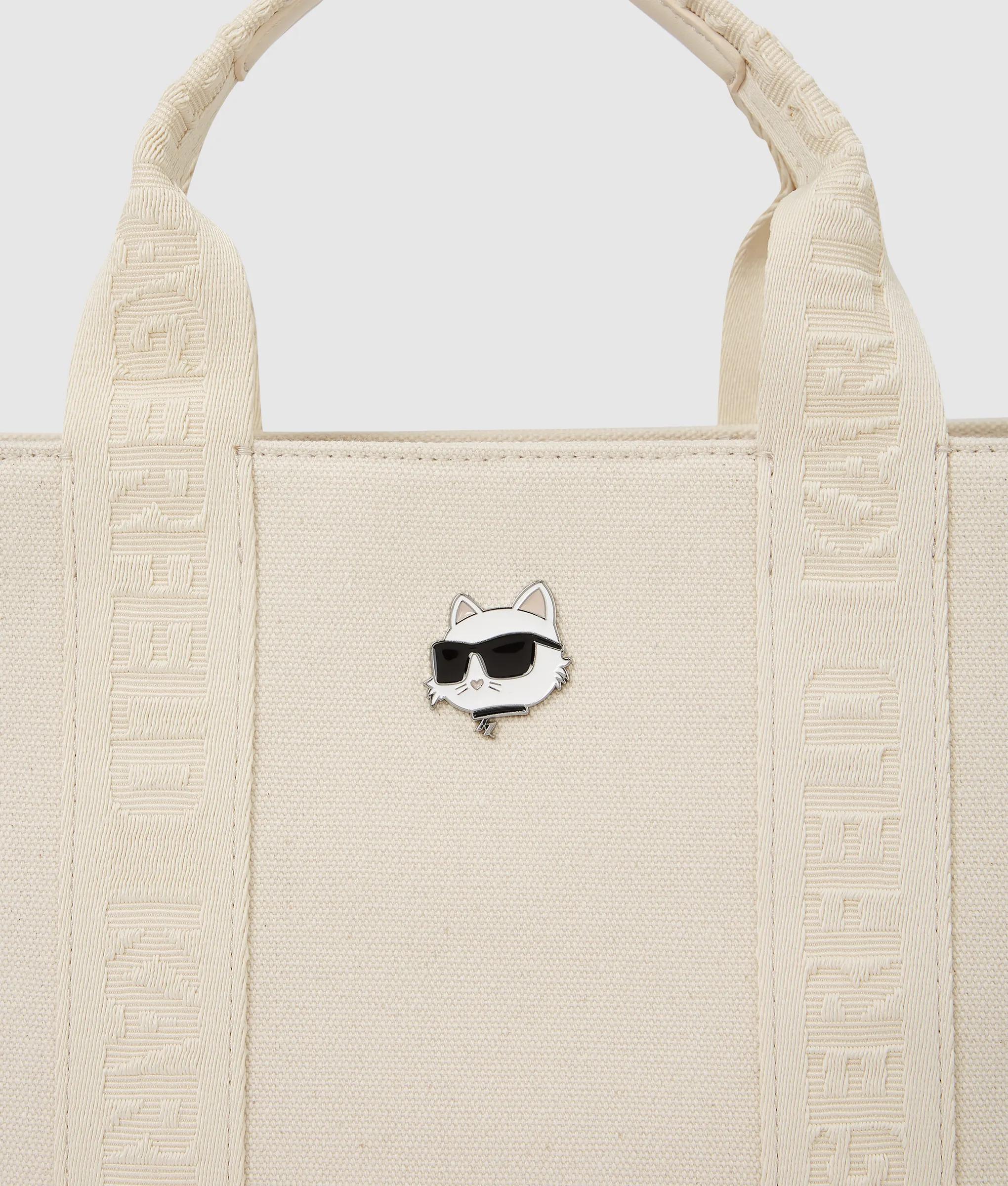 A structured square tote with plush recycled cotton knit, featuring twin handles and a detachable strap. The Ikon Choupette pin adds a playful signature touch to elevate everyday style.