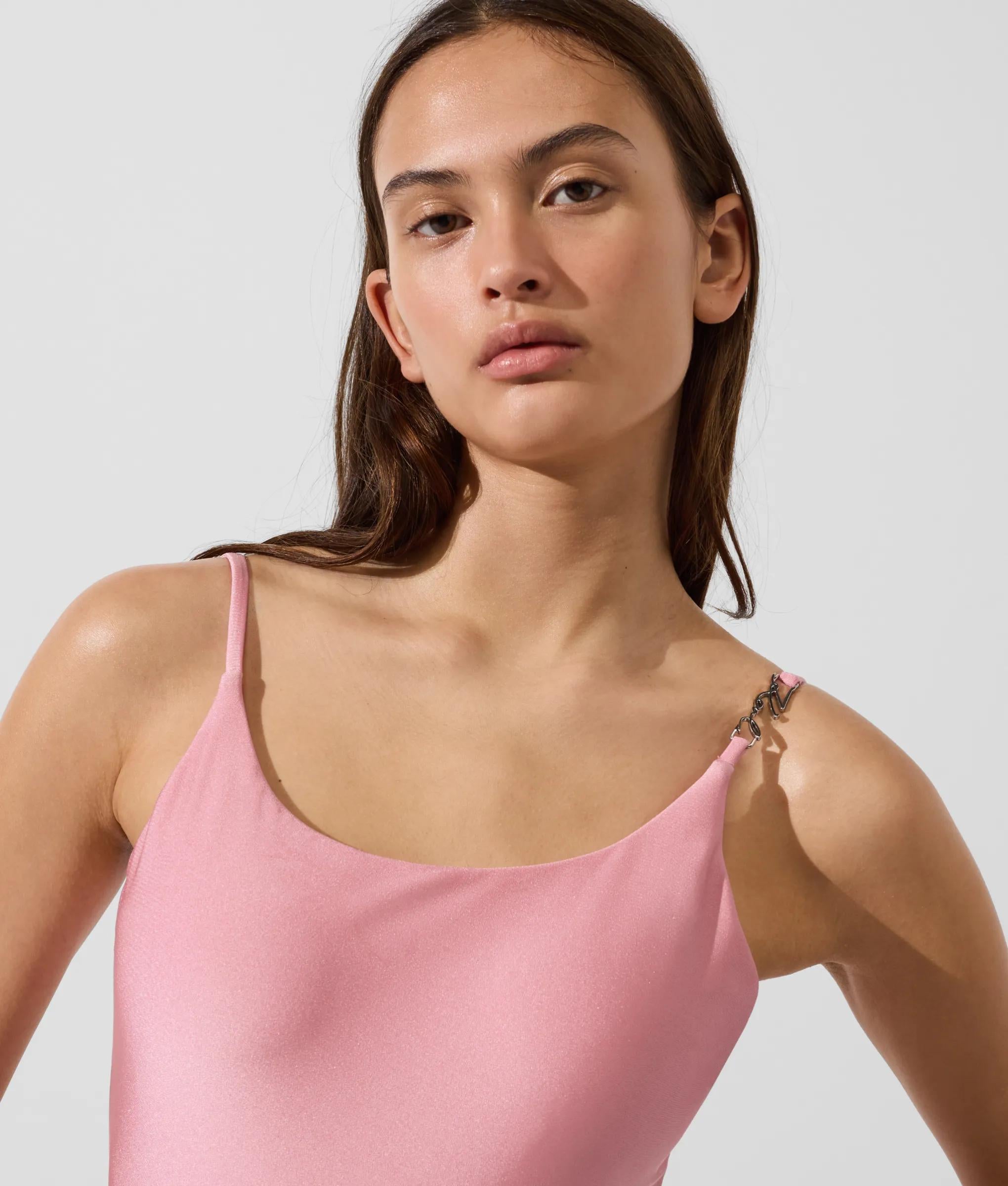 Dive into summer with this classic swimsuit, featuring a flattering scoop neck and back, complemented by adjustable shoulder straps for the perfect fit. The high-leg design offers cheeky coverage, adorned with a KARL Signature charm for an elegant flourish.