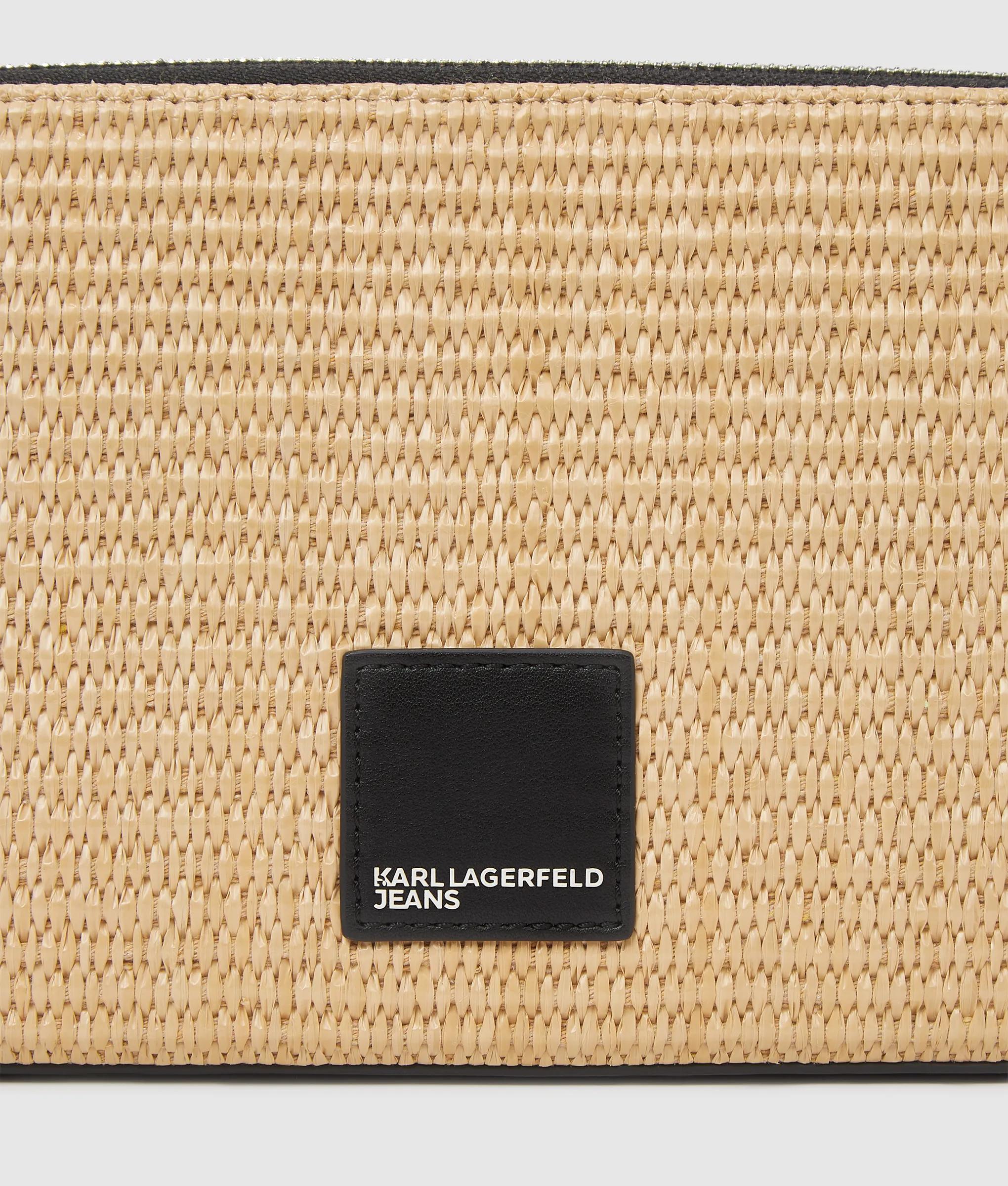 Express your style with this sleek pouch, featuring a shoulder strap that can be converted into a wristlet. A summery woven finish and bold KARL LAGERFELD JEANS complete the versatile piece.