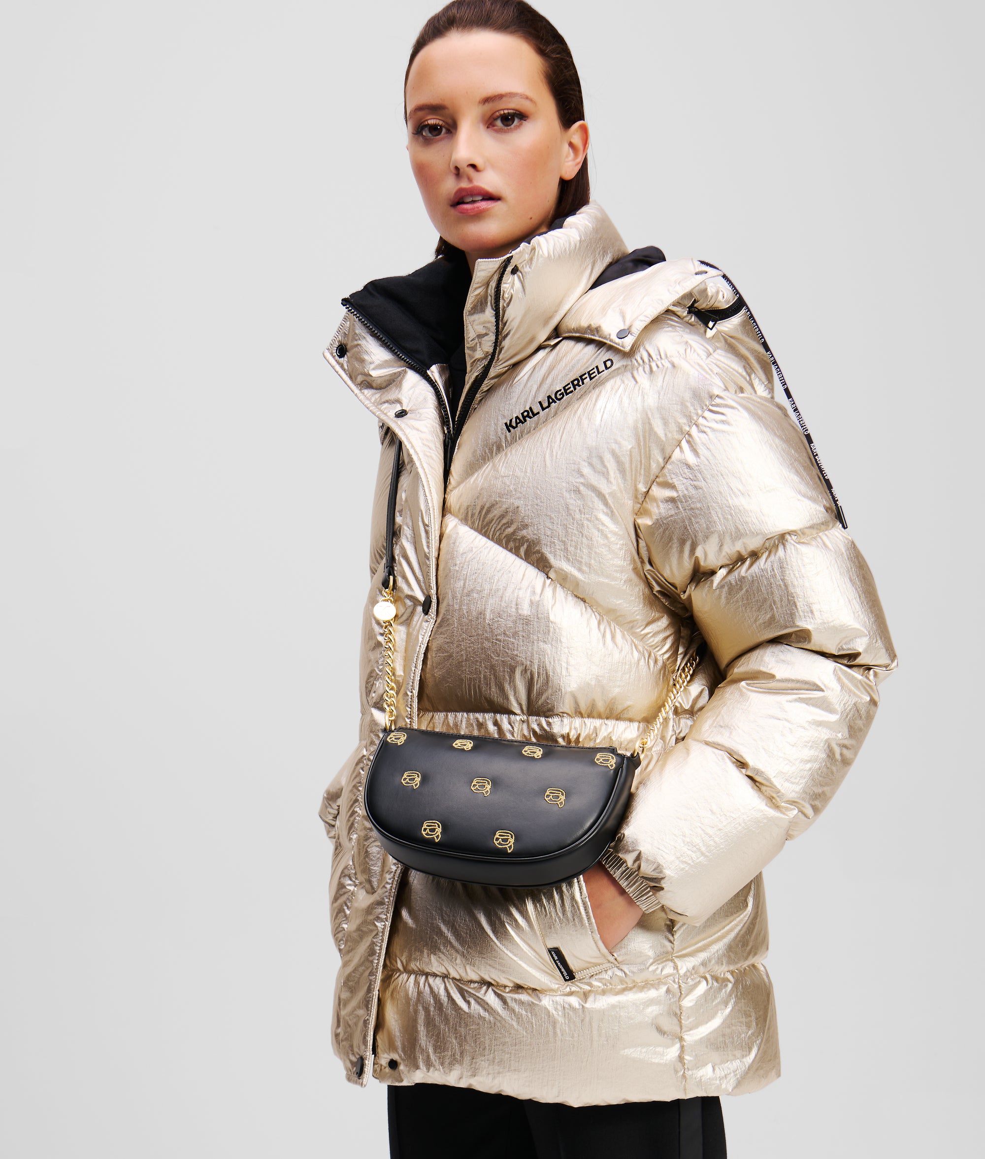 An iconic must-have. Featuring golden IKON Karl embellishment, this pouch is the epitome of playful sophistication. The chain and technical leather strap add a touch of elegance to elevate your ensemble.