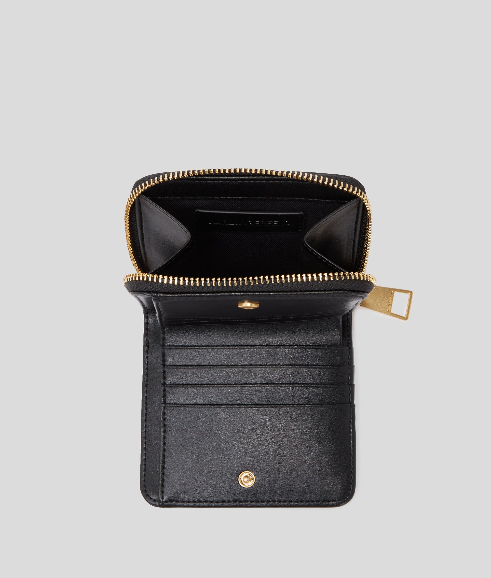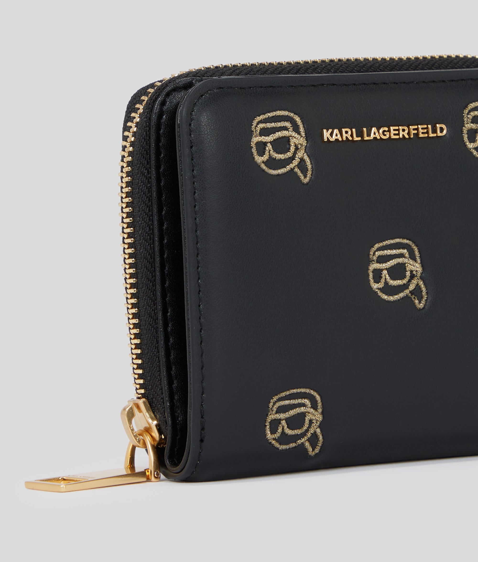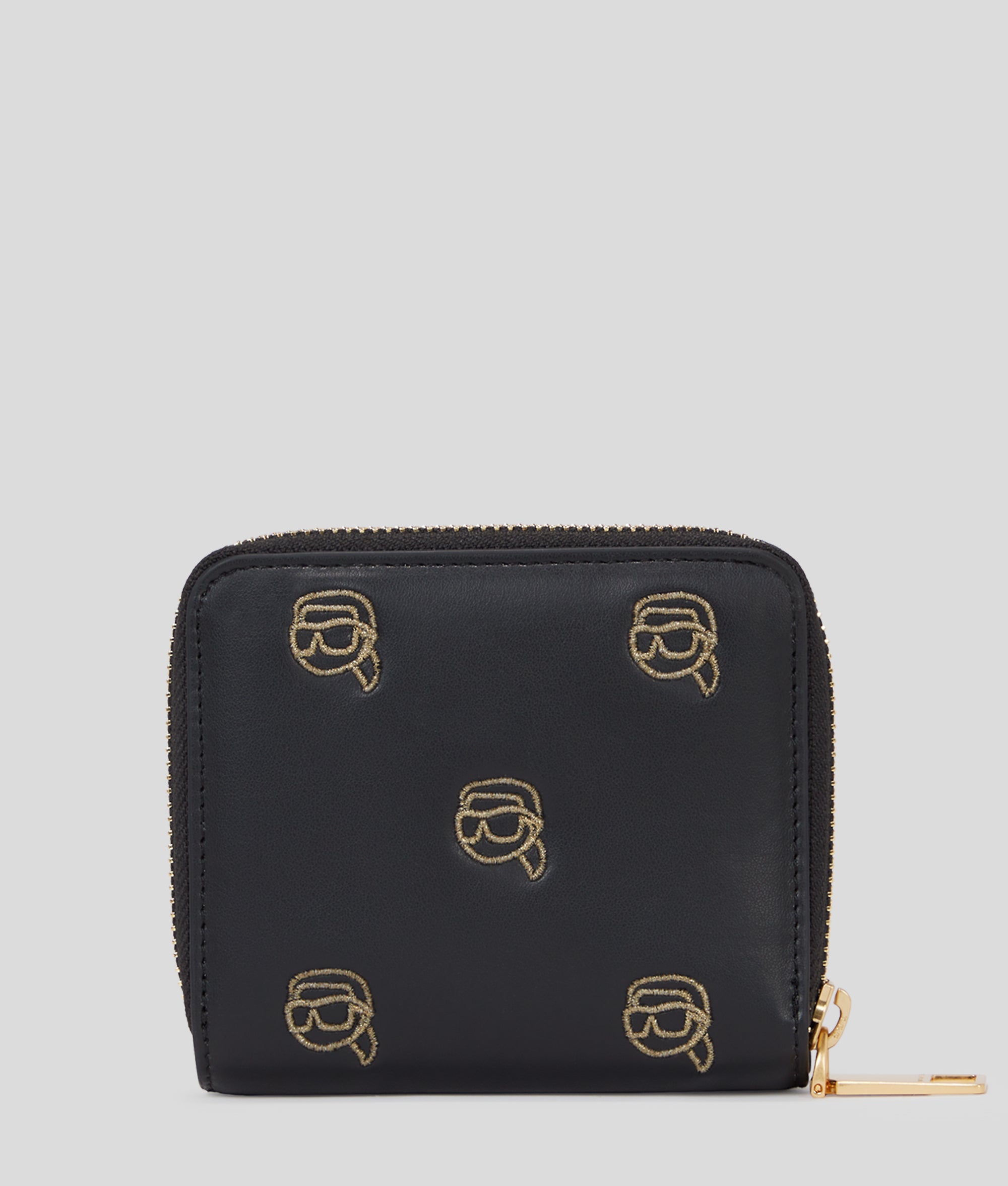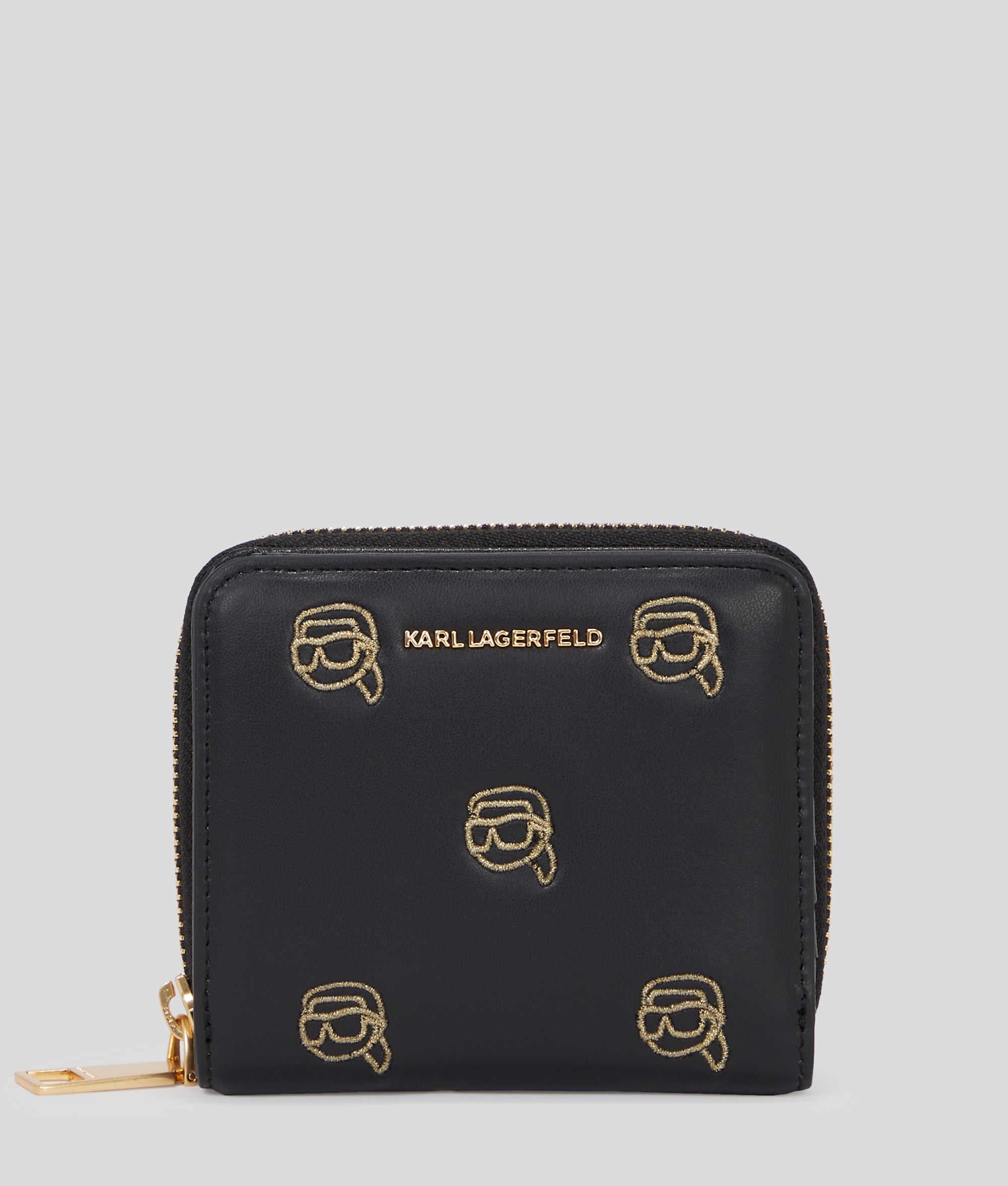 Playful sophistication meets practical design with this bifold wallet from KARL LAGERFELD. Boasting a snap button closure, a zipped coin pocket, and multiple inner card slots, this piece is adorned with all-over golden IKON Karl embroidery.