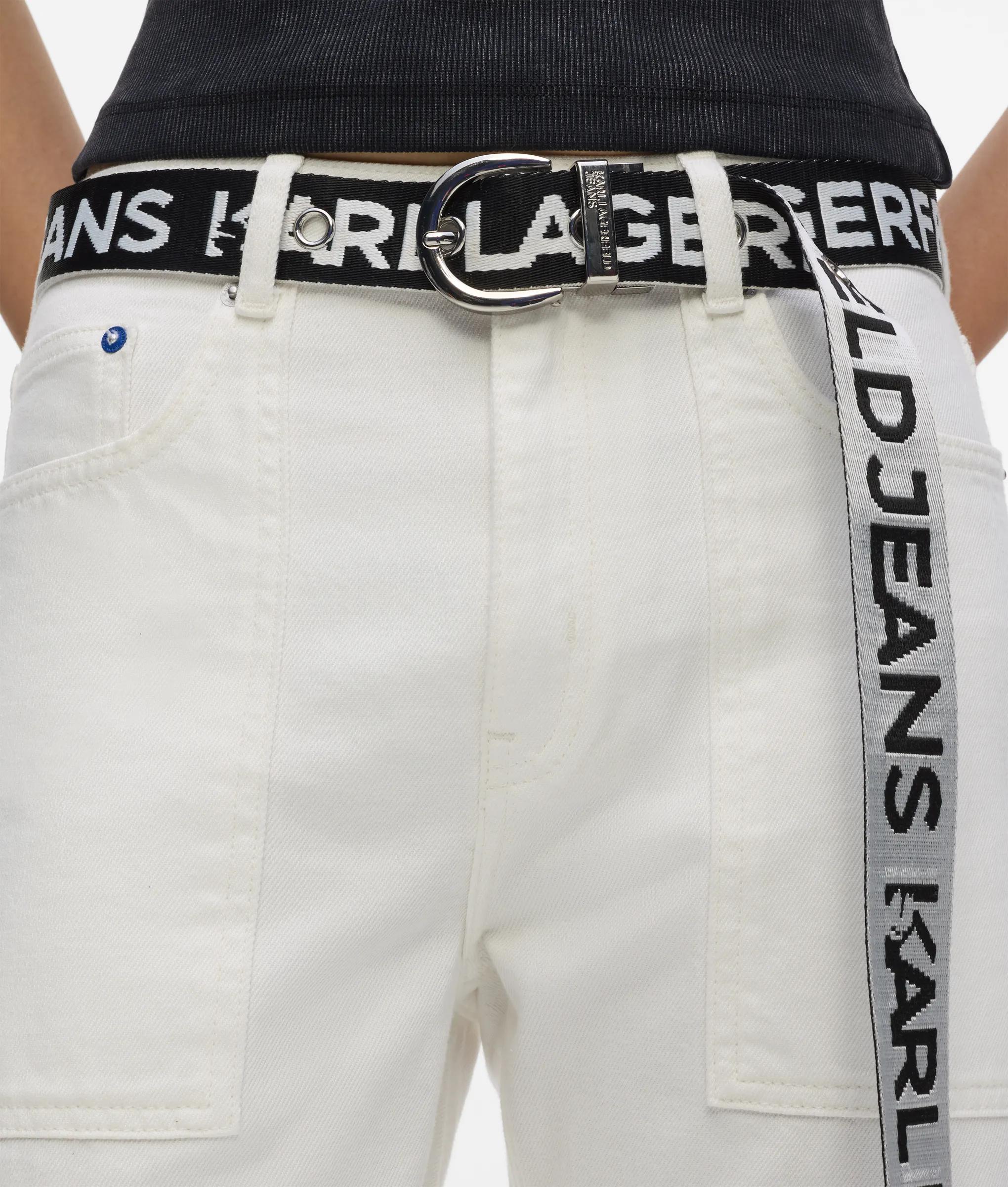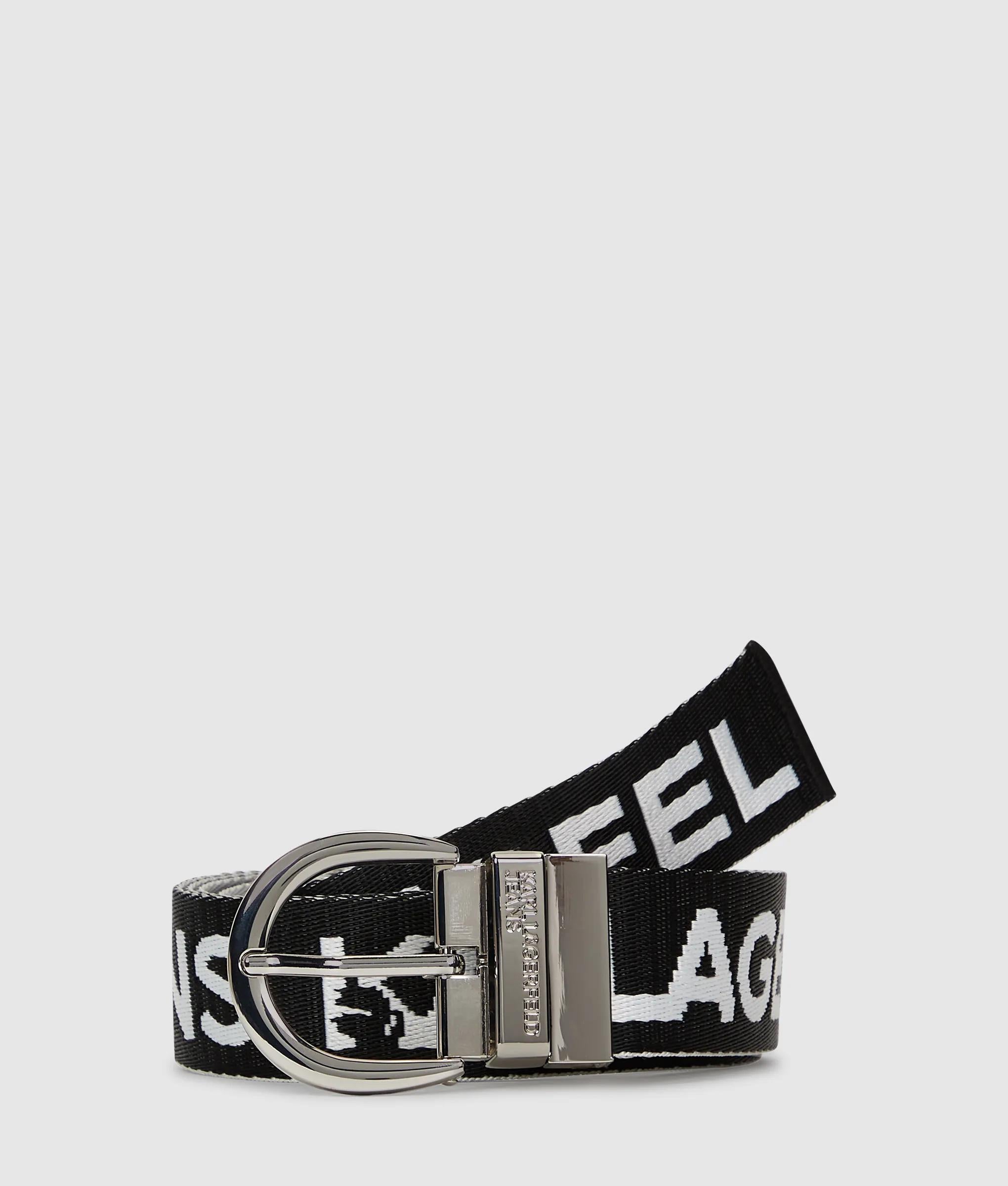 Unlock versatile styling with this two-tone reversible belt. Featuring a rounded metal buckle and bold eyelets, it showcases the KARL LAGERFELD JEANS logo along its length, making it a standout accessory for any outfit.