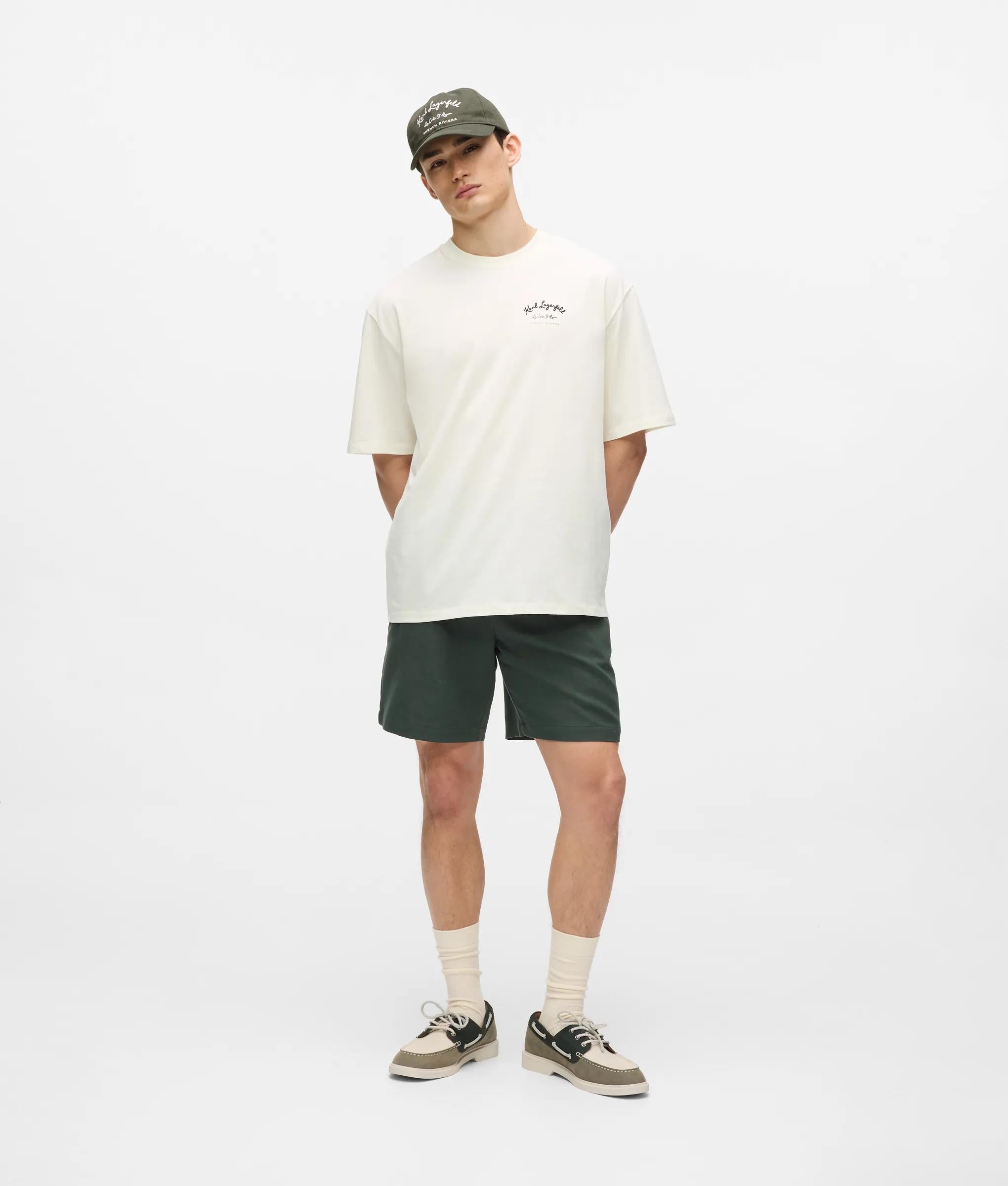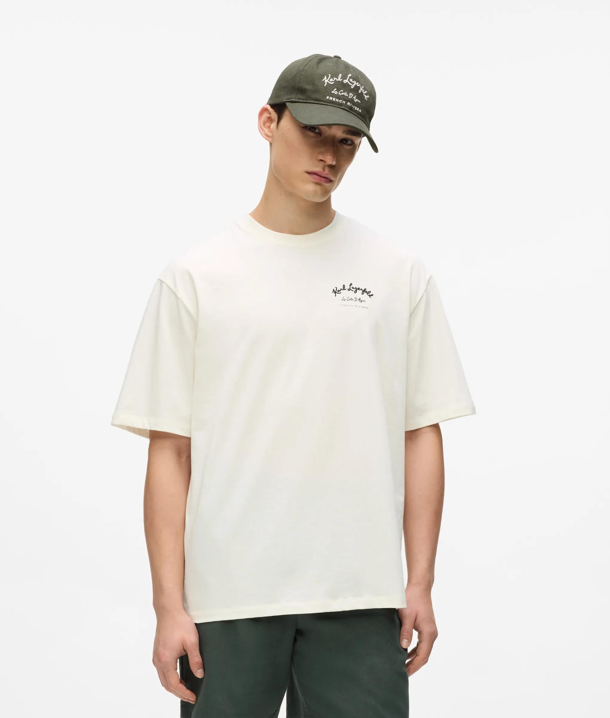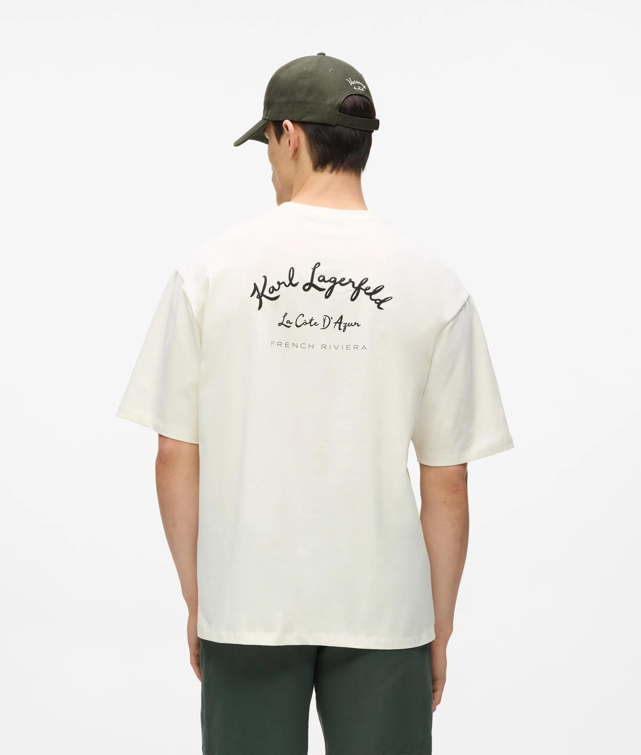 Relaxed T-shirt with Vacances de Karl artwork, crafted in soft organic cotton jersey. Classic crew neck and short sleeves offer comfort and ease. Perfect for casual days or paired with matching shorts.