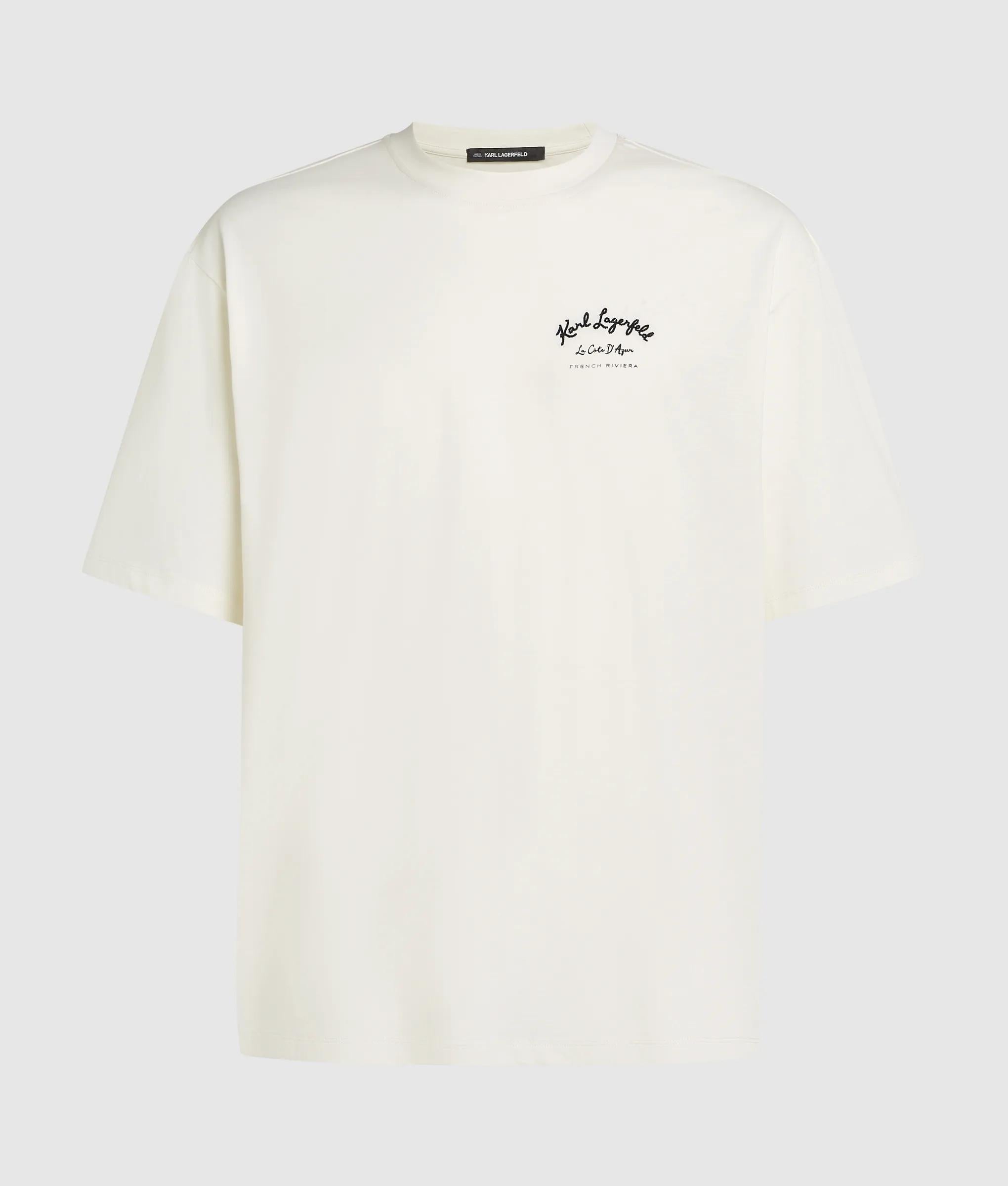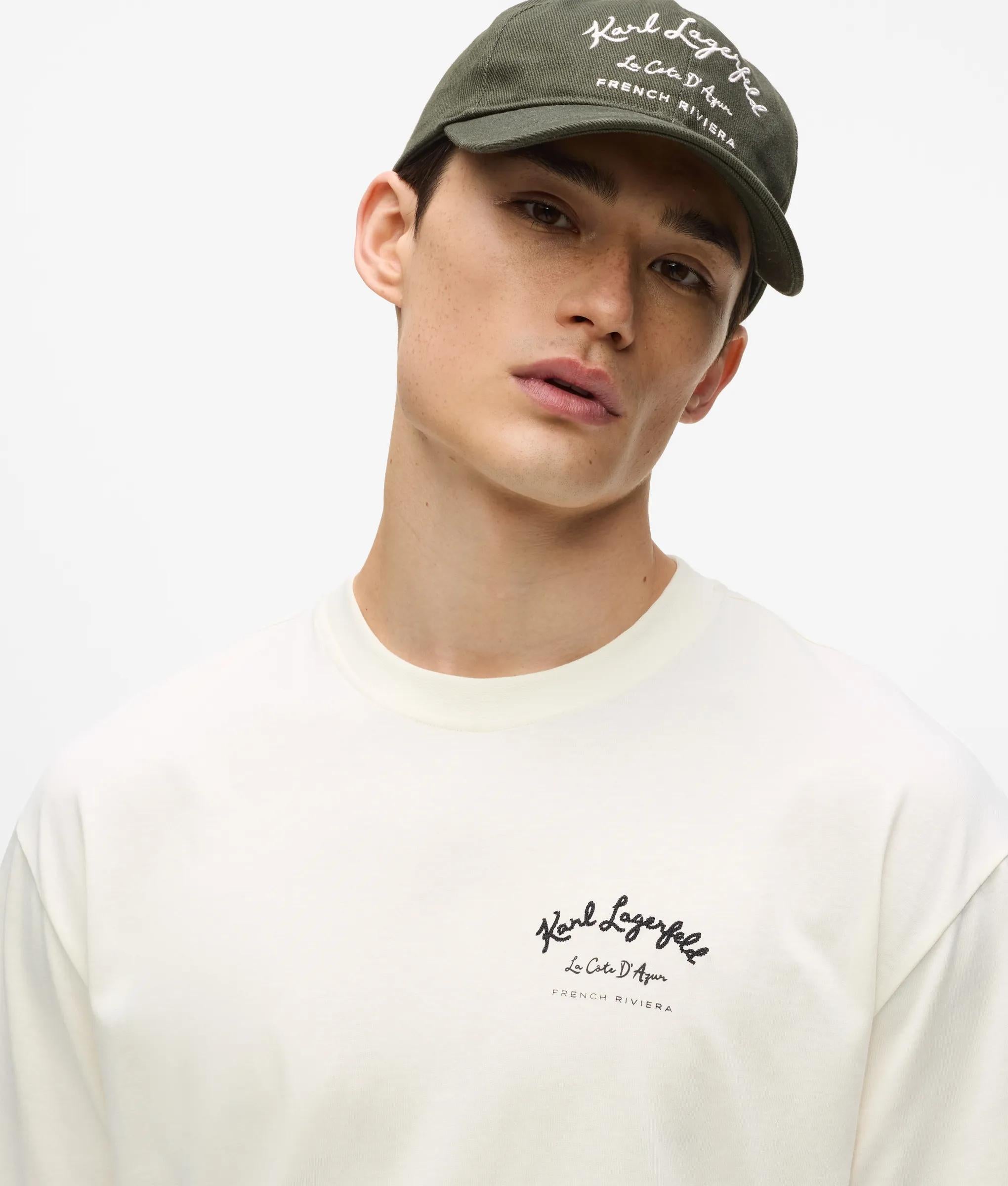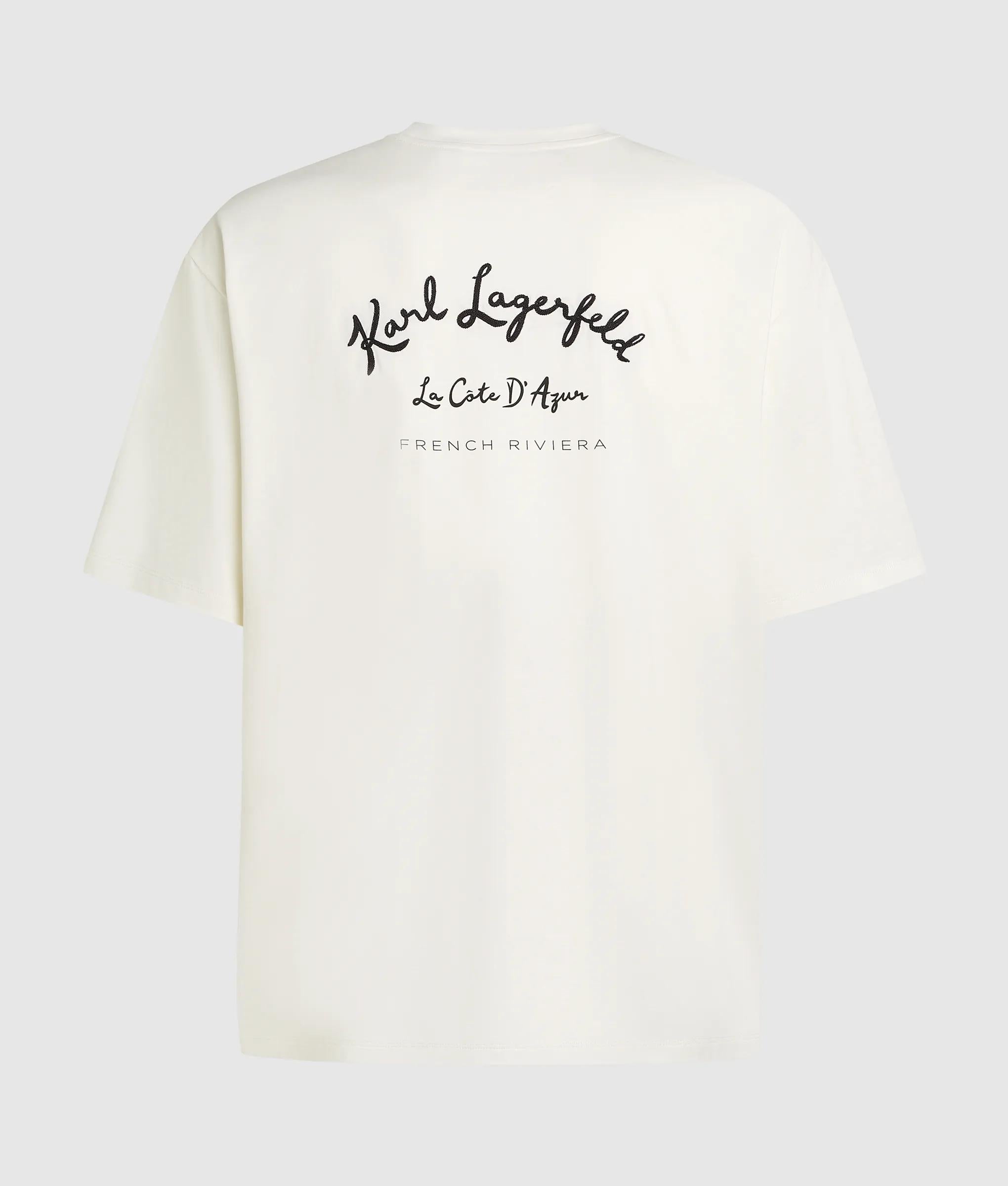 Relaxed T-shirt with Vacances de Karl artwork, crafted in soft organic cotton jersey. Classic crew neck and short sleeves offer comfort and ease. Perfect for casual days or paired with matching shorts.