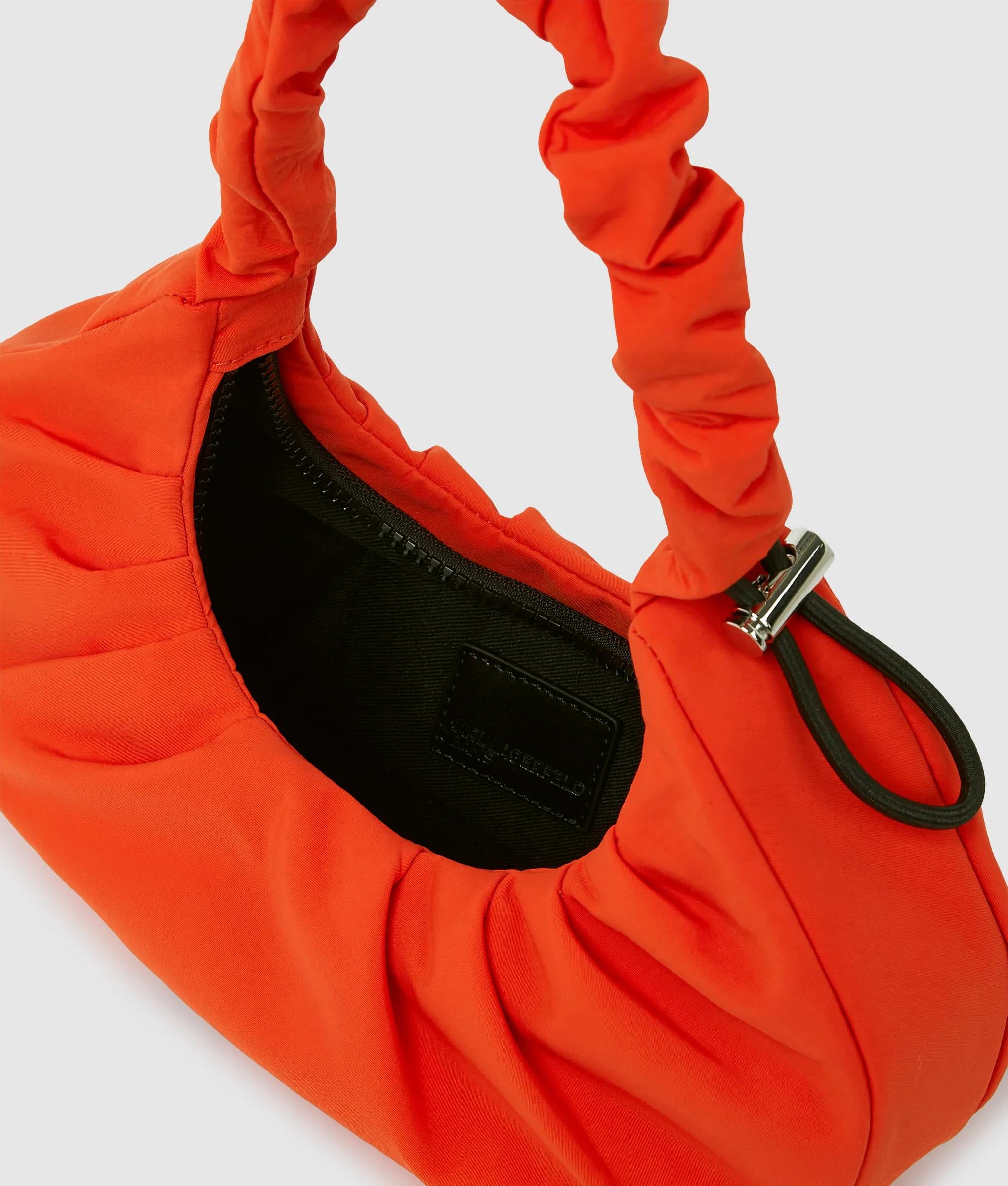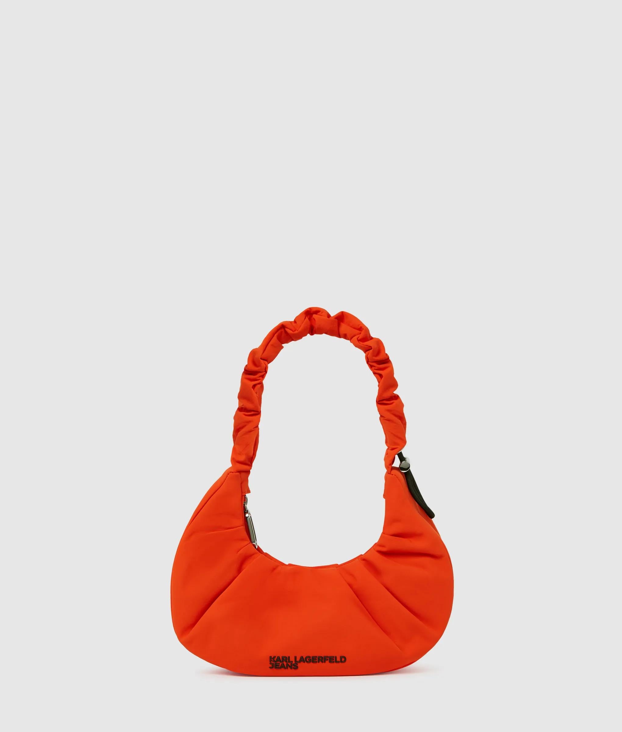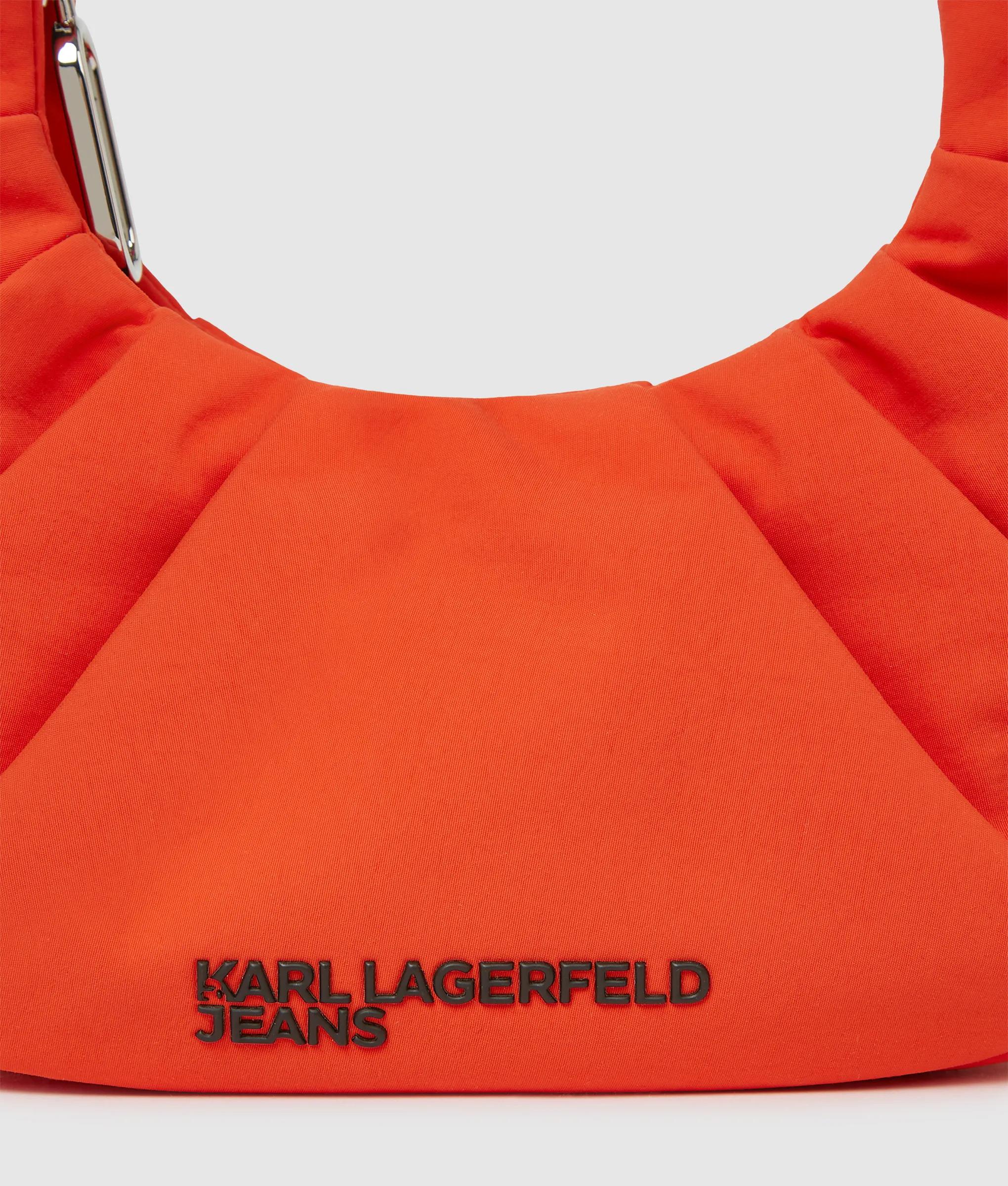 Textured nylon gathers define this small hobo bag, accented by a ruched adjustable strap with urban drawstring and toggle detailing. Topped with a contrasting KARL LAGERFELD JEANS logo.