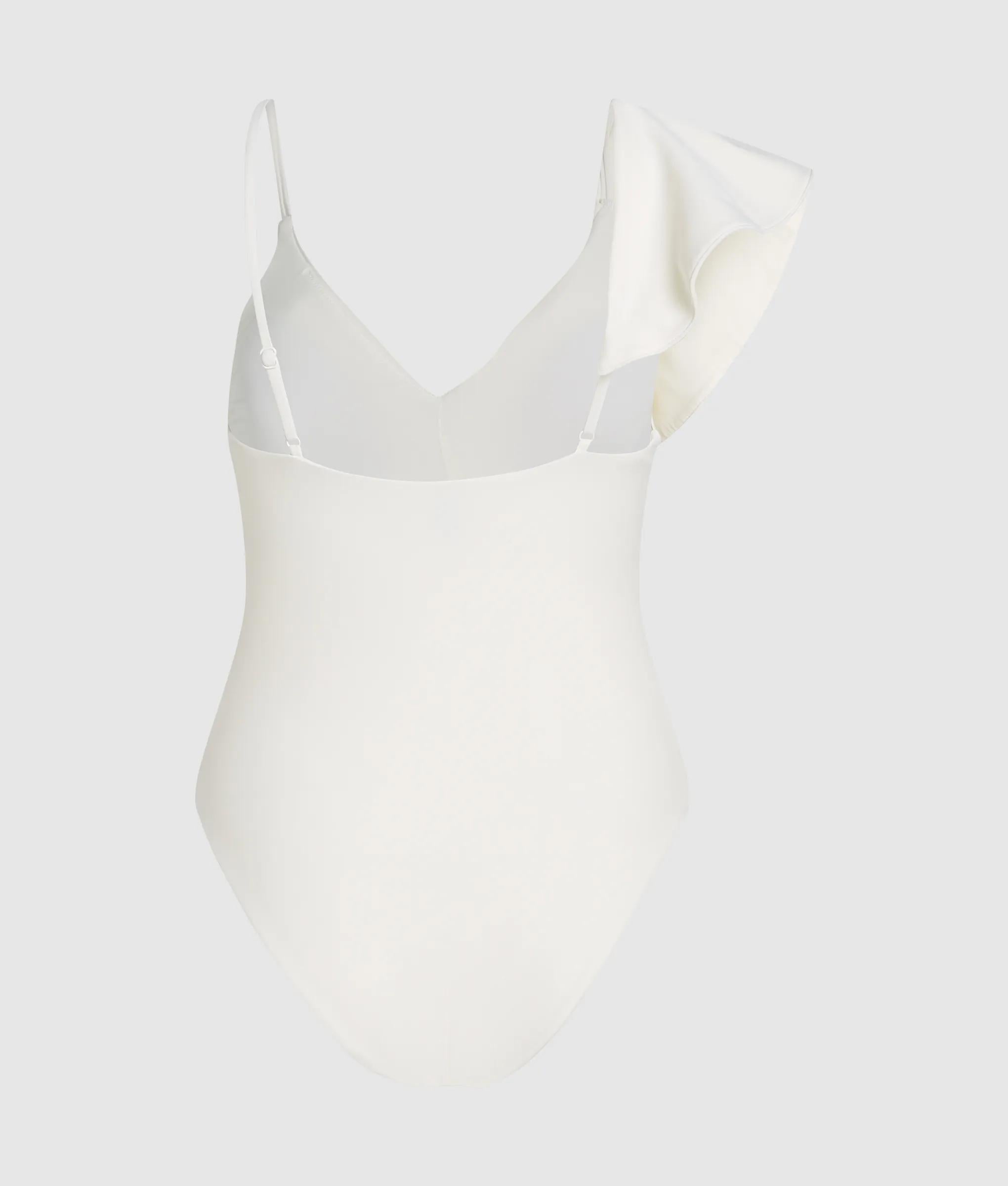 A cascade of oversized ruffles adorns the V-neckline of this elegant swimsuit, blending bold femininity with tailored comfort. Adjustable straps and subtle metal logo charm complete its refined edge.