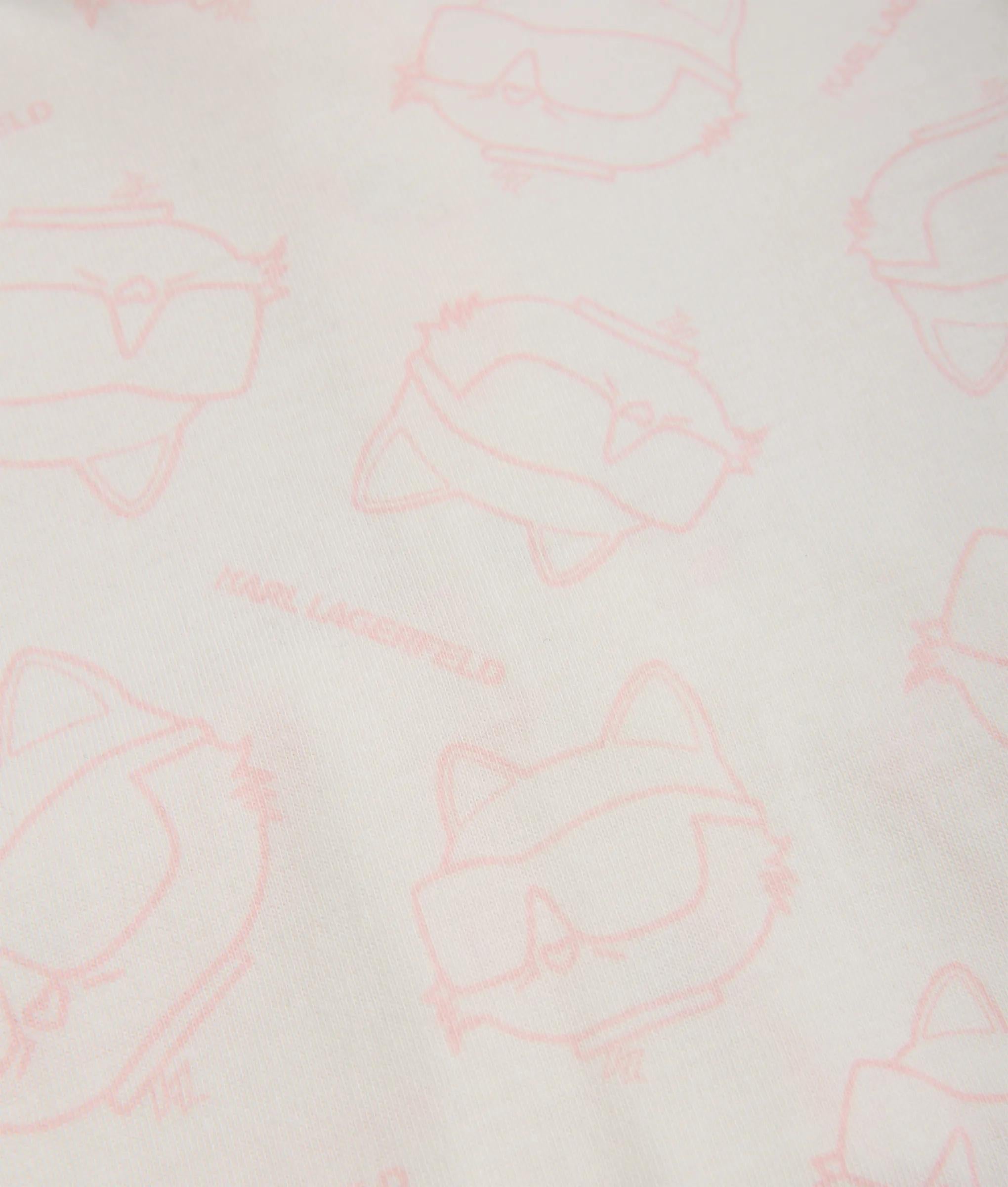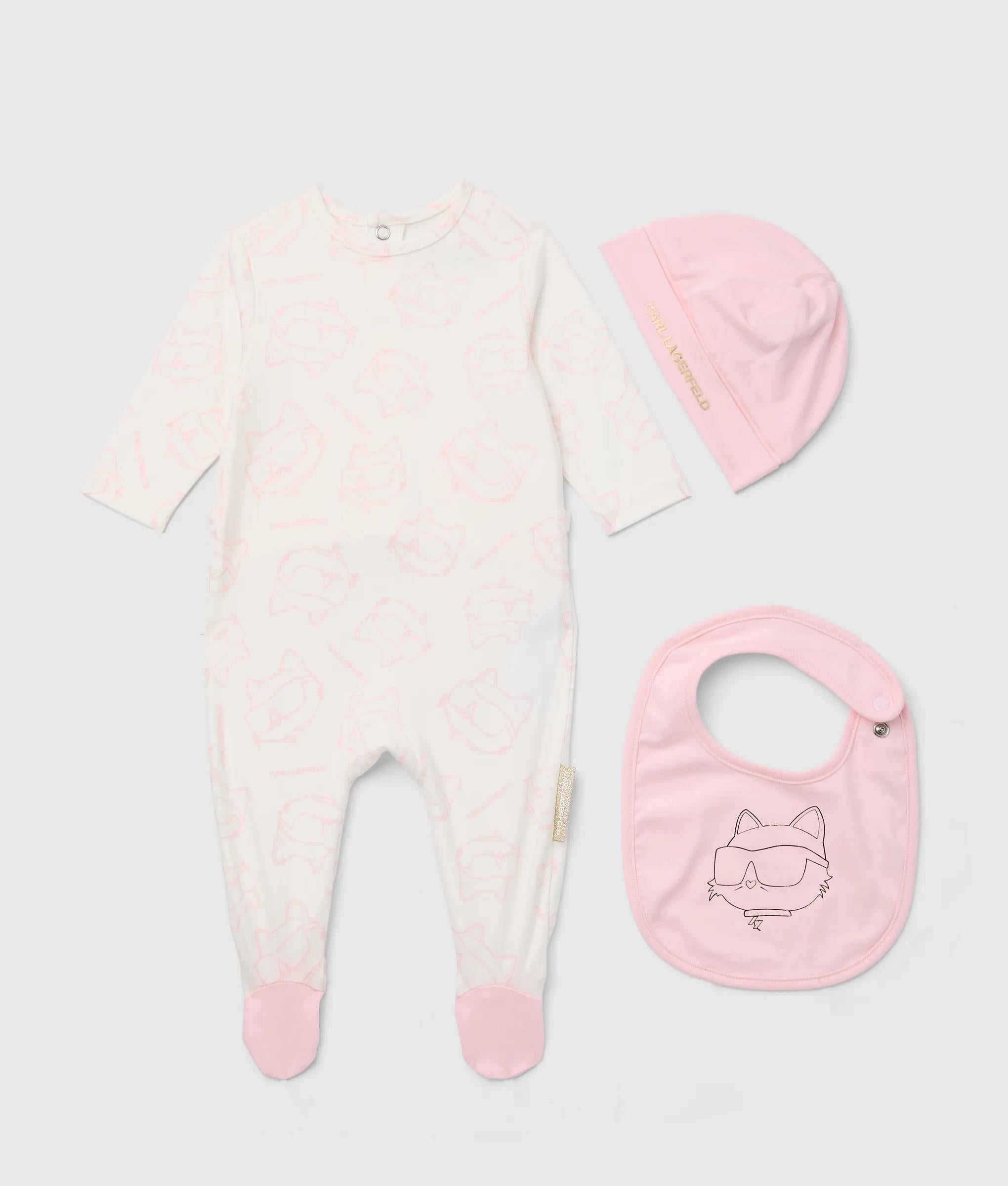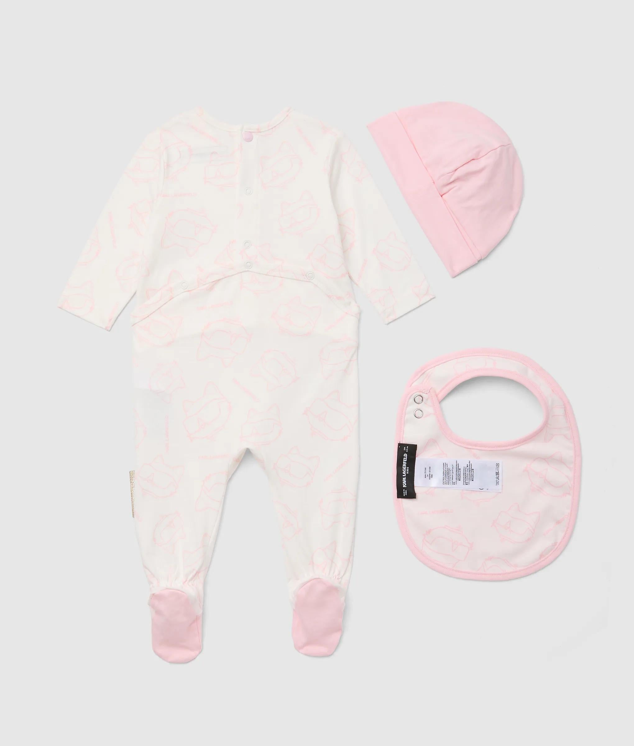 This coordinated set brings iconic KARL LAGERFELD style to newborn essentials. The sleepsuit features all-over Ikon Choupette artwork, matched with a soft hat and a reversible bib.