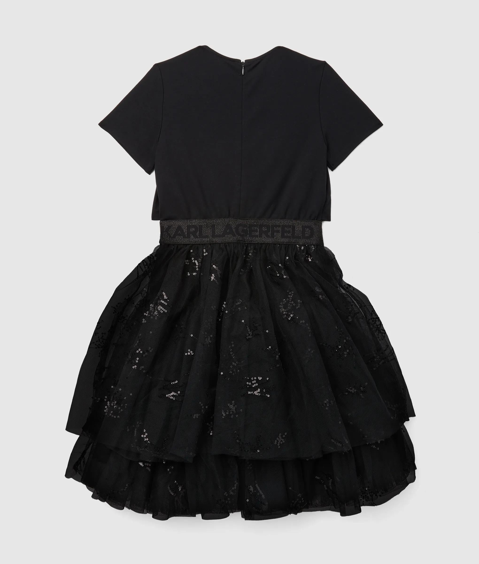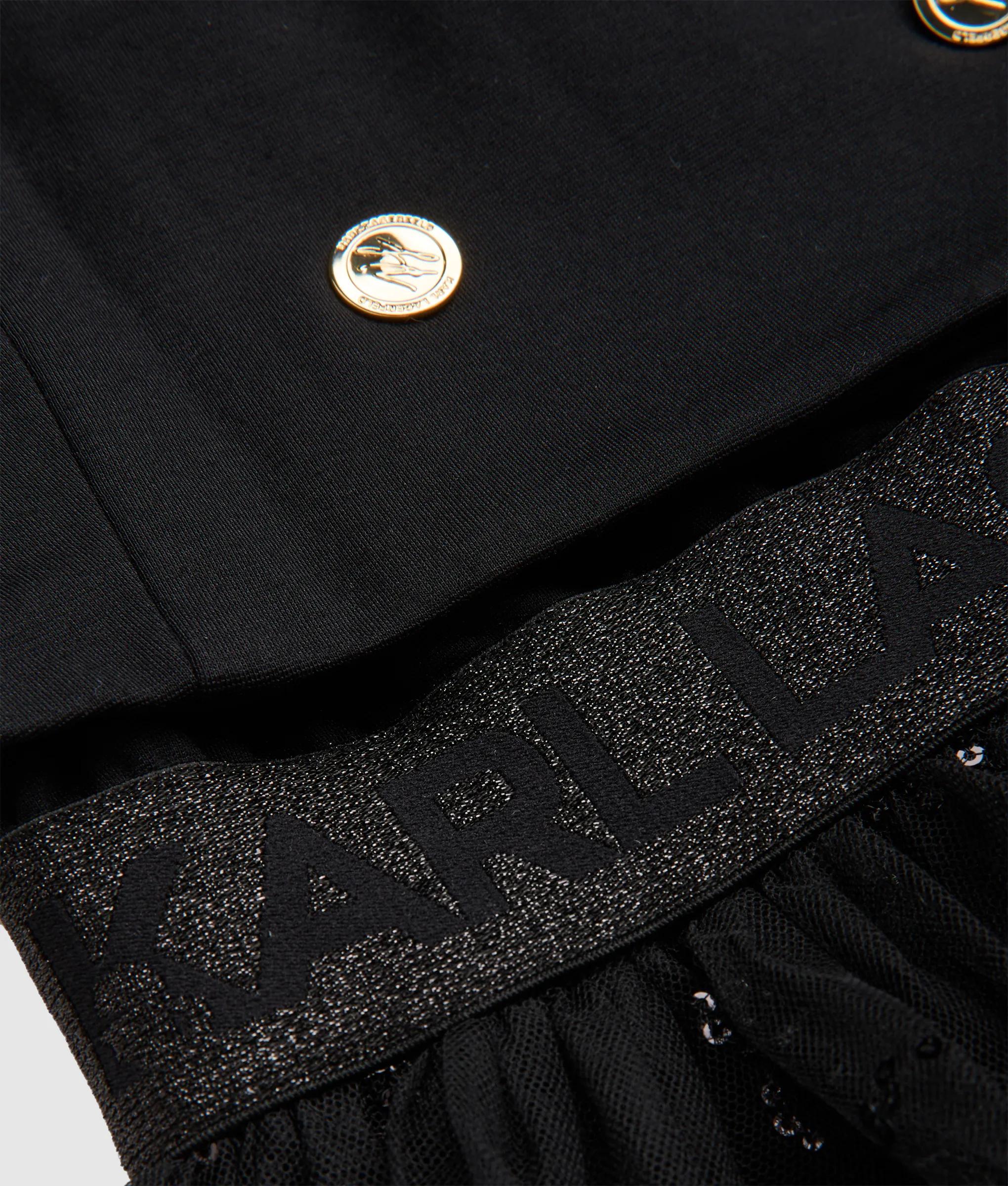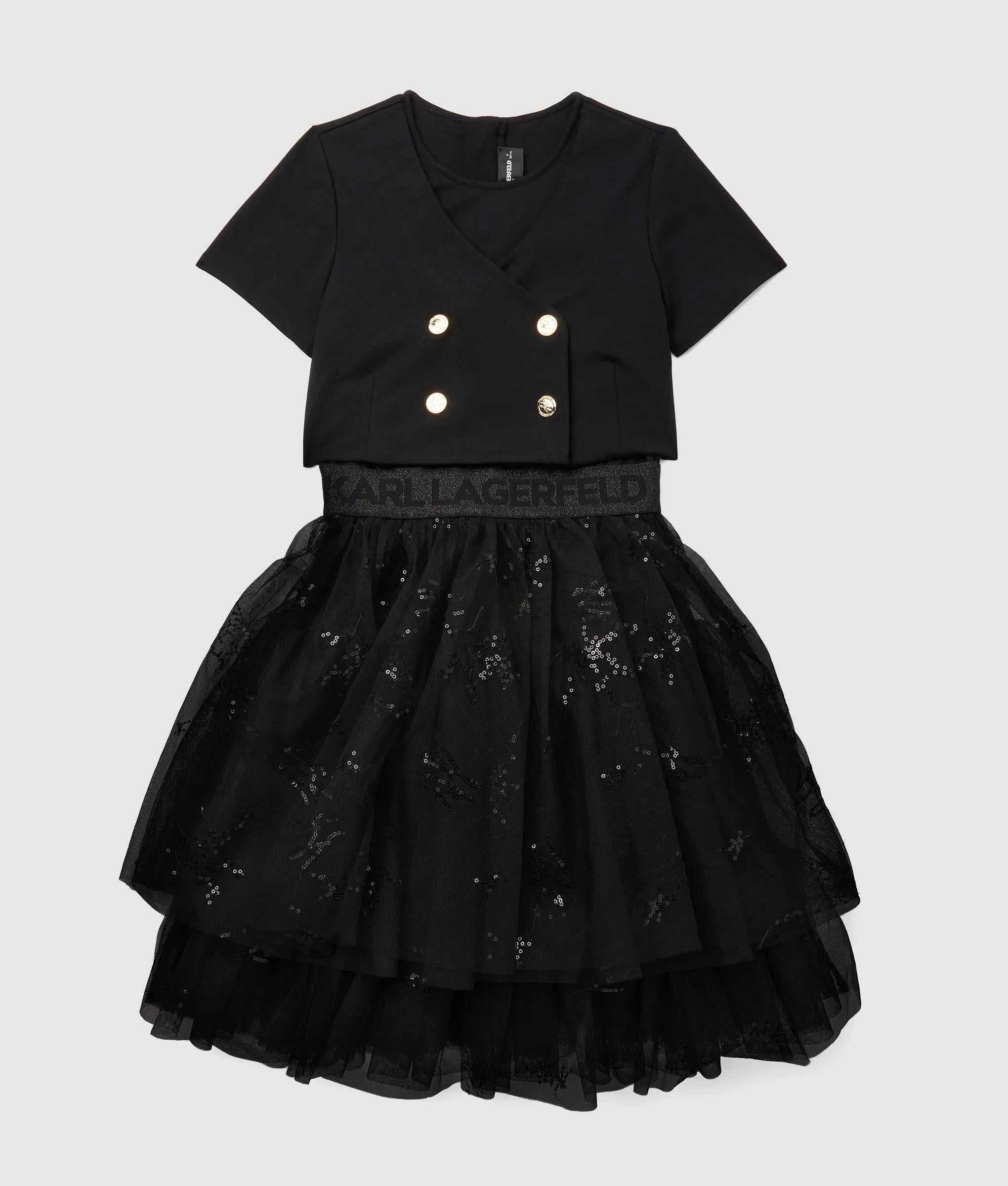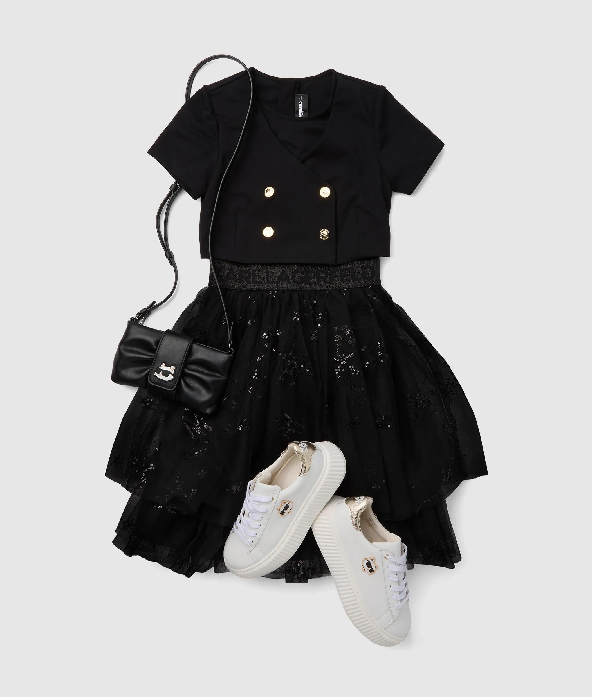 A double-breasted waistcoat meets a voluminous sequin mesh skirt in this playful dress. Sequin embellishment and a logo-adorned waistband bring chic flair to special occasions.