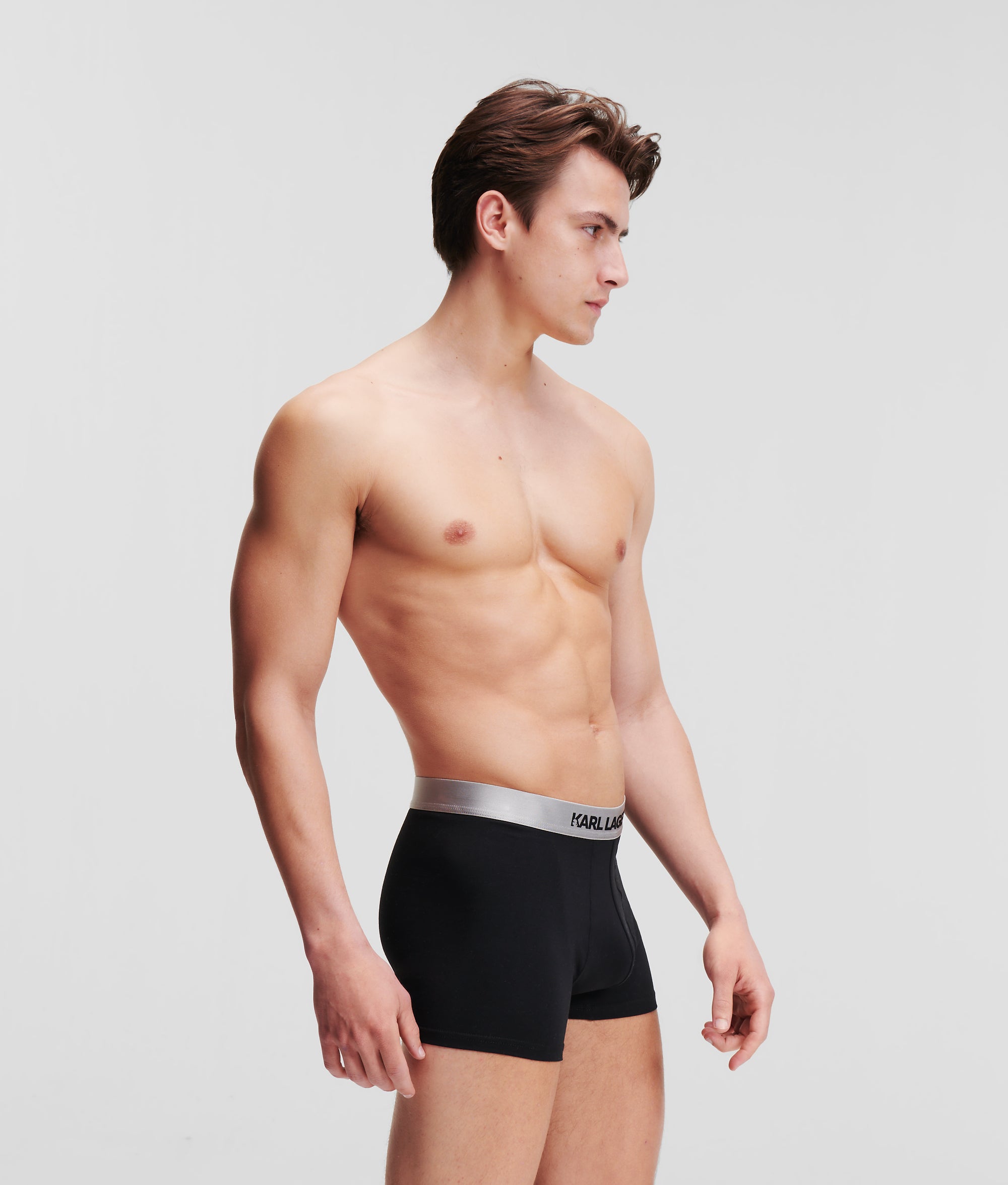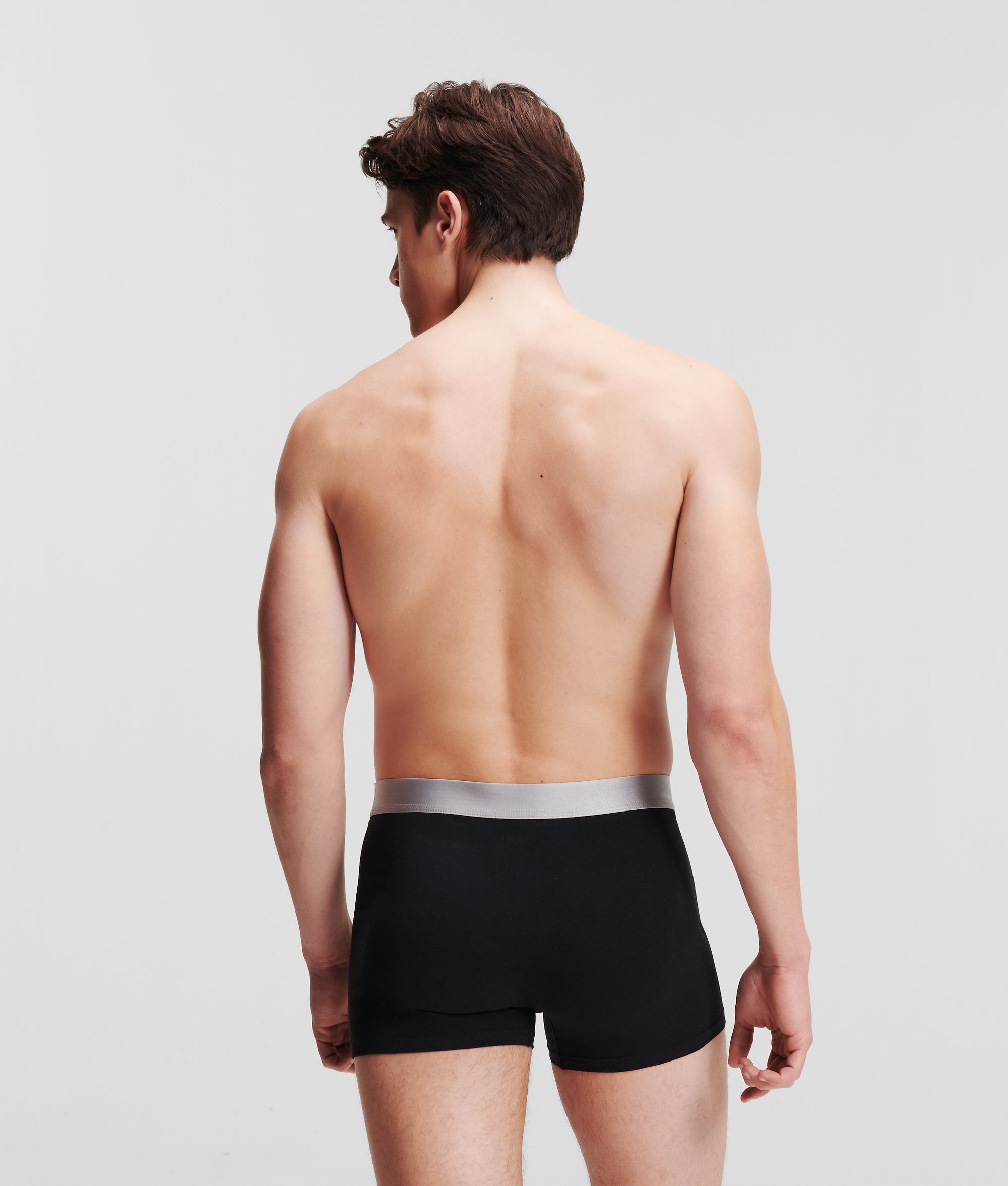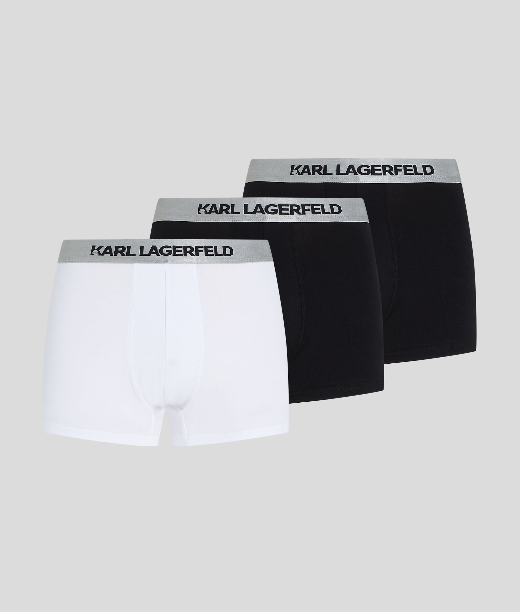 A set of three organic cotton trunks, featuring a metallic waistband adorned with unmissable KARL artwork. The elevated style combines superior support with contemporary design, creating an essential base for every look.