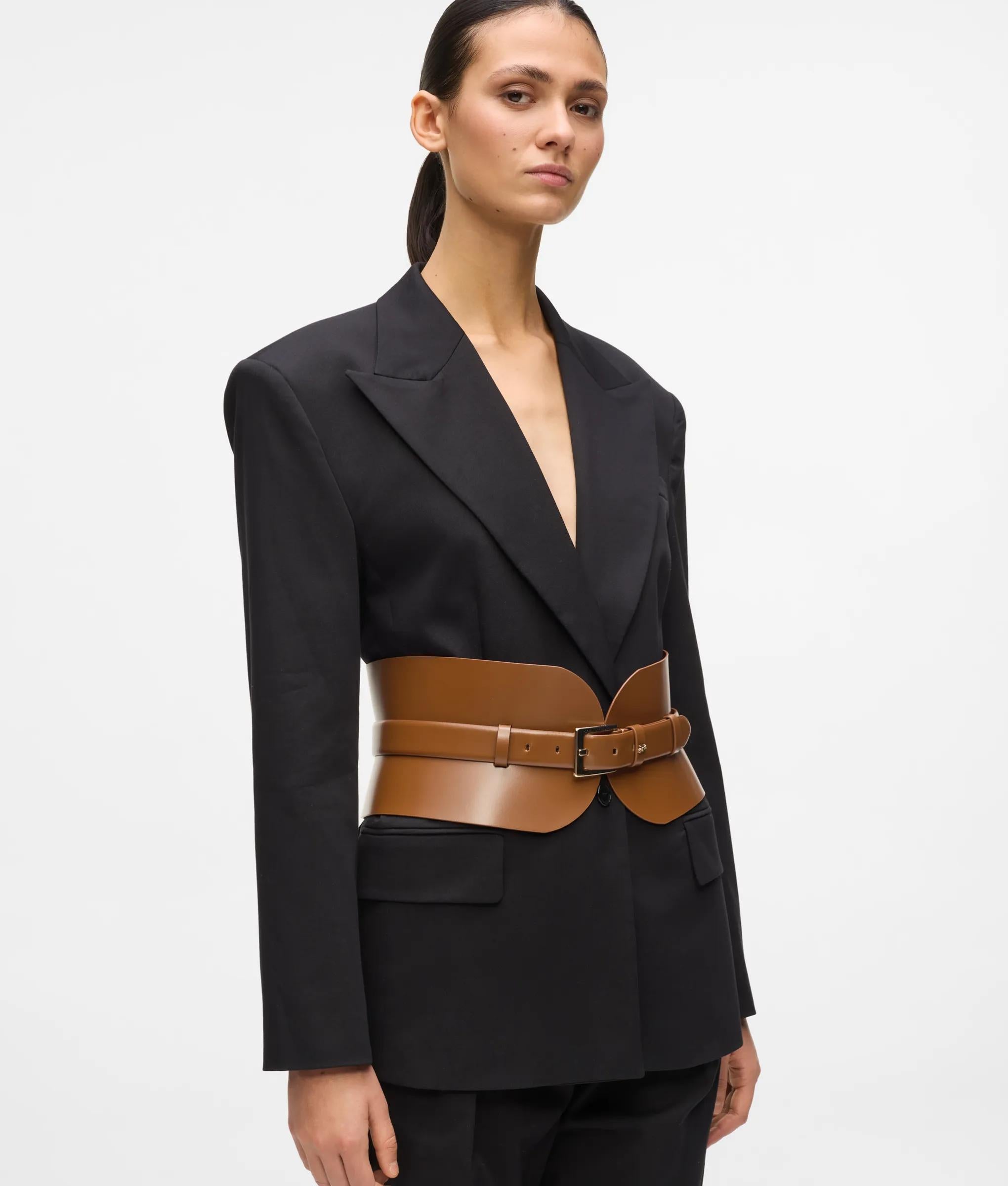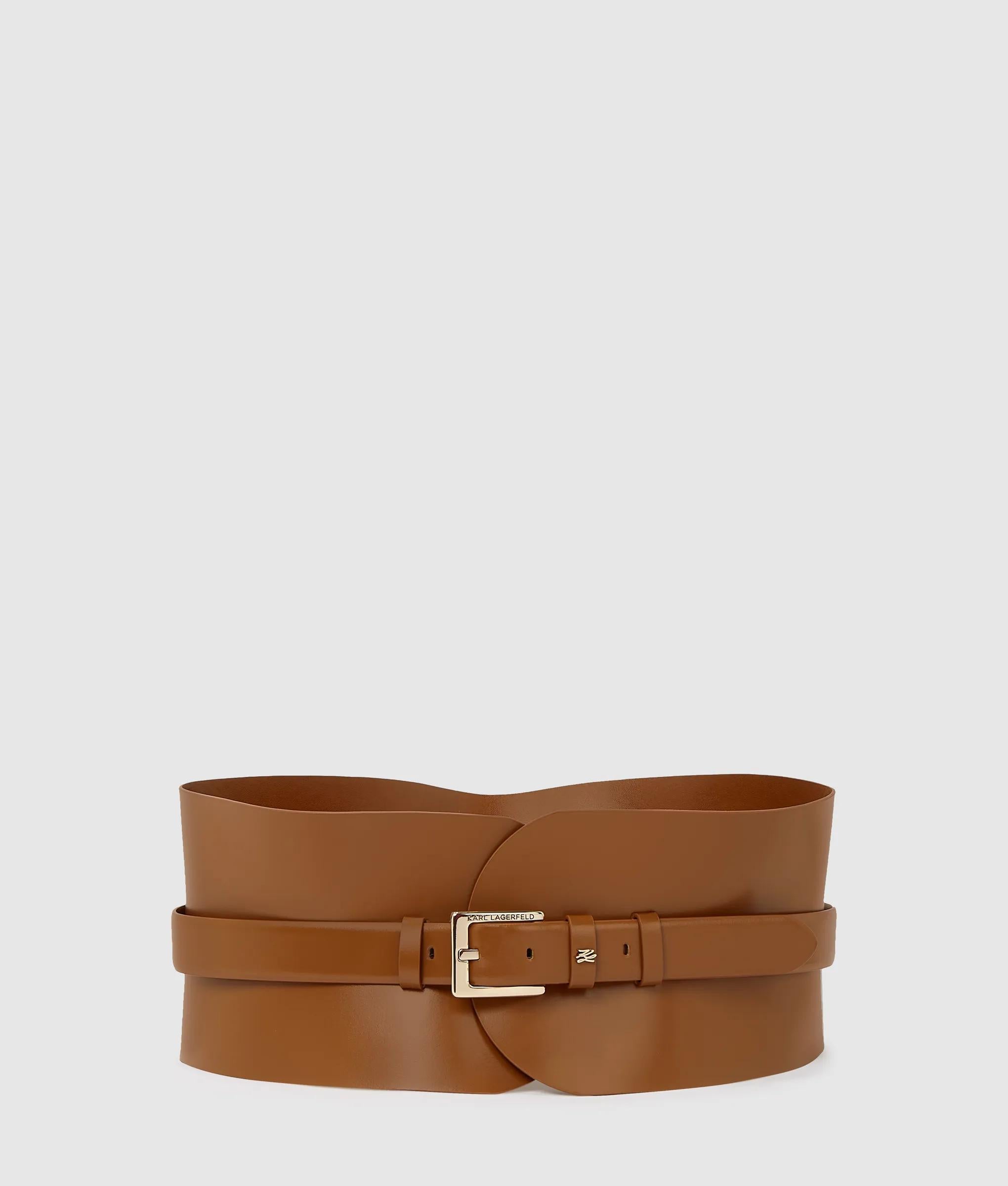 A deep, corset-inspired waistbelt adds an element of timeless sophistication to any outfit. The KARL LAGERFELD-branded buckle closure ensures a secure and personalized fit, perfect for accentuating dresses and accessorizing oversized shirts.