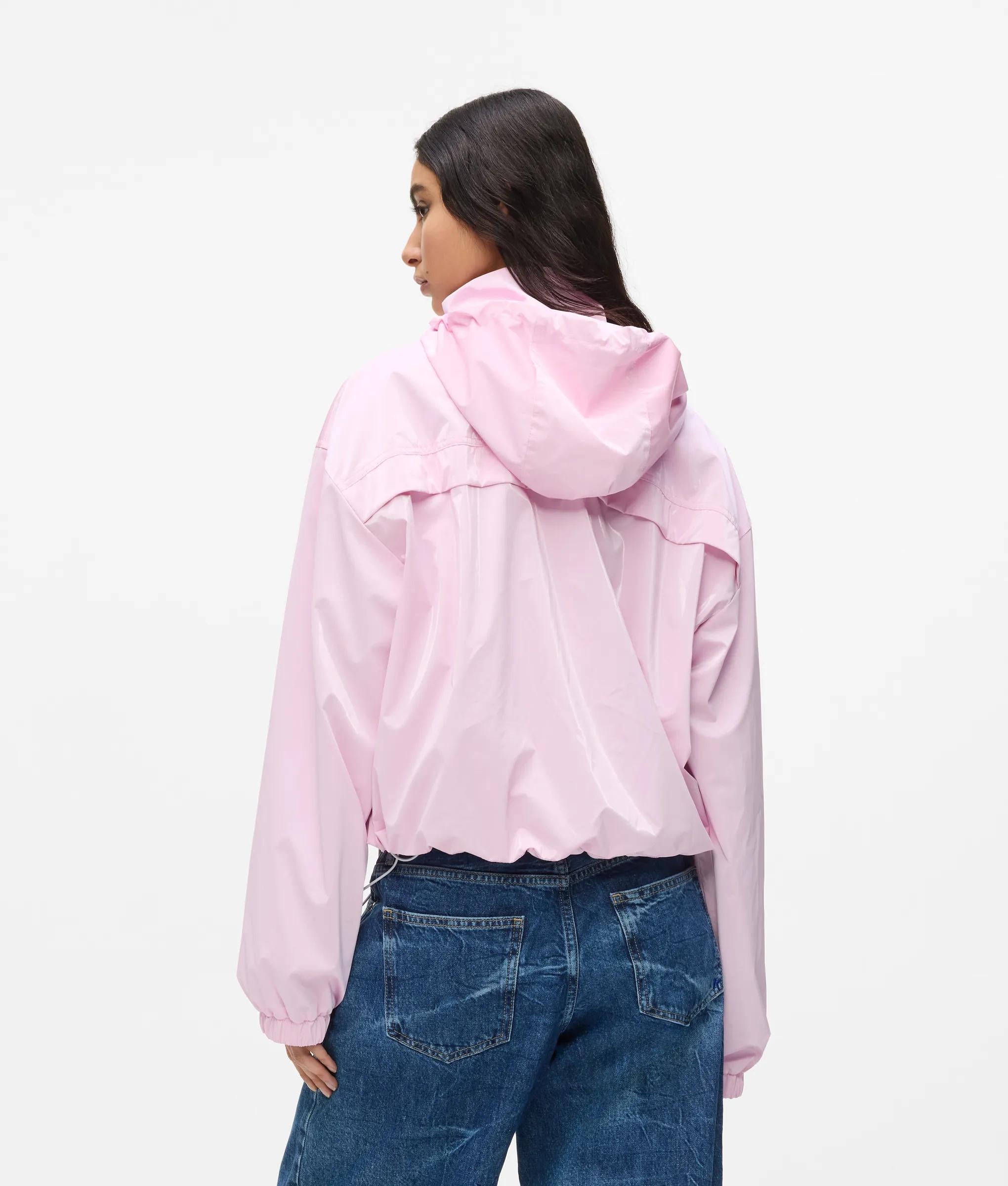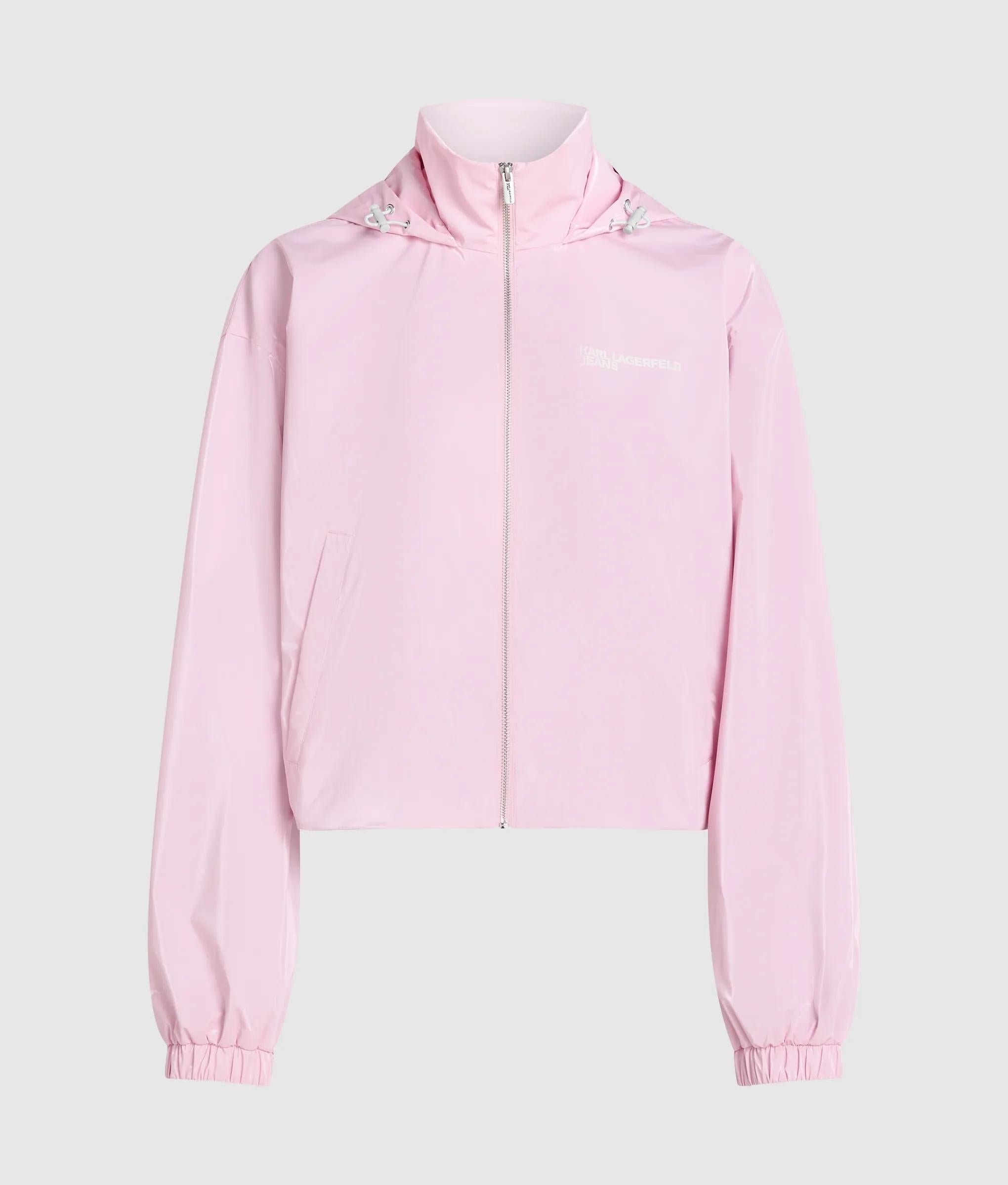 Bold, sleek, and unapologetically KARL LAGERFELD JEANS. Made from a glossy polyester-blend, this zip-up jacket takes a track-inspired silhouette and transforms it with a glossy finish.