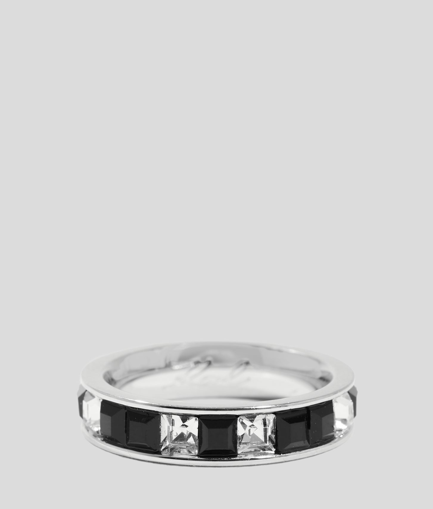 Embrace a striking blend of elegance and edge with this polished silver-toned ring. Adorned with black square-cut stones and sparkling crystals, it showcases a unique KARL signature engraving inside.