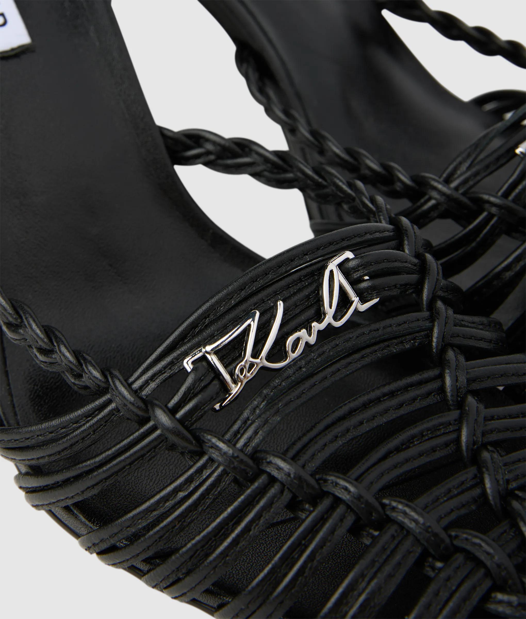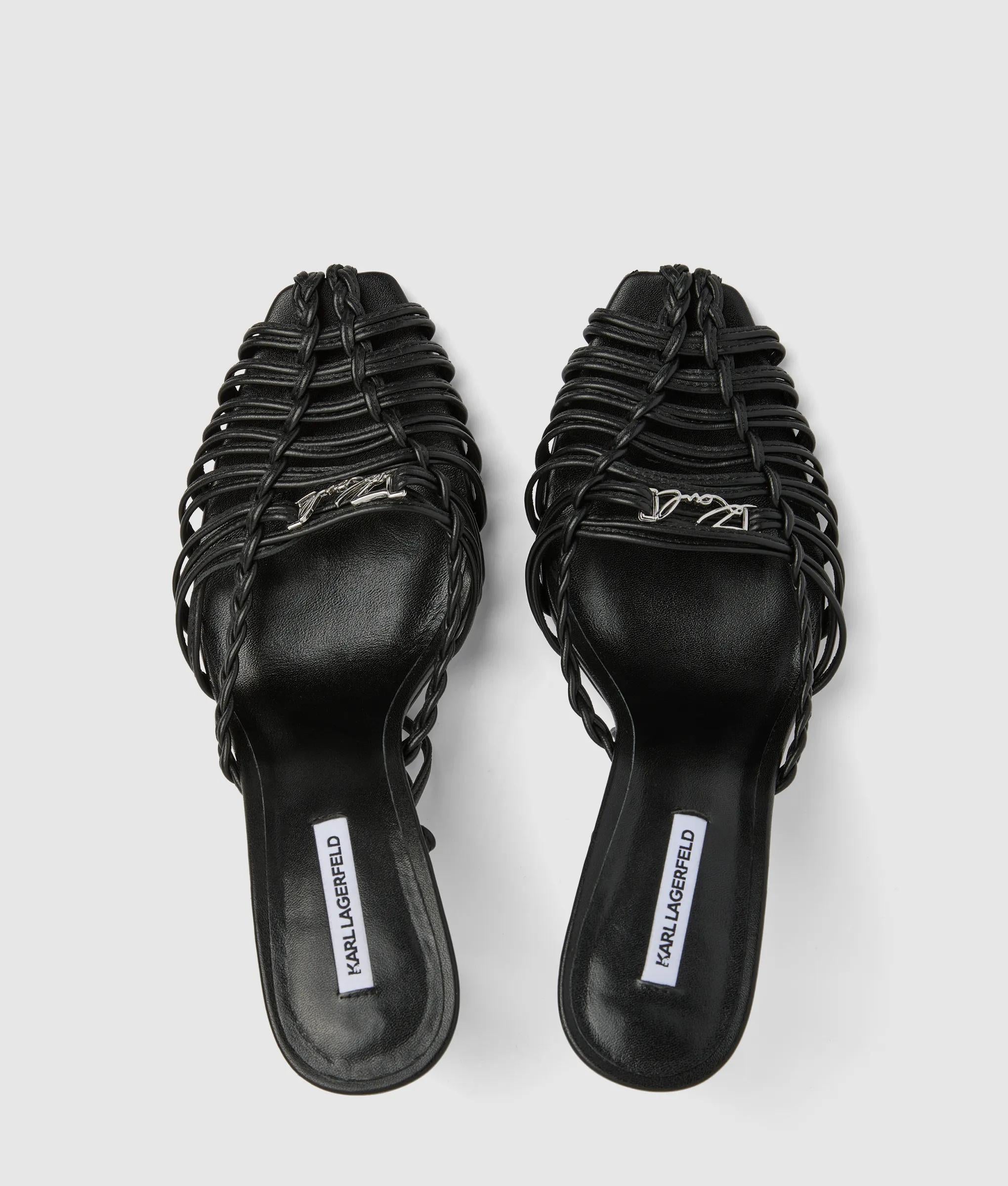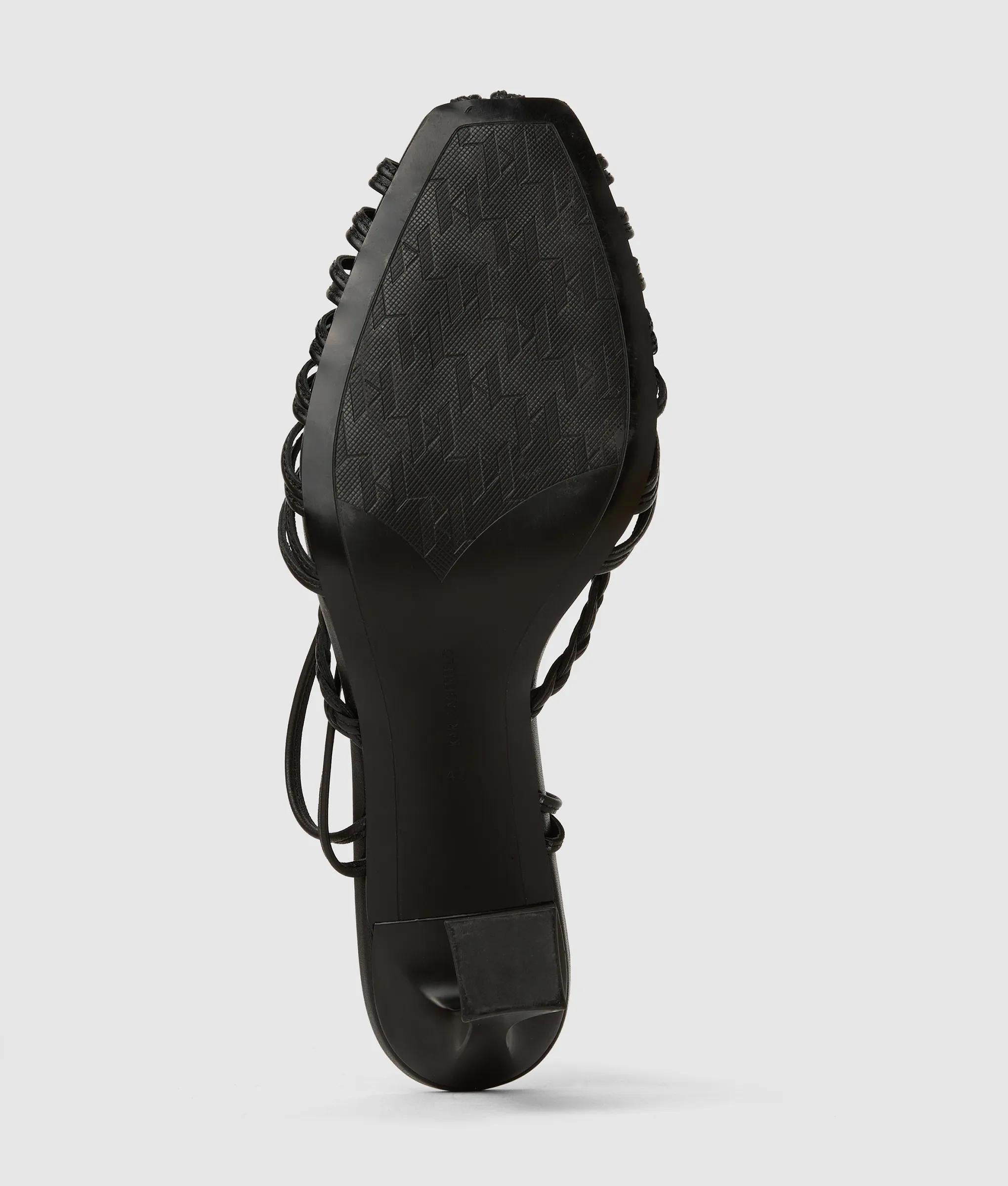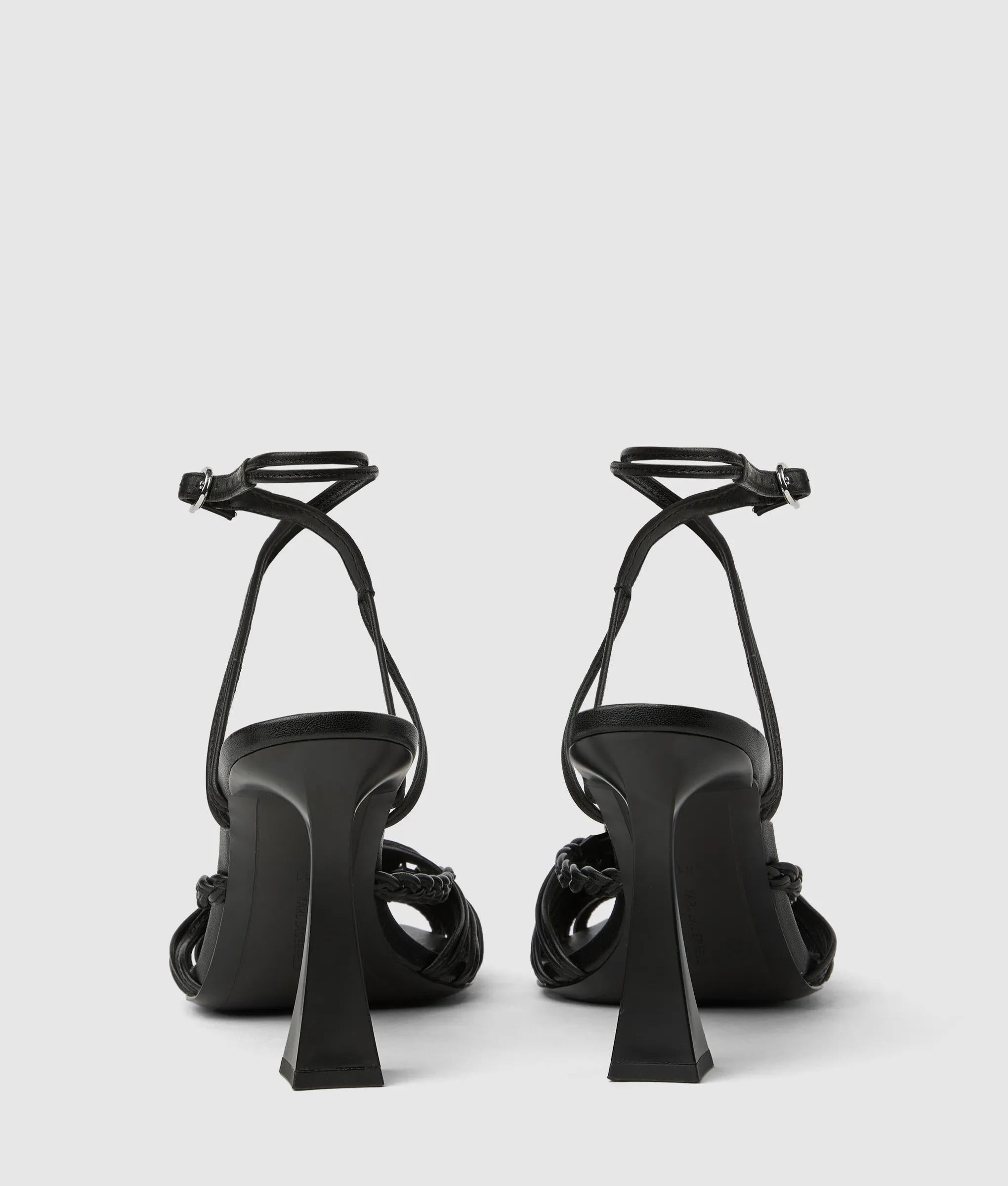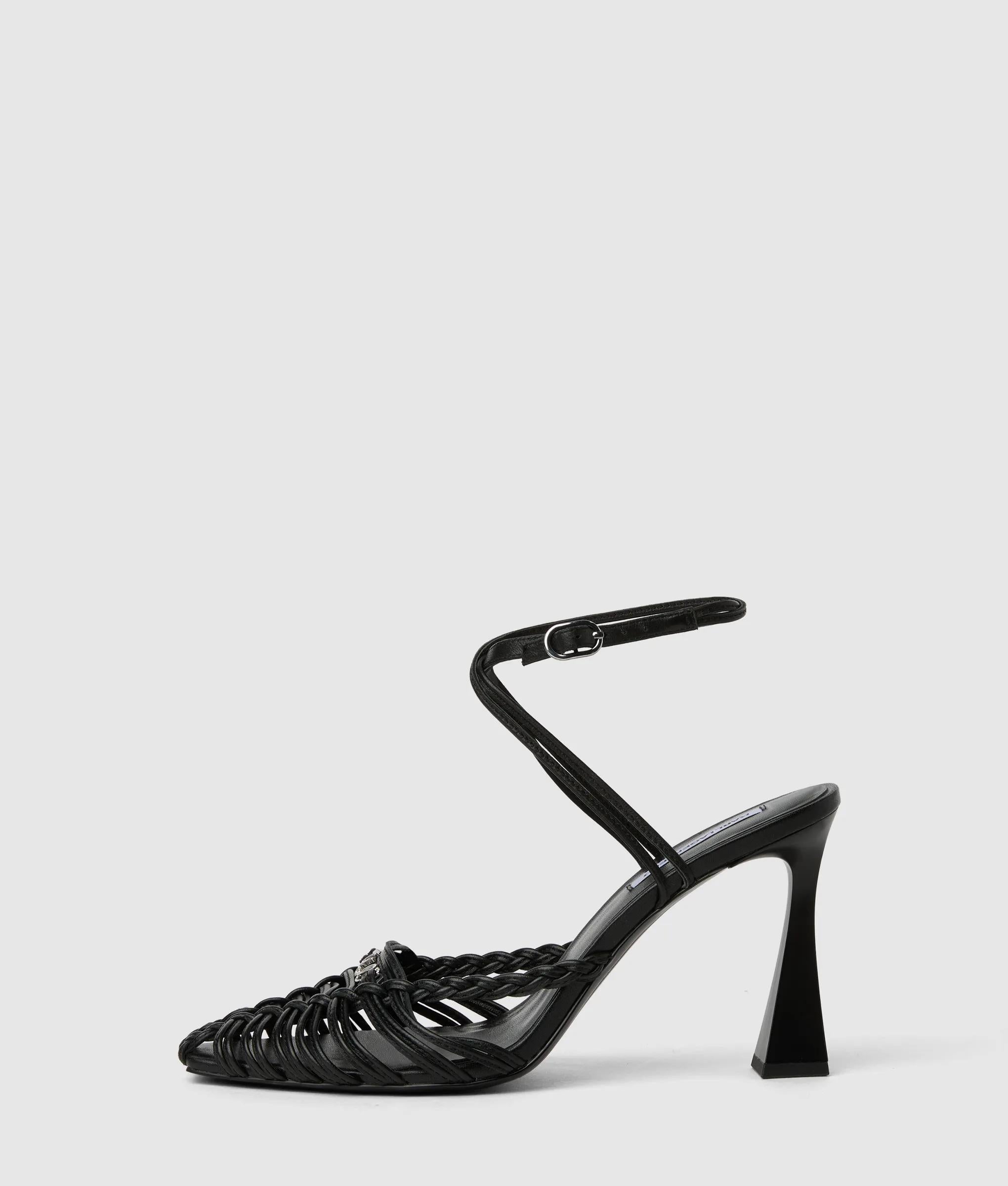 An artful play of intricate leather straps and a bold, angled heel define these elegant sandals. The slip-on design with an adjustable buckle at the ankle promises confidence with every step.