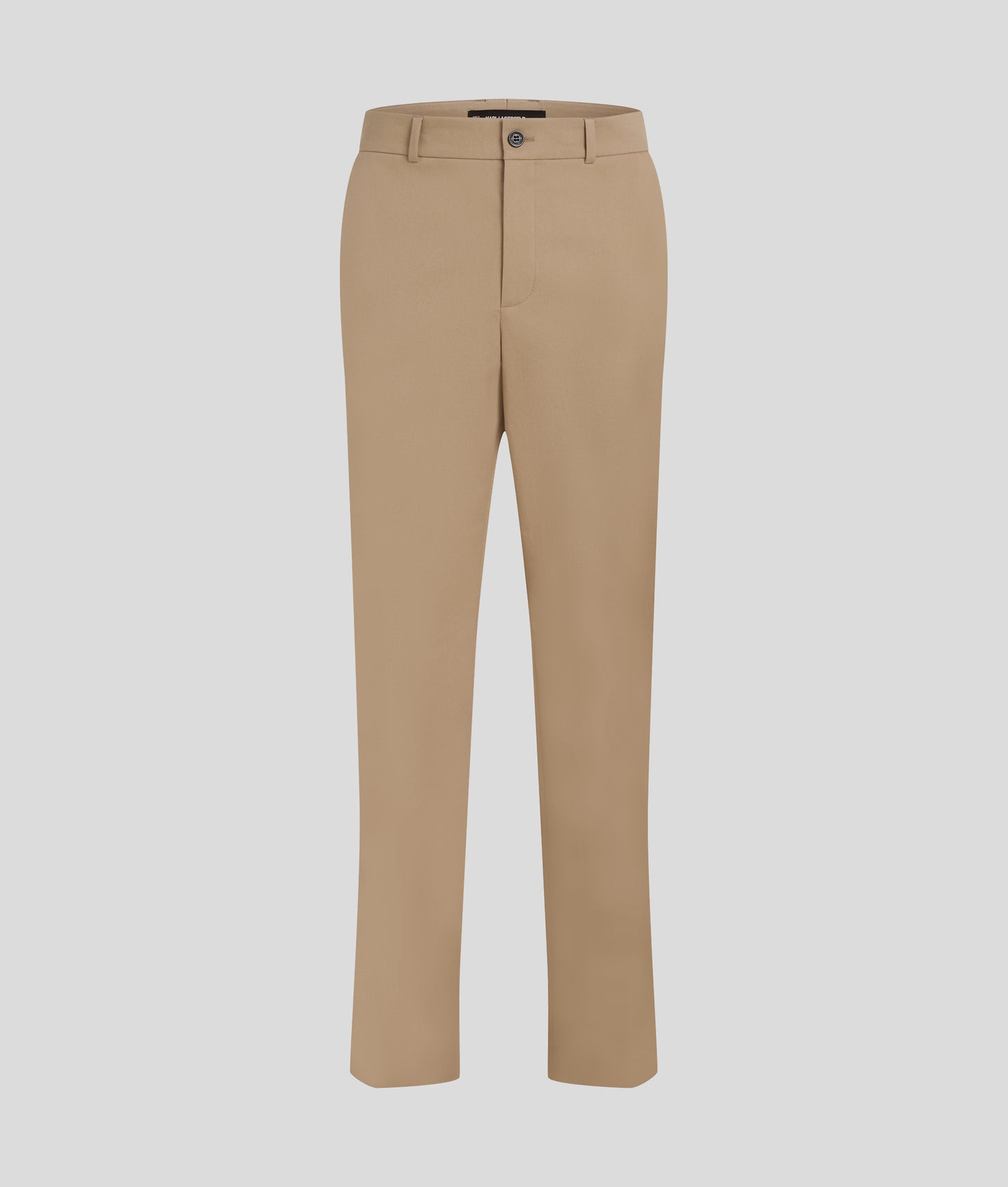 These chino pants offer a modern twist on classic silhouette, featuring a branded button and zip-fly closure for effortless wear. Hip and back pockets enhance functionality, while a woven KARL LAGERFELD label adds an iconic touch. Pair with the matching jacket for a fresh, laid-back look.