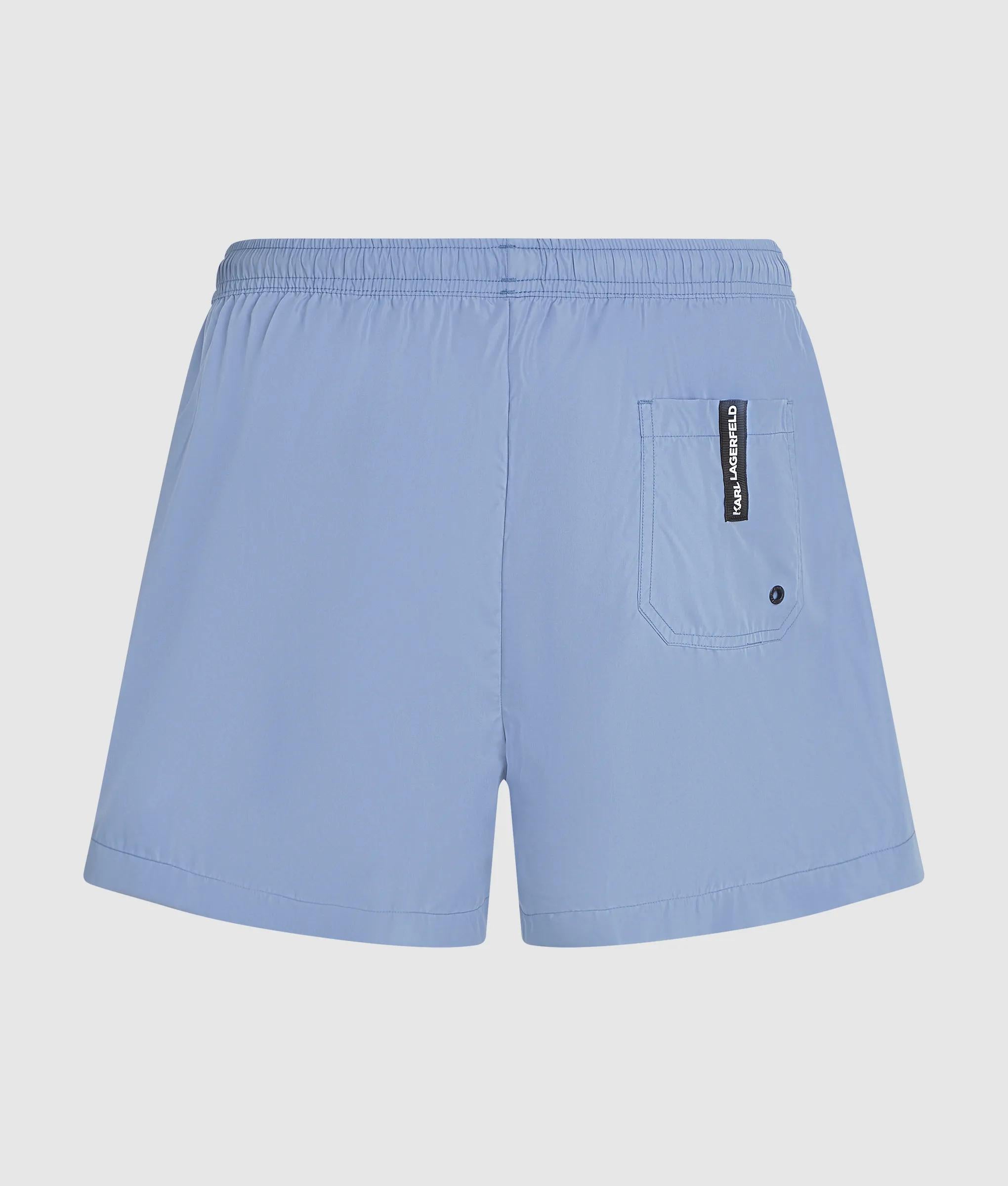Crafted from woven polyester, these KARL LAGERFELD boardshorts feature a drawstring waist for a personalized fit, inner mesh support, and multiple pockets, accented by a prominent KARL logo on the left leg.