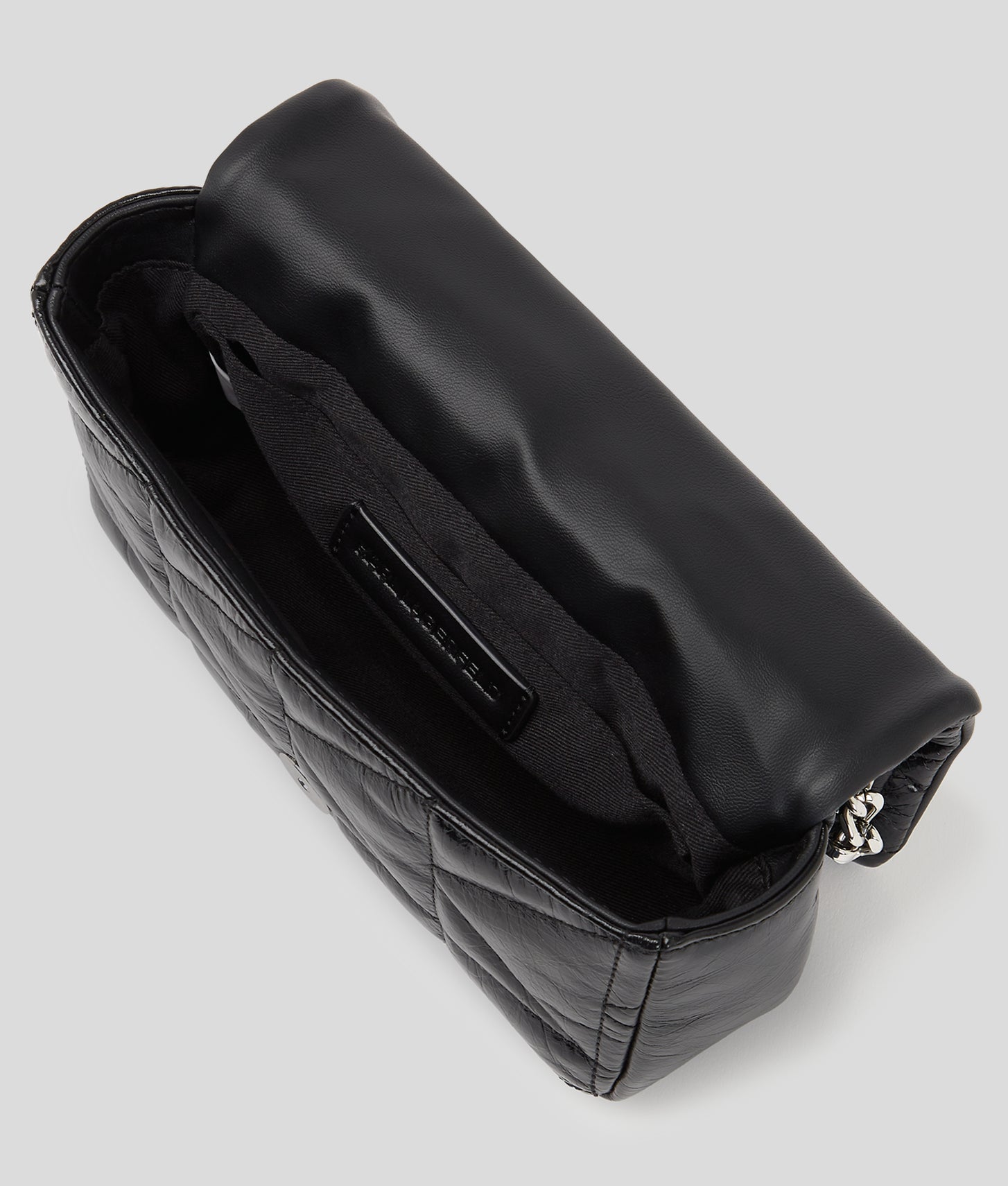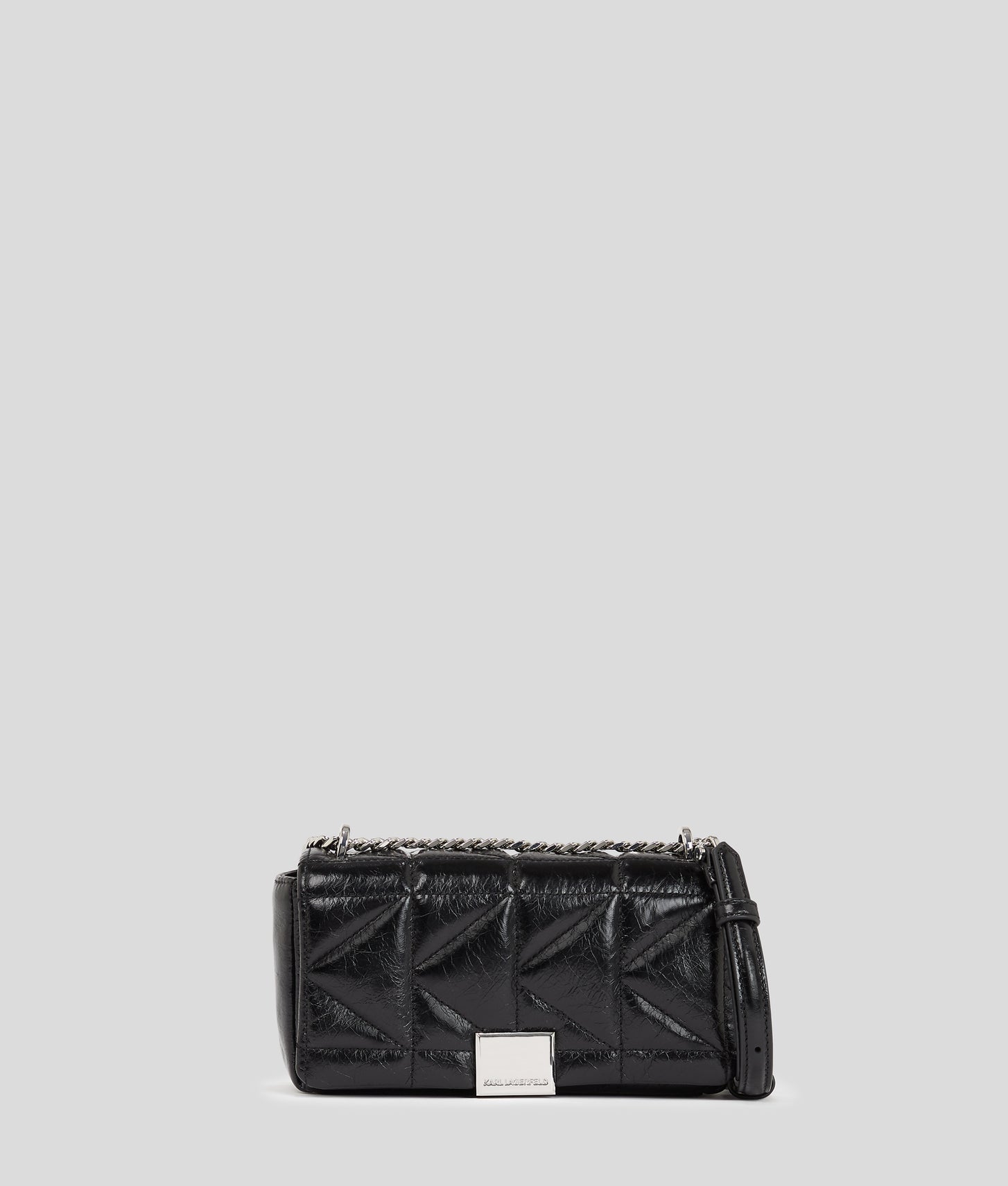 This small crossbody bag showcases a high-shine quilted design, merging elegance with practicality. A secure push-lock closure and a rock-chic leather and chain strap elevate everyday looks, while a KARL LAGERFELD plaque adds a touch of luxury. Embellished with quilted details and plush texture, the trademark 'K' stitching adds a unique dimension to this modern classic