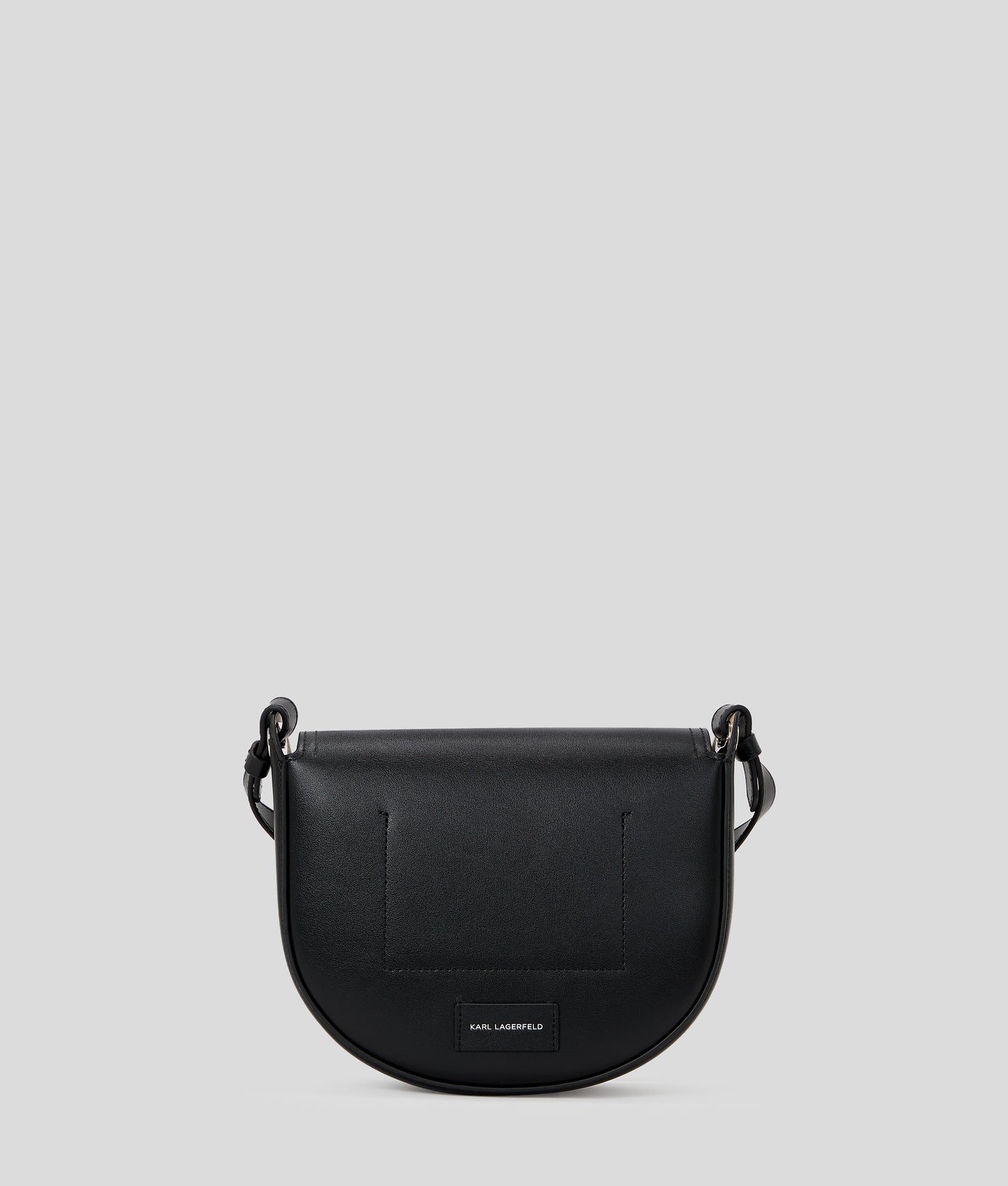 Crafted with a distinct saddle silhouette, this bag showcases a soft leather construction that exudes luxury. The magnetic flap closure ensures easy access, while the adjustable crossbody strap allows for personalized styling. A striking perforated KARL Circle adorns the front, adding a unique touch.