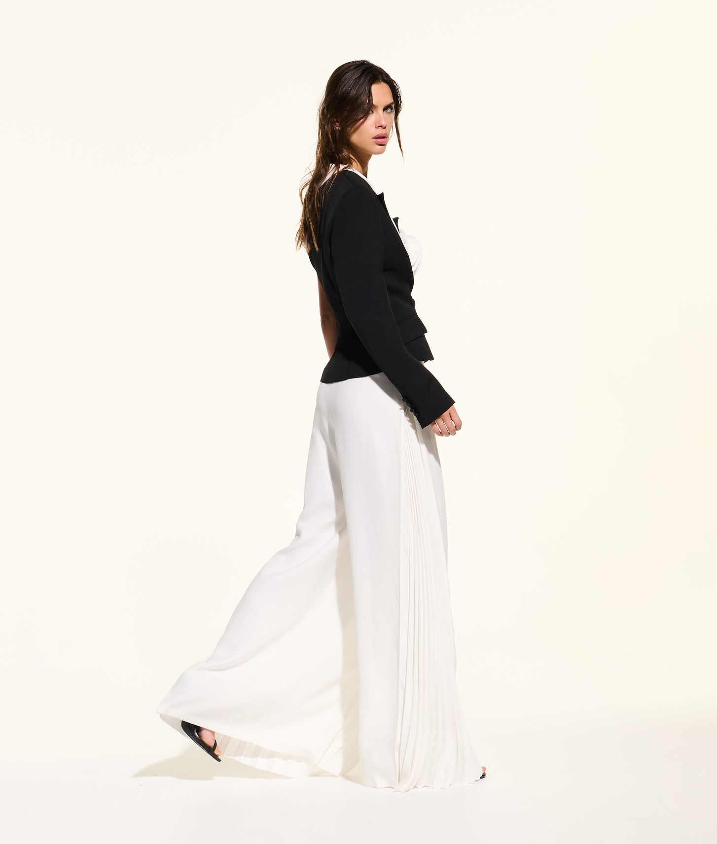 Pleated georgette side panels bring modern sophistication to a classic tailored silhouette. Featuring an elegant wide-leg cut, these pants offer dynamic movement with every stride. Pair with a structured blazer or blouse for a polished look that effortlessly transitions from day to evening.