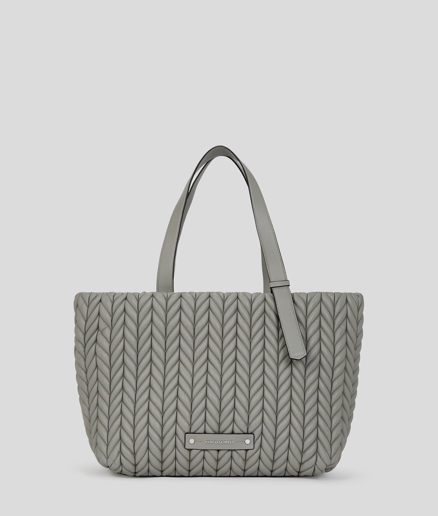 A quilted braided pattern, inspired by Karl Lagerfeld's travel pillow, offers a luxurious and contemporary finish to this striking tote bag, complemented by understated KARL LAGERFELD hardware. With a secure zip-top closure and twin handles, essentials are effortlessly organized and easy to access when on the go.