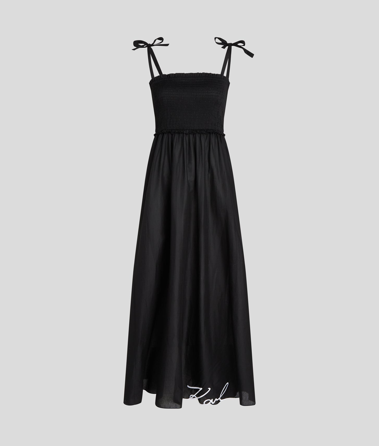 Designed for effortless style, this ankle-length beach dress features adjustable tie straps for a perfect fit and elegant KARL Signature embroidery for an elevated finish. Perfect for sun-soaked days and seaside strolls.