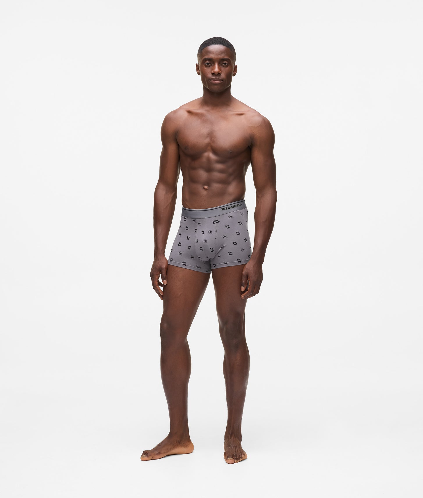 A trio of classic trunks showcasing playful designs for a fresh twist on everyday essentials. Each piece features an elasticated waistband for comfort, while the KARL LAGERFELD logo adds a touch of iconic flair.