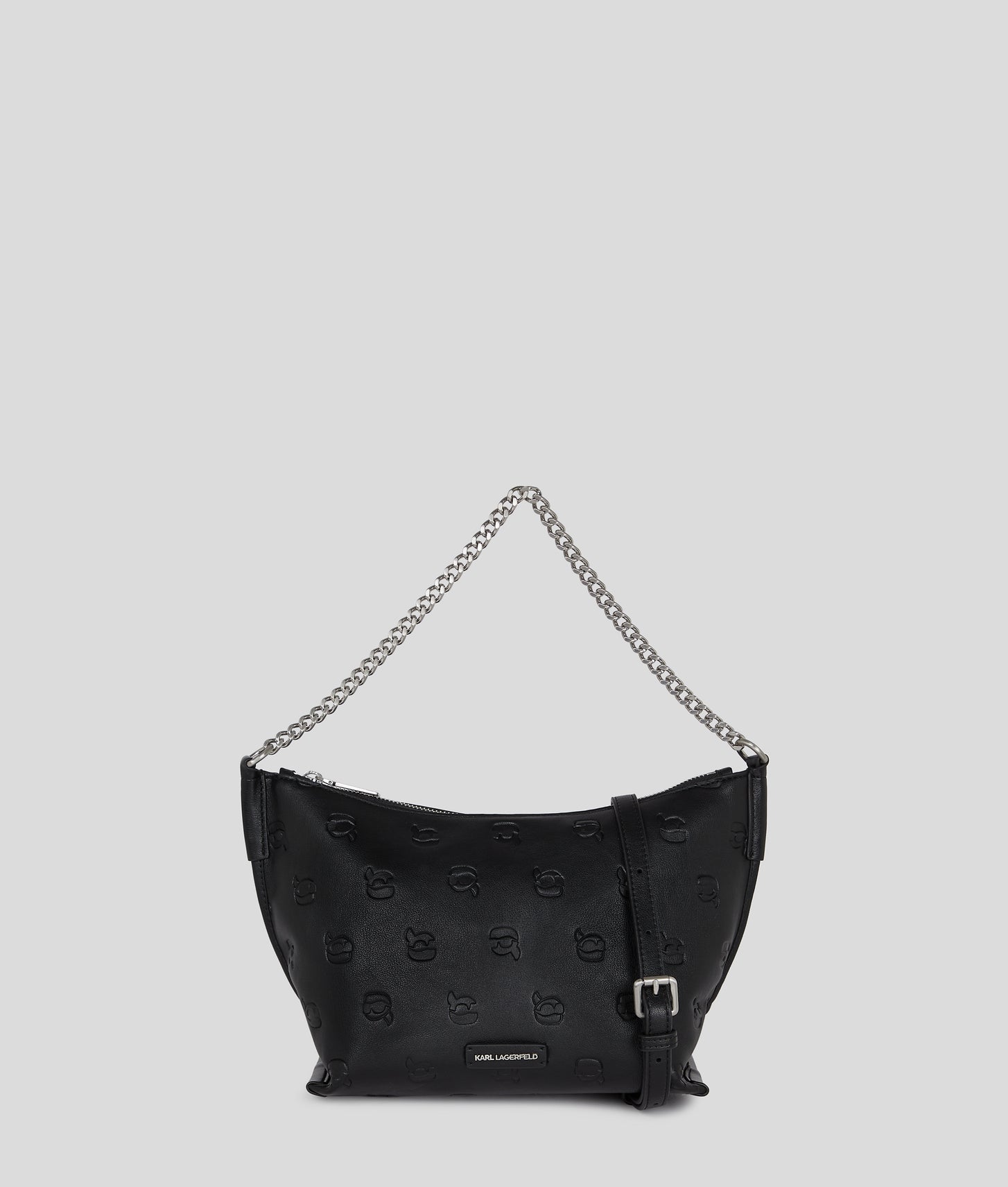 Discover a unique crescent silhouette with this sophisticated shoulder bag. Featuring a secure zip top closure and a striking all-over Ikon monogram design, it combines flair with functionality. The edgy chain strap and adjustable crossbody option offer versatile styling for any occasion.