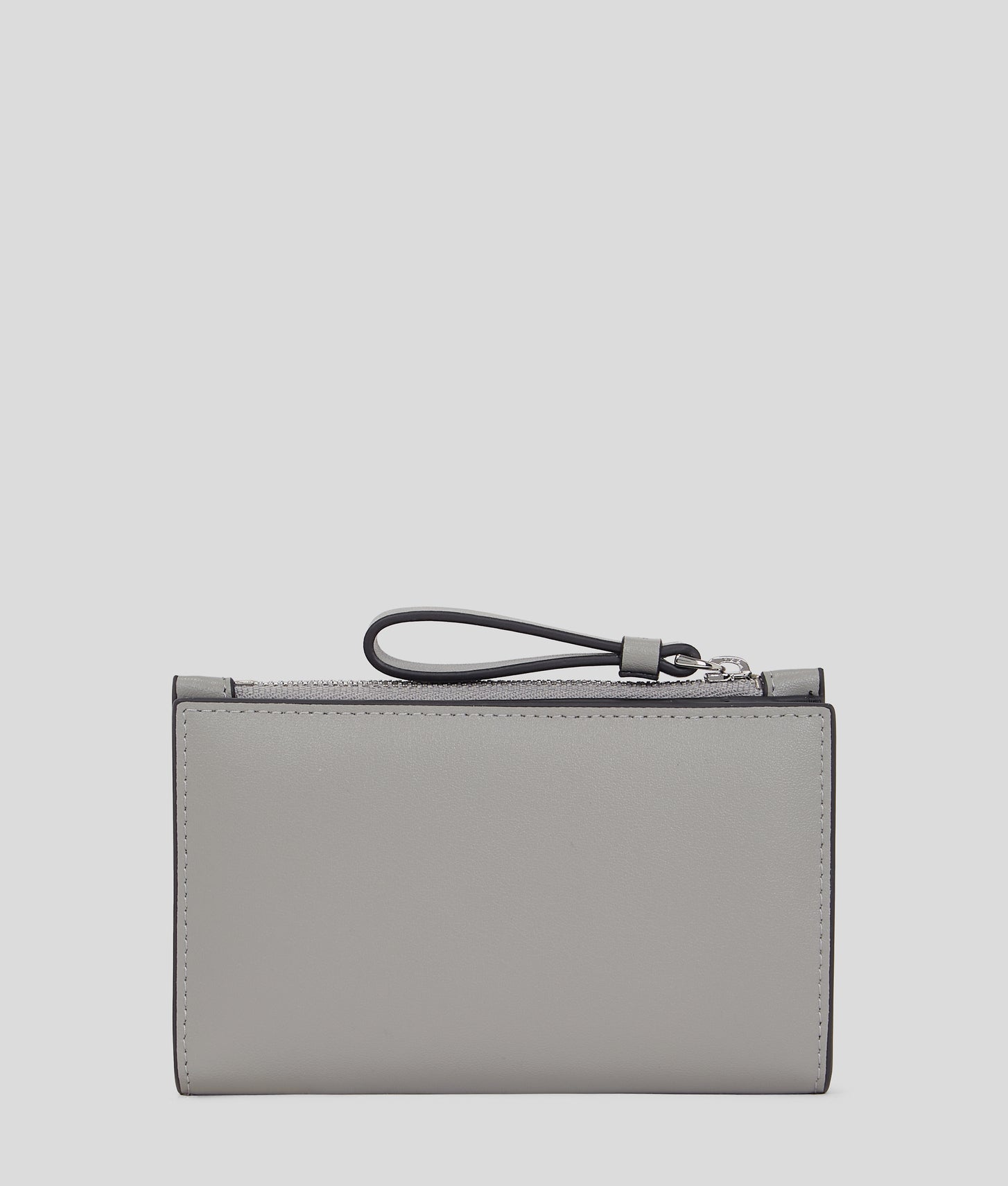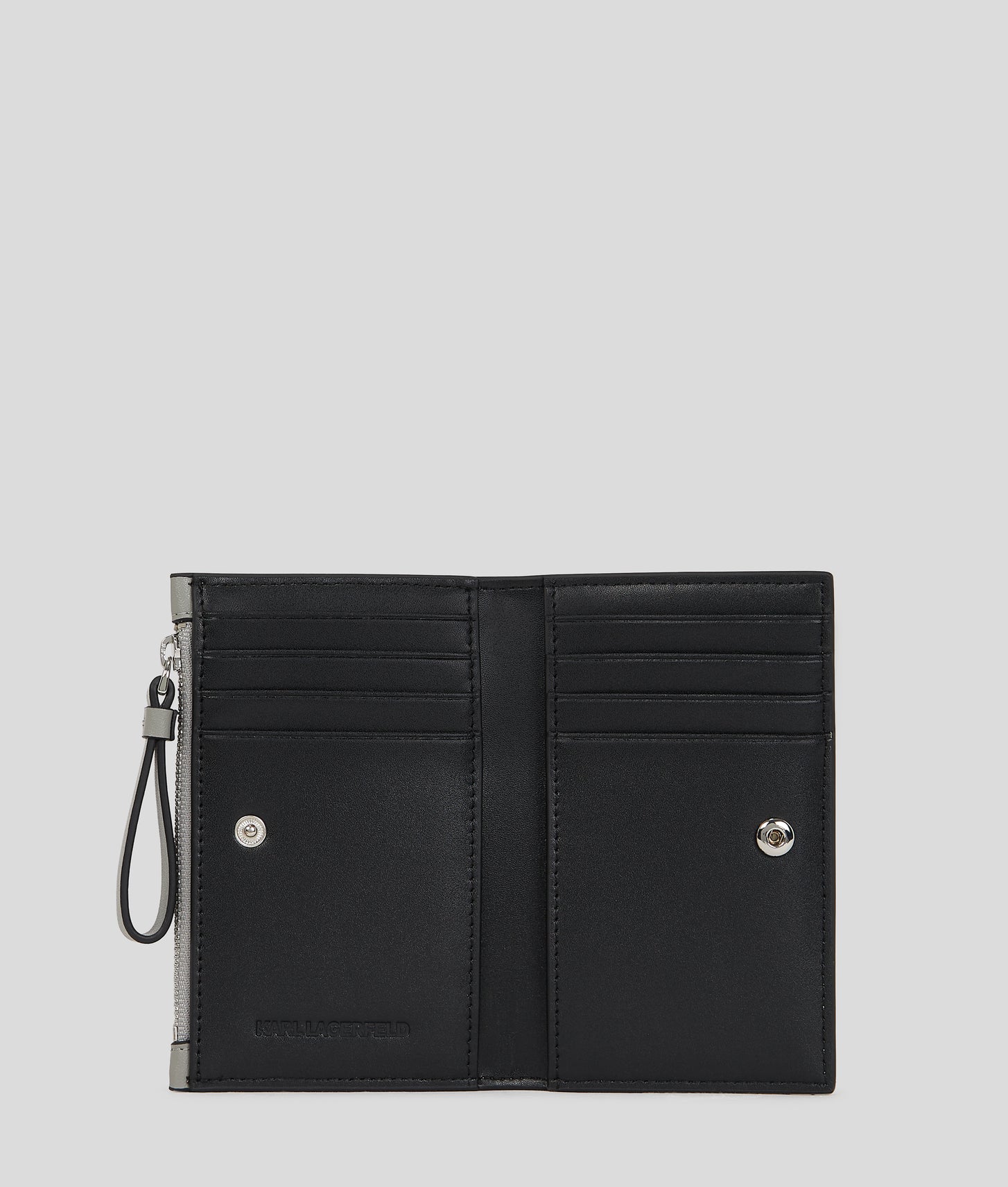Discover this elegant slim wallet that complements any ensemble. It features a bifold silhouette with a secure button closure and a zipped compartment for added organization. With multiple card slots and a unique perforated Karl Circle design, it seamlessly blends functionality and flair.
