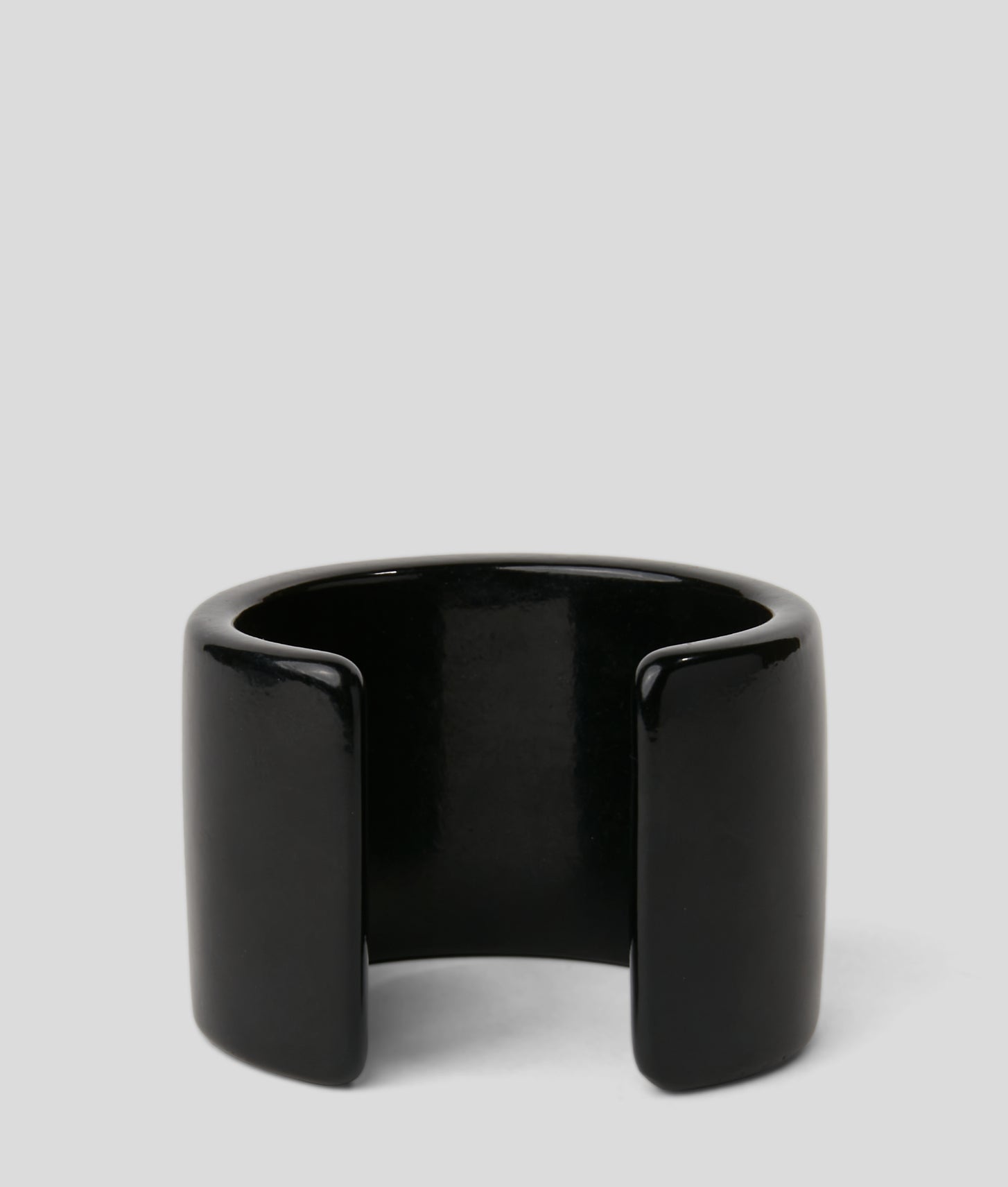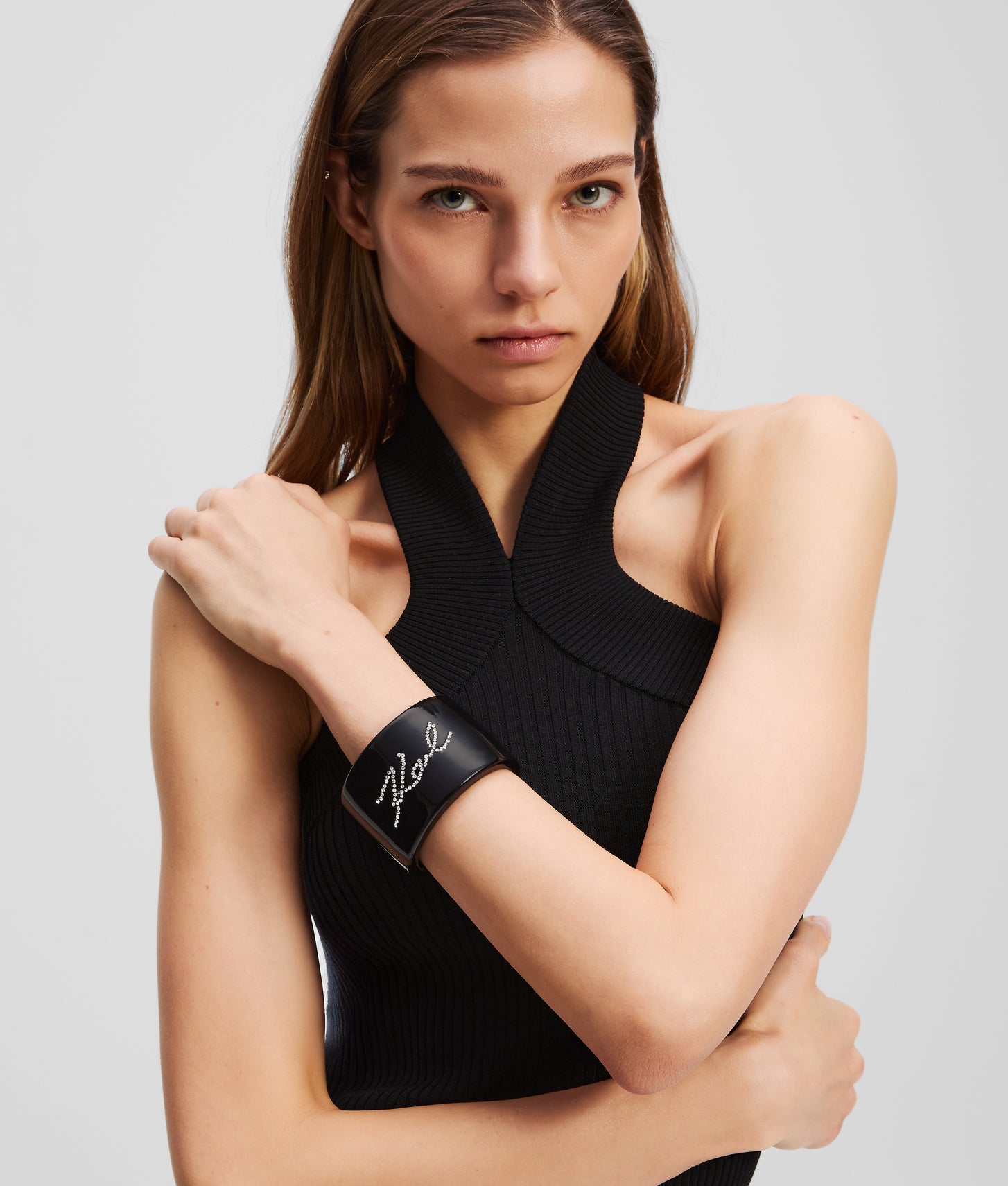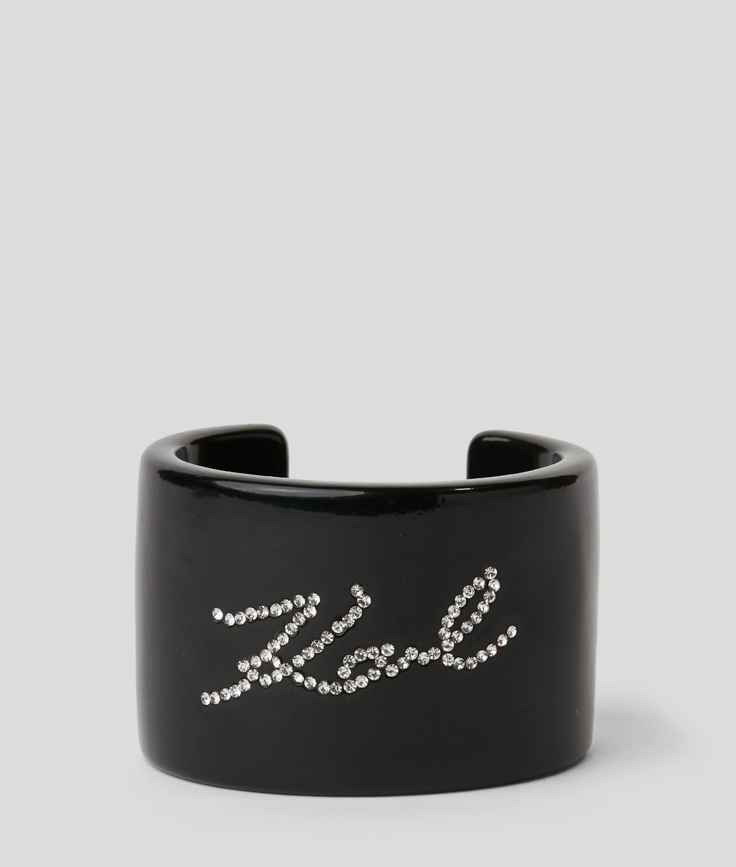 A stunning slip-on cuff that effortlessly combines modern design with a touch of glamour. Crafted from durable resin, it features the iconic Karl Signature logo embellished with shimmering rhinestones, making it a standout accessory for any outfit.