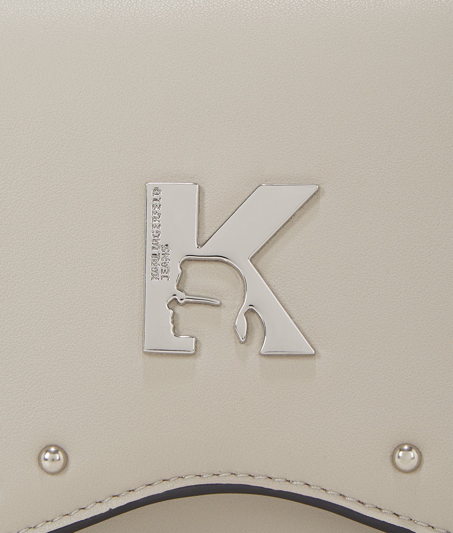 A petite yet practical crossbody bag with a unique, sunglasses-inspired silhouette, honoring Karl Lagerfeld's favorite dark shades. Featuring an adjustable strap for versatile wear, accented by edgy studs and bold K-logo hardware.