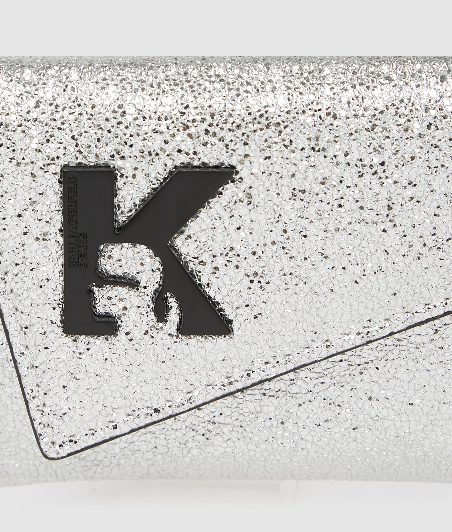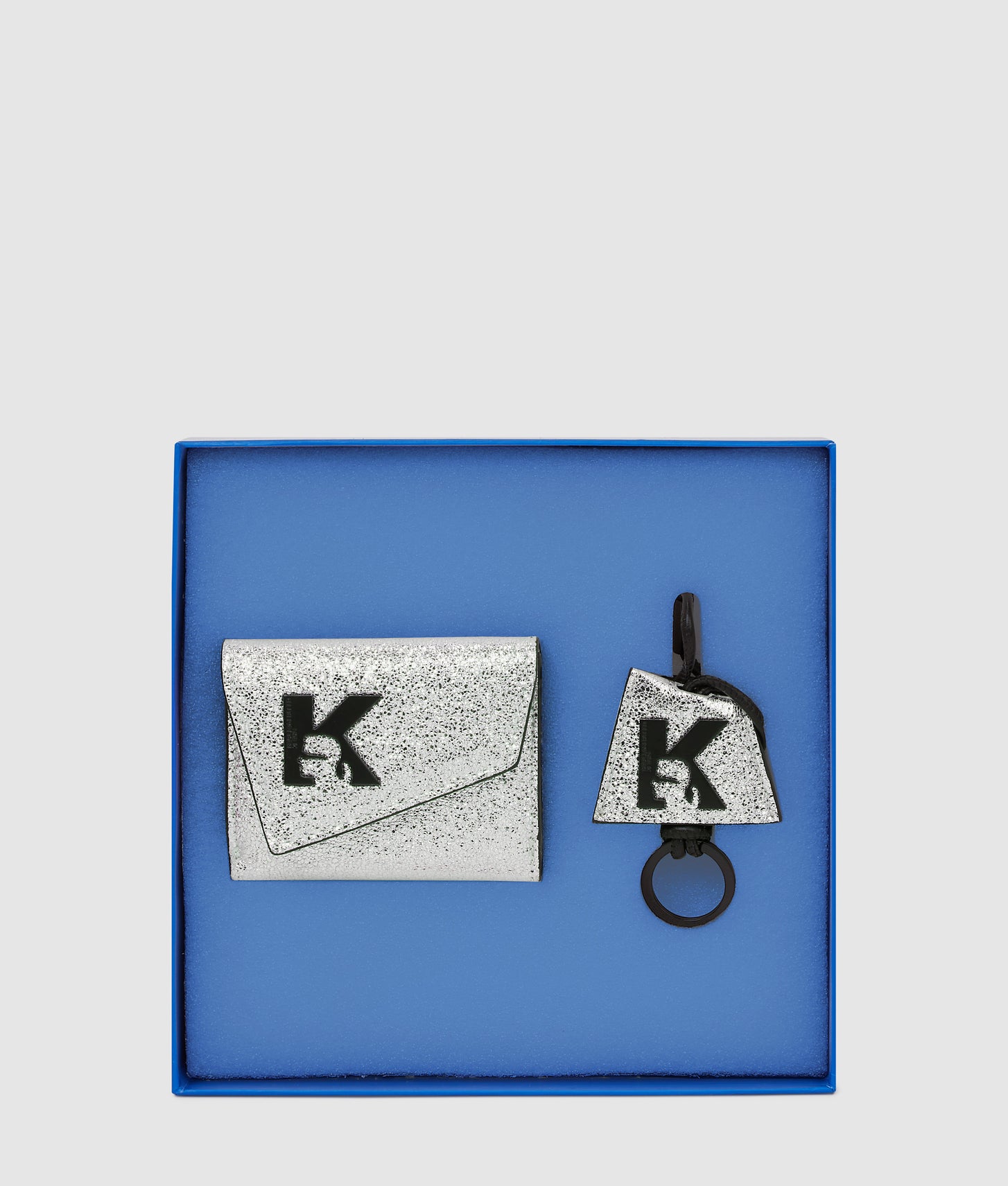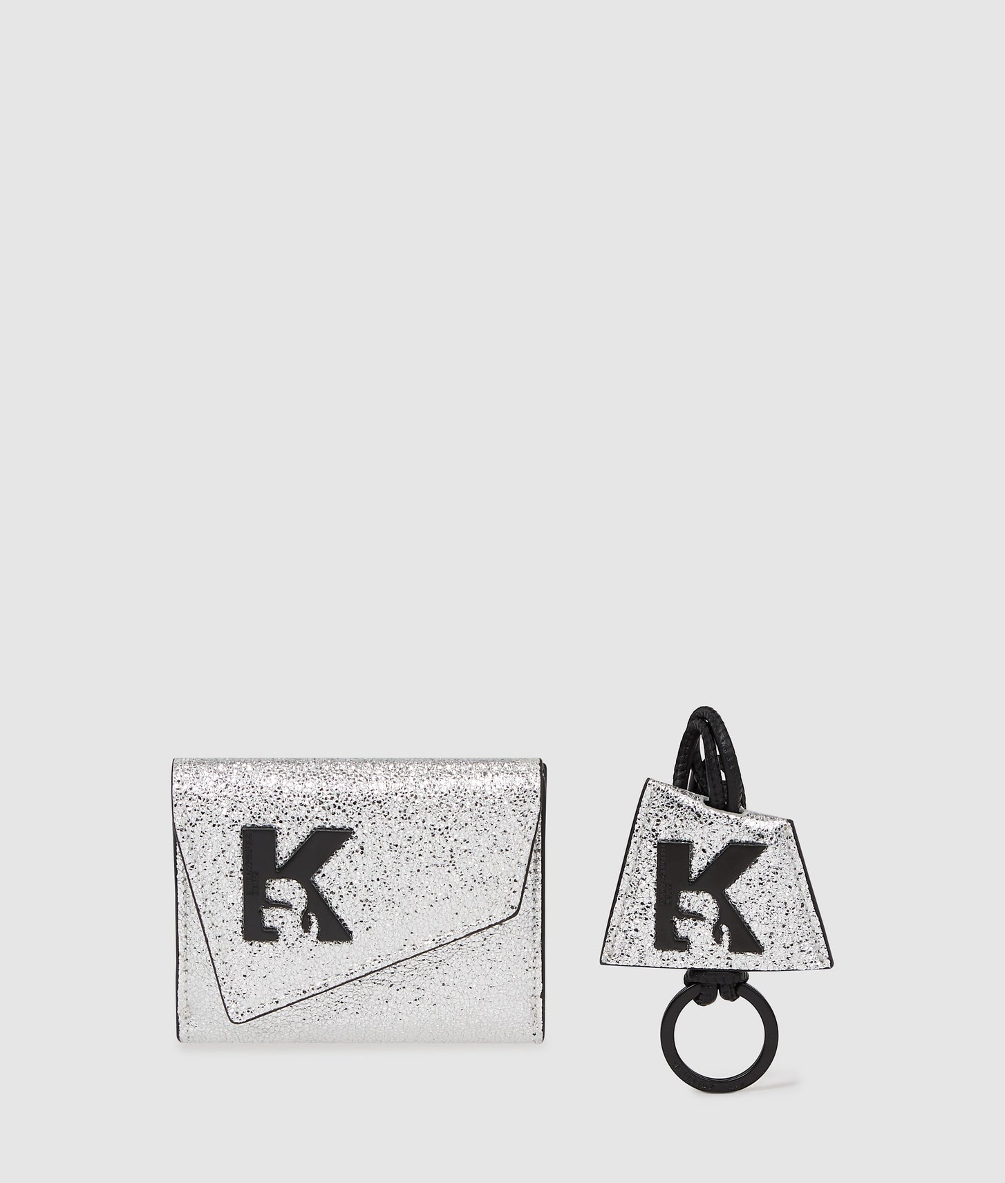 A contemporary asymmetric design, sleek sparkle finish and bold K-logo are at the center of this statement bifold wallet and keychain set. Packaged in a signature presentation box, they add a playful touch to your accessories collection.