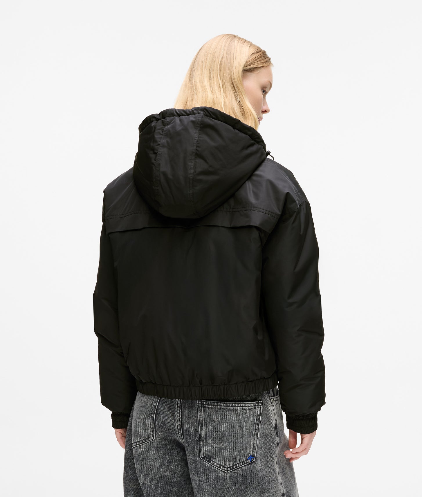 A subtle warmth wraps you in this lightly padded jacket, where a drawcord hood and elastic cuffs keep the chill at bay. Twin pockets add practical ease, while a contrast logo marks quiet confidence.
