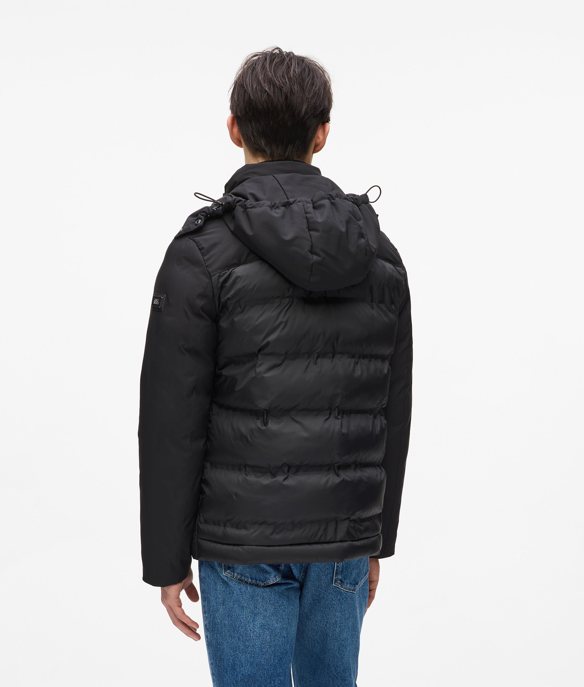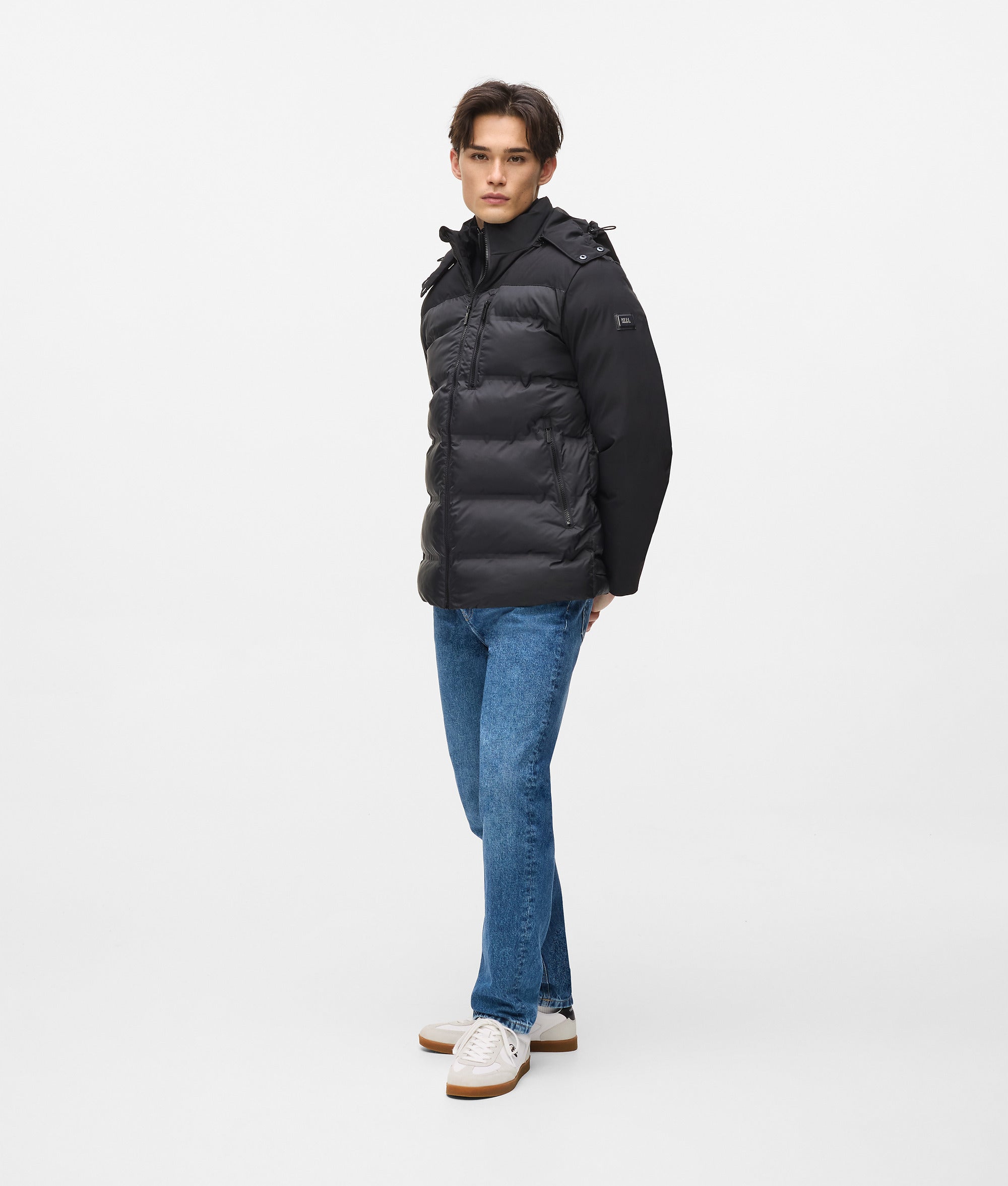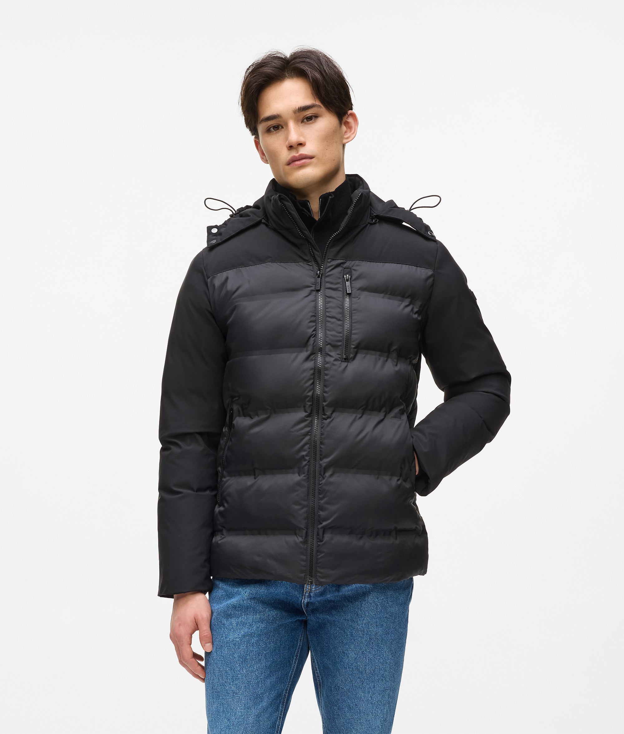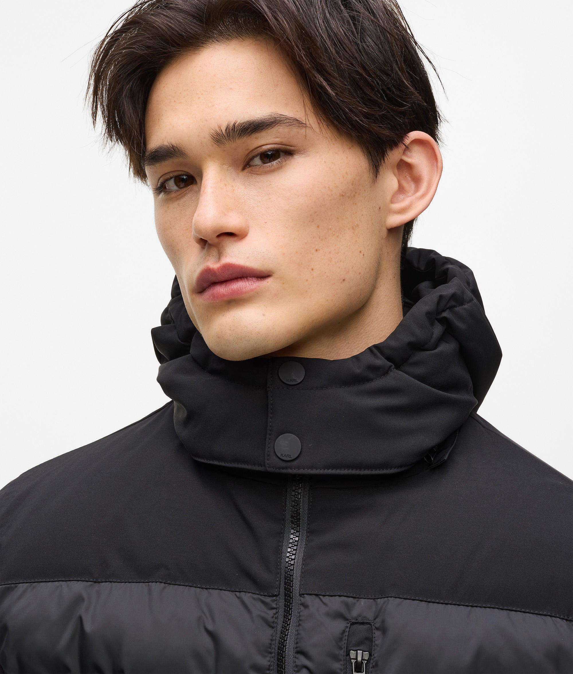 Engineered for warmth and everyday ease, this water-repellent puffer jacket features a detachable hood and secure zipped pockets. Contrasting matte panels add definition to the casual-cool silhouette.