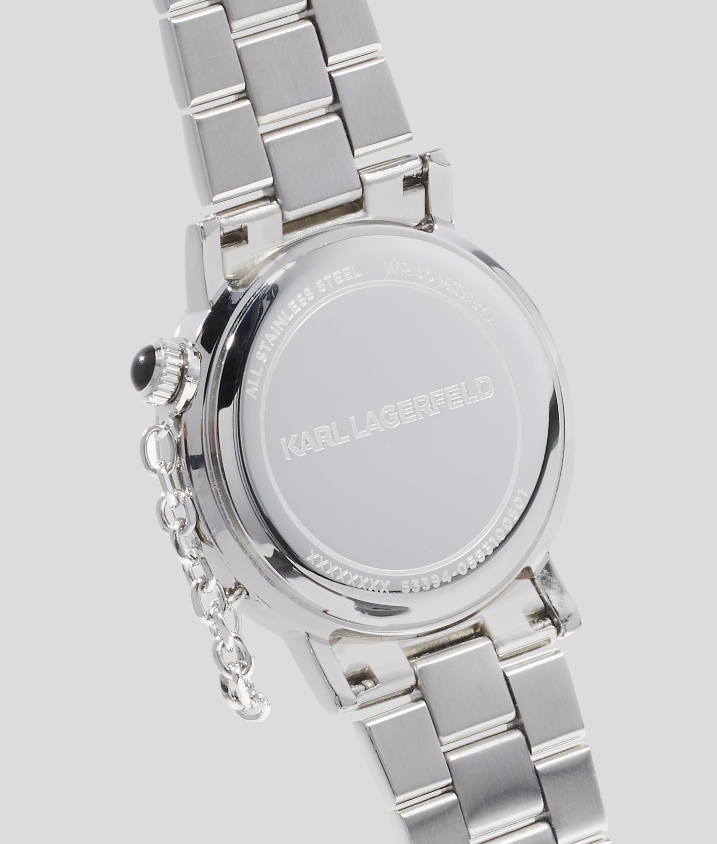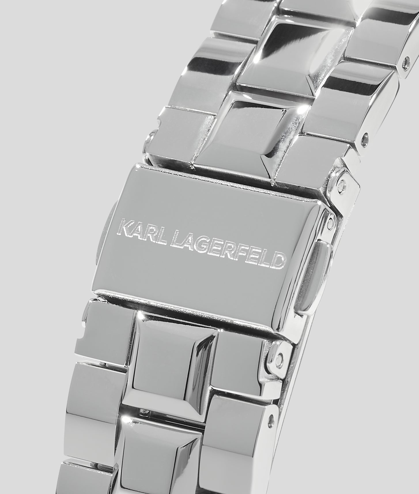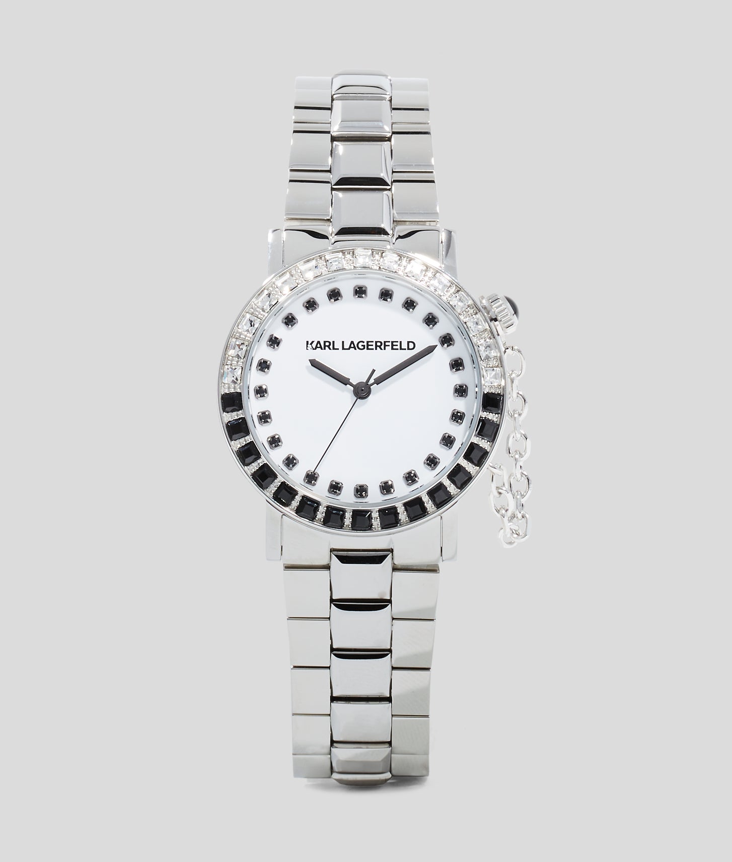 A statement timepiece with refined detailing, this watch features a stainless steel silver-toned bracelet and black and white crystal-set bezel, accented by KARL LAGERFELD's logo on the round dial. Its design blends edgy style with timeless appeal.