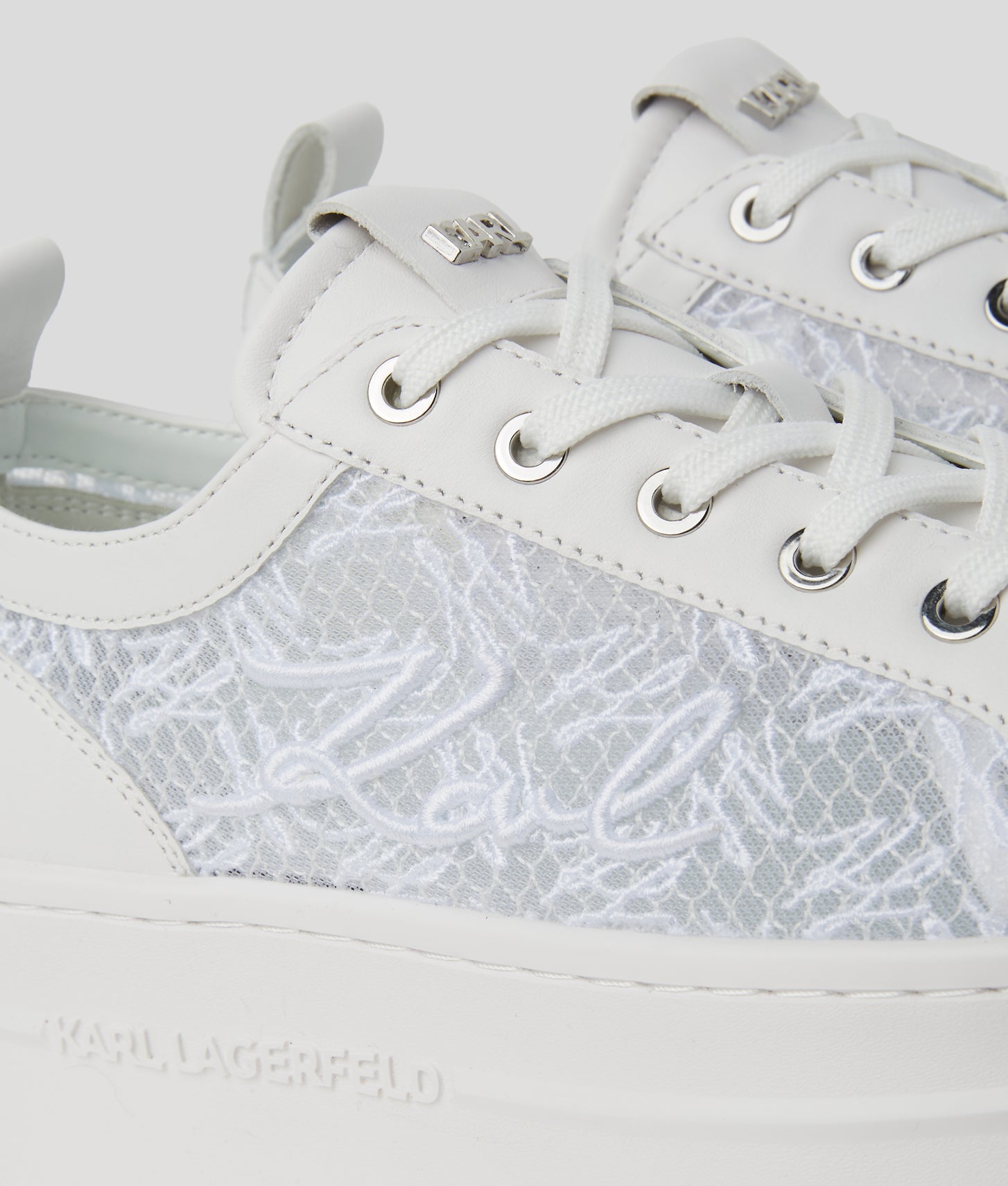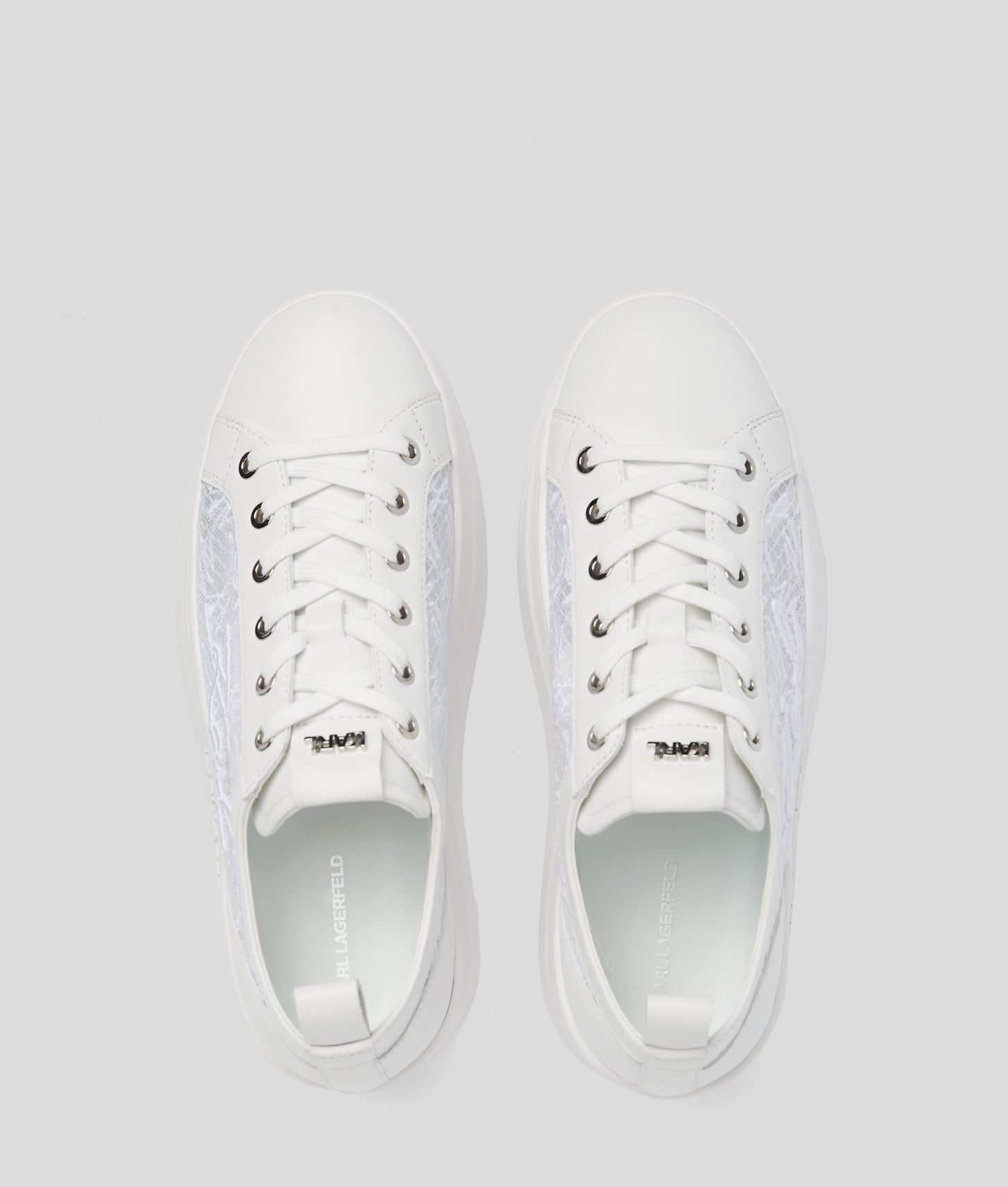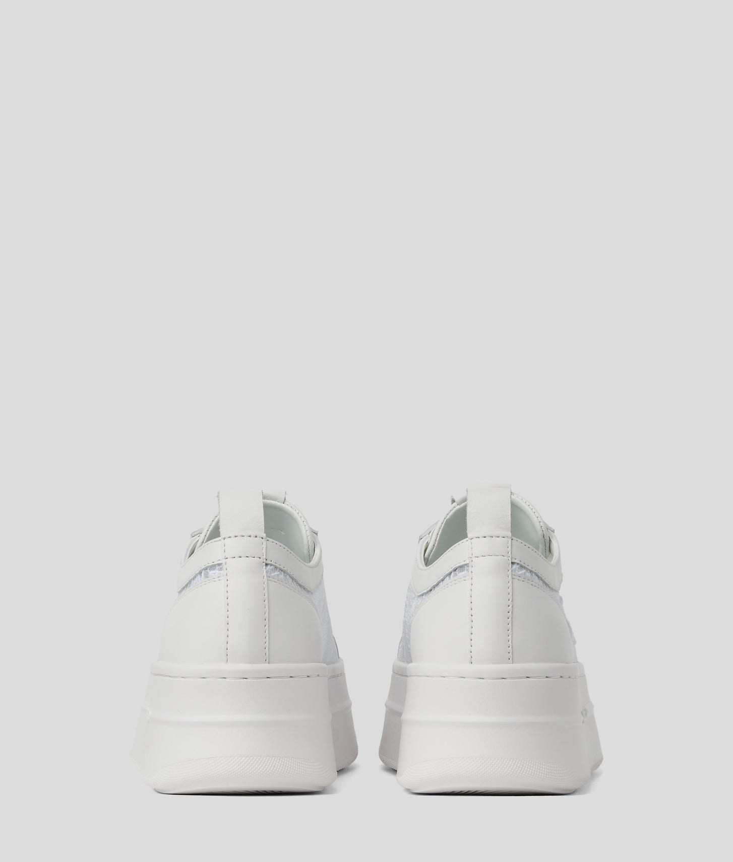 An exceptional blend of style and practicality, these sneakers feature a lace-up design complemented by a convenient pull tab at the heel. The high wedge sole showcases a subtle tonal KARL LAGERFELD logo, while the delicate lace details add a unique touch of flair.