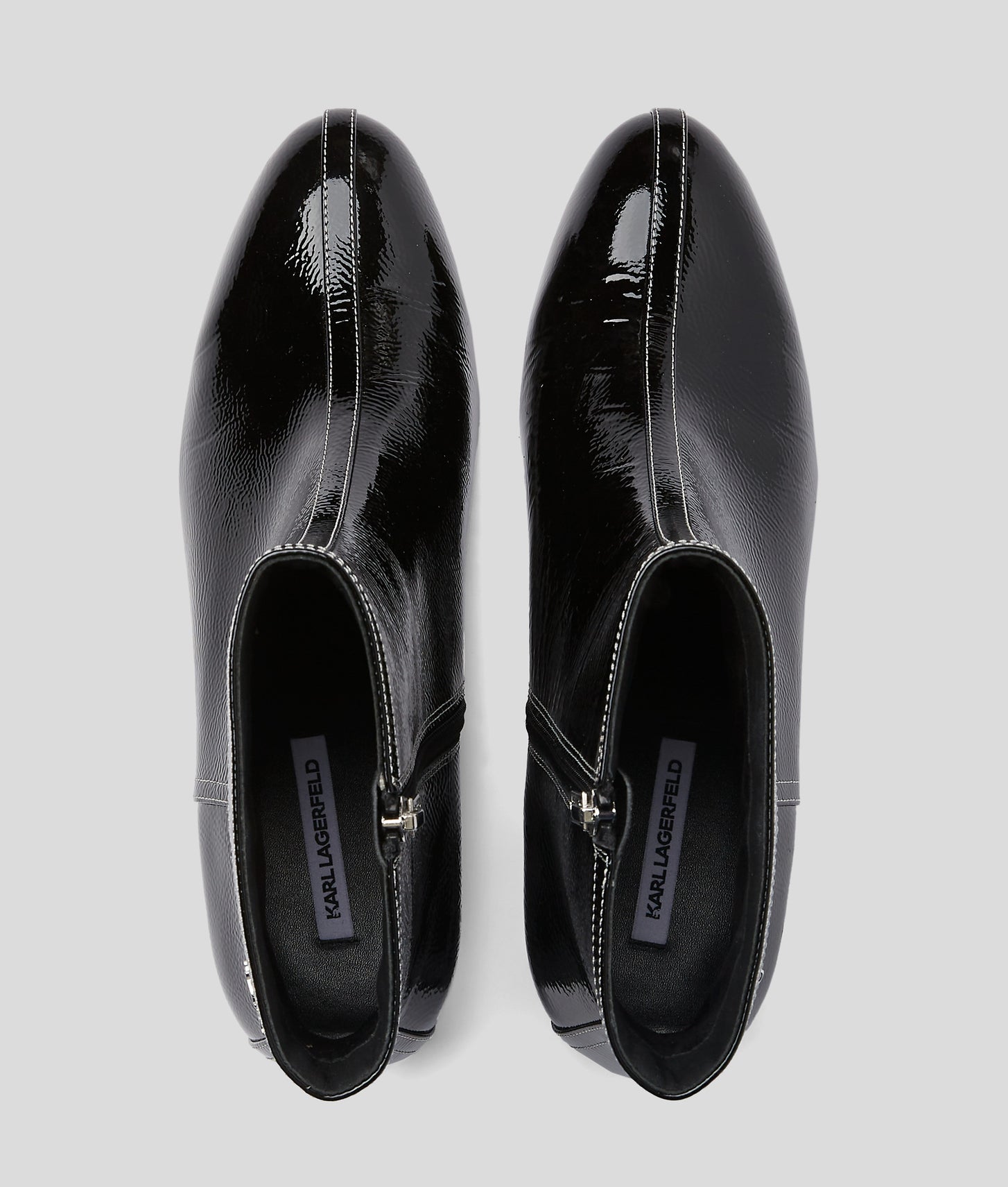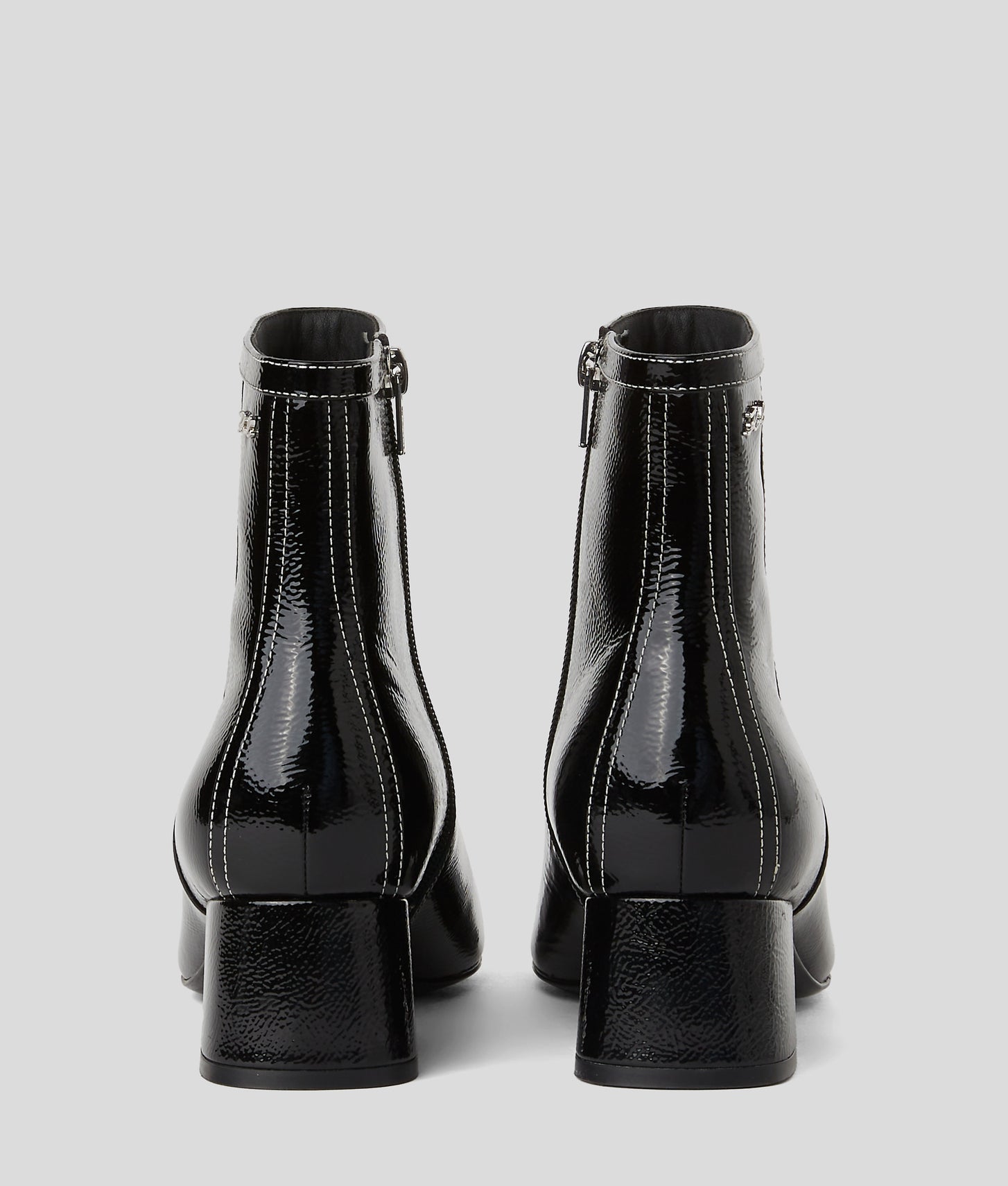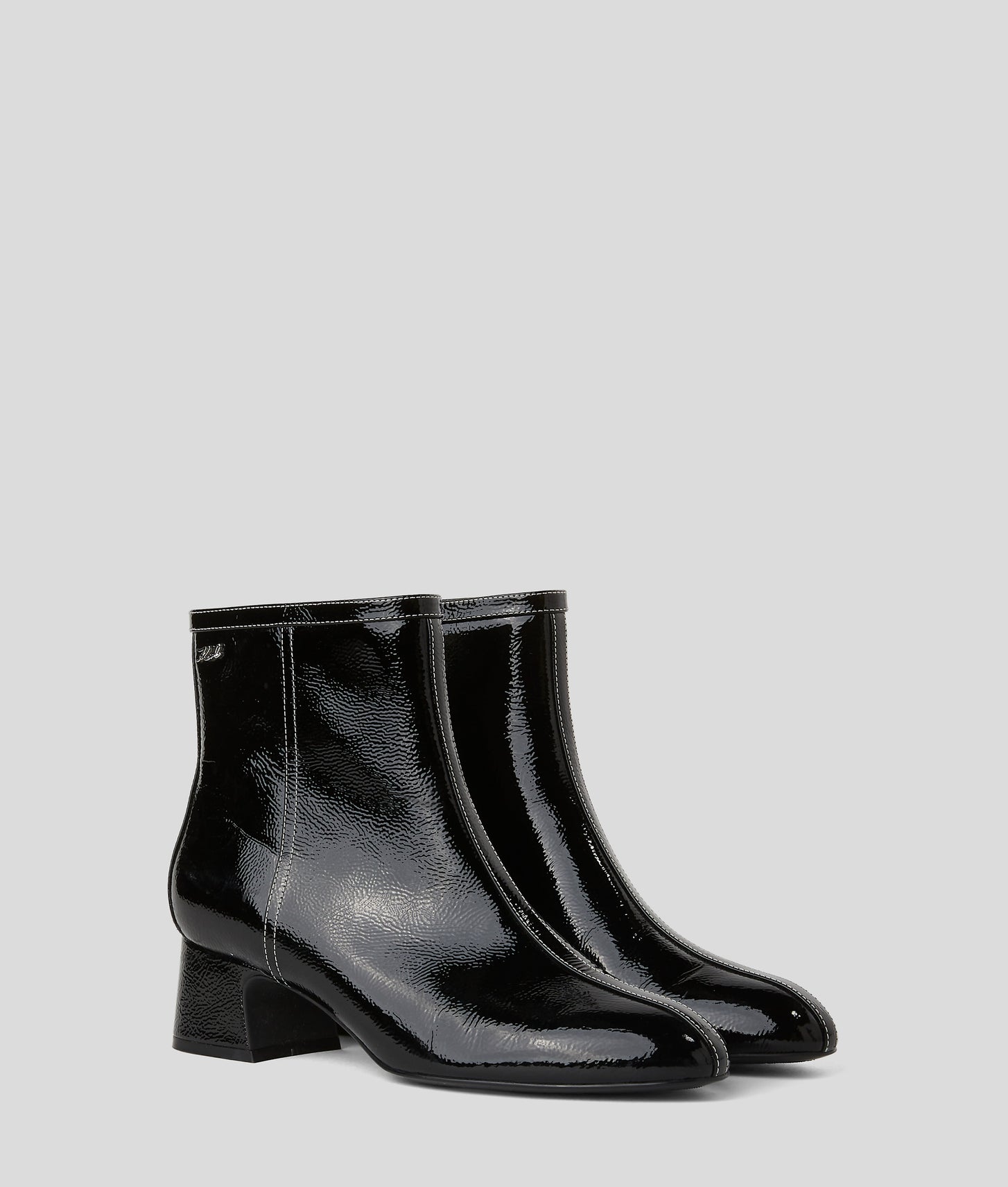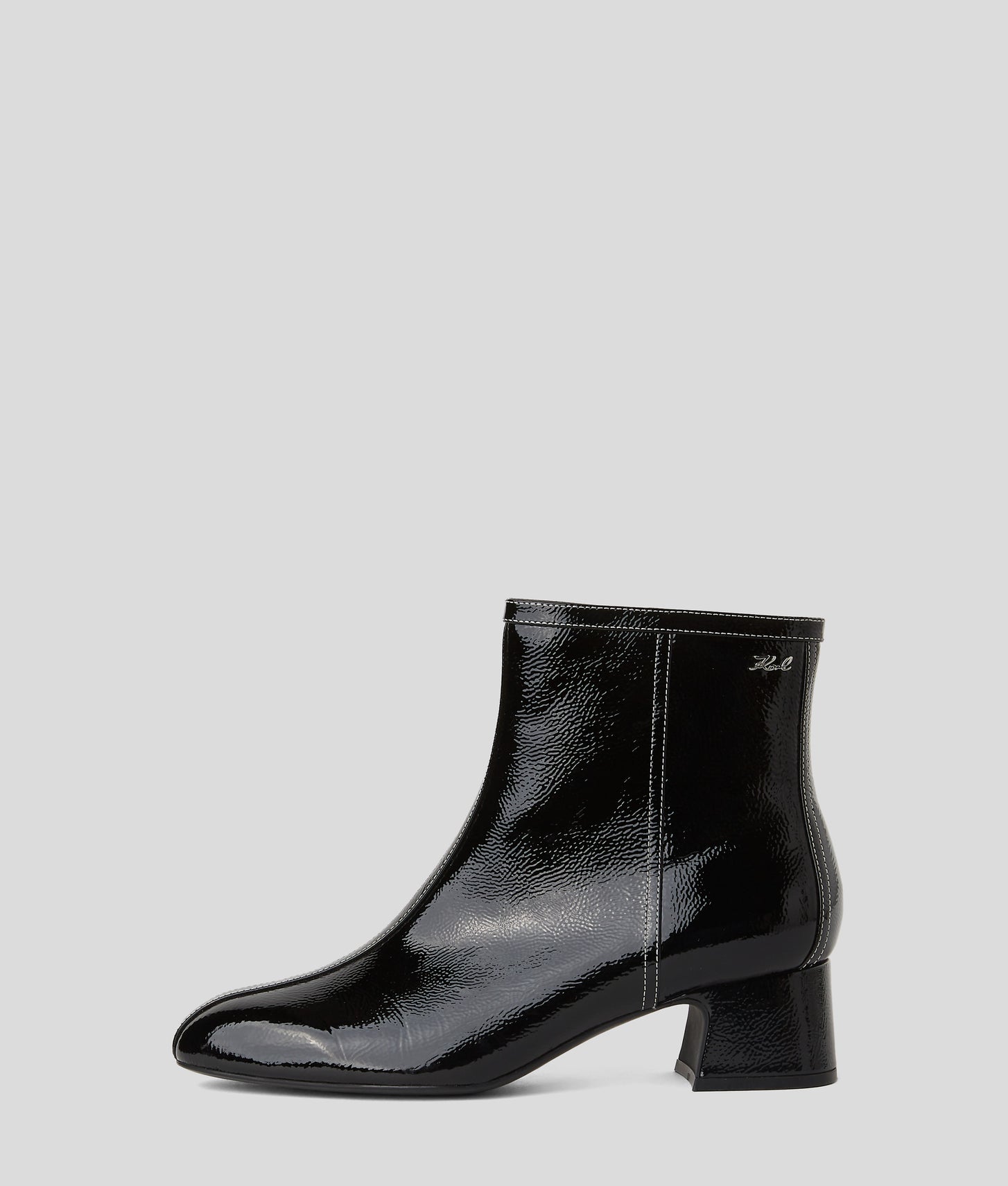 These sleek ankle boots showcase a high-shine leather that exudes style and confidence. The molded platform heel adds a touch of height without sacrificing comfort, while the side zip closure ensures easy wear. The statement look is anchored by subtle Karl Signature hardware.