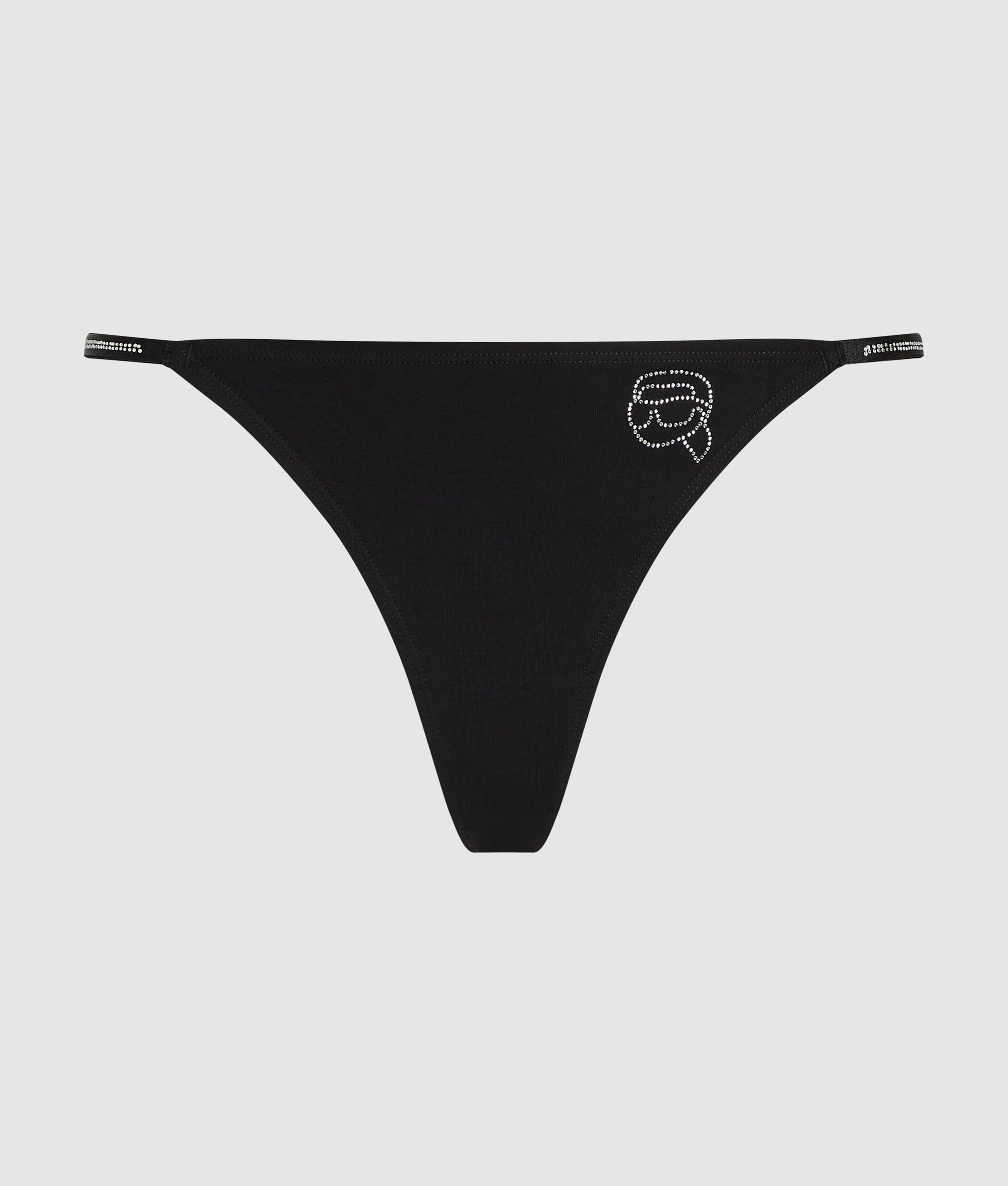 Designed for a sleek silhouette, this thong is cut with high legs and minimal coverage. Rhinestone embellishment at the waist adds sparkle, while Ikon Karl artwork at the hip brings a playful finish. Complete the look with the matching triangle bra.