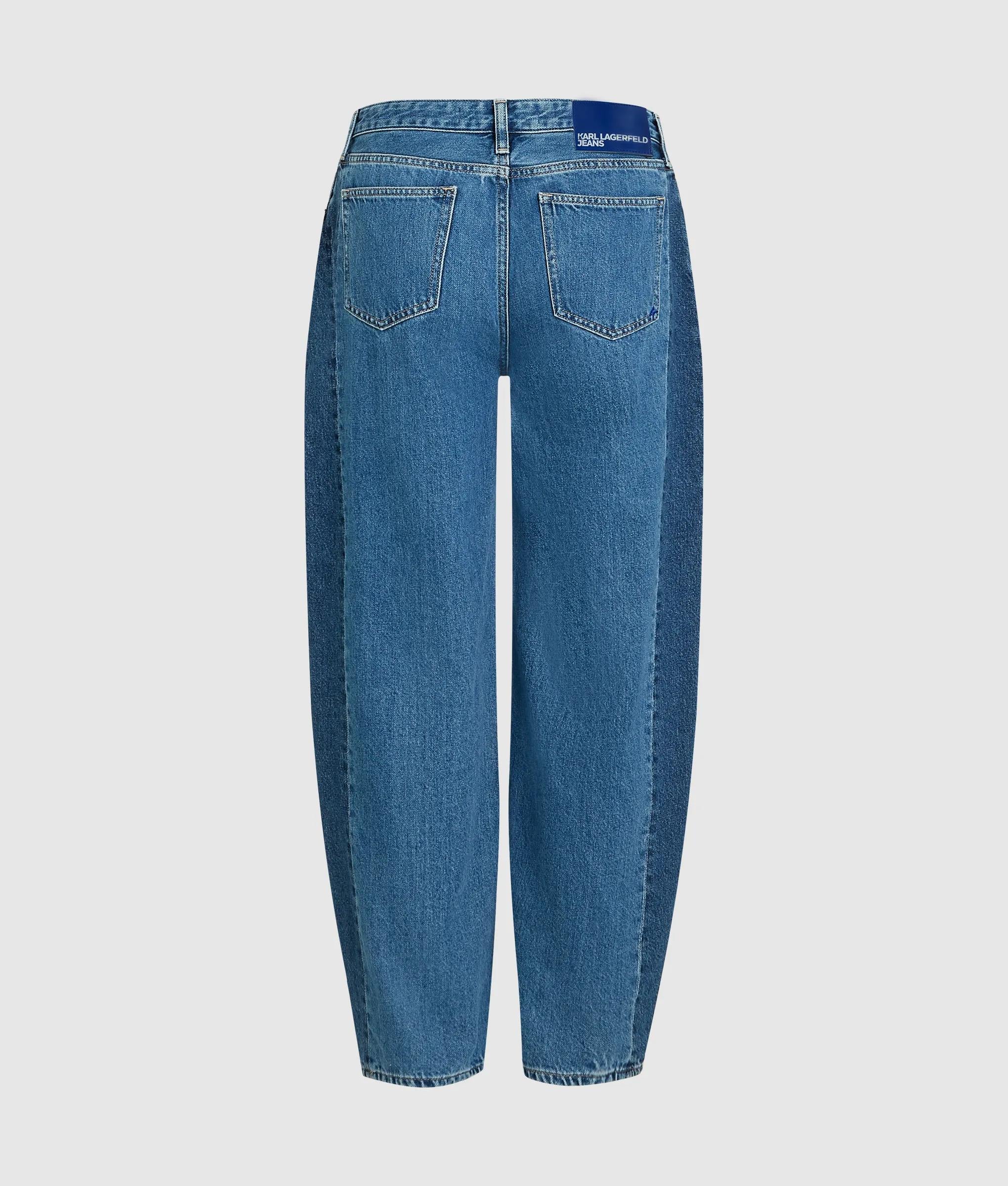 Two-tone denim blocking exaggerates the sculptural silhouette of these mid-rise barrel jeans. Style them with a crisp white shirt for contrast or lean into denim-on-denim for full impact.
