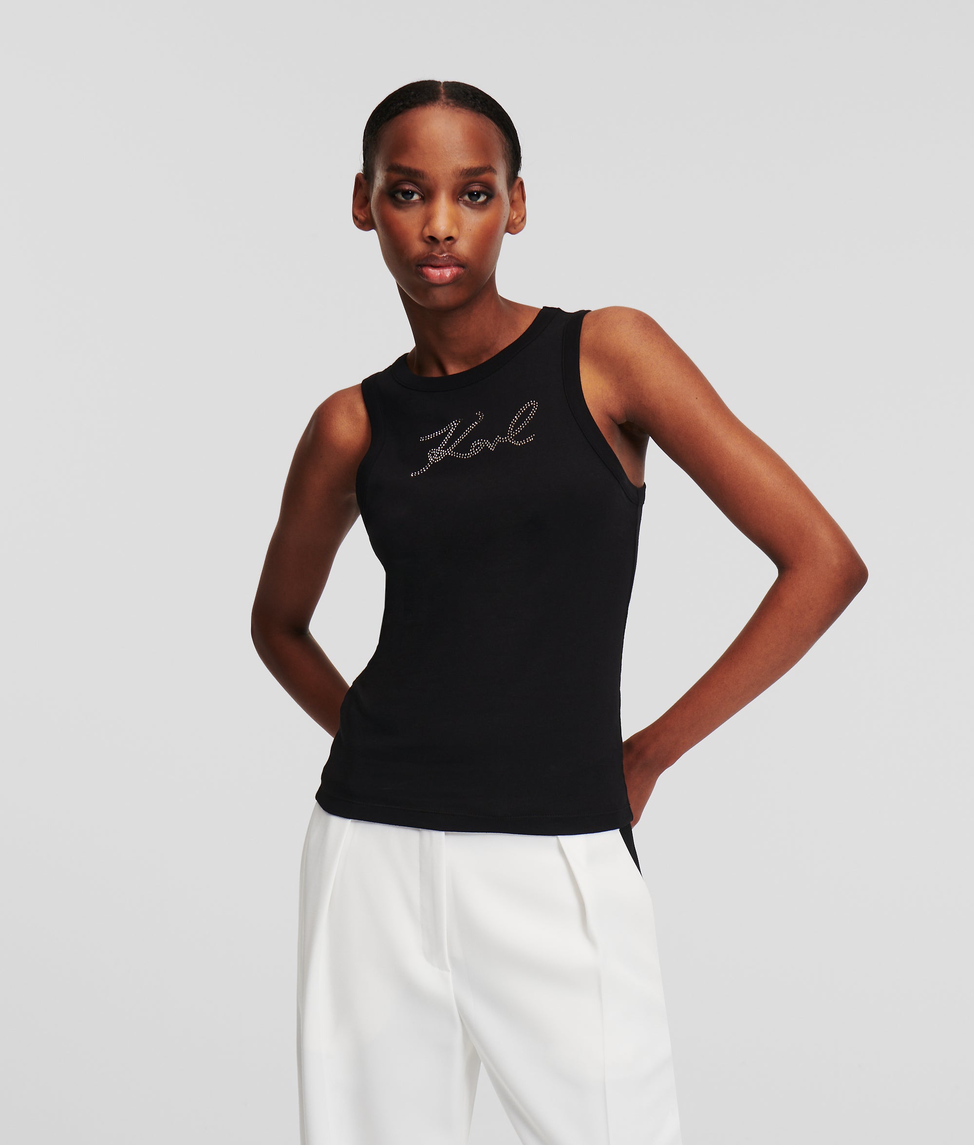 Epitomizing casual glamor, this KARL LAGERFELD tank top features a stretch cotton construction for supreme comfort. The sleeveless cut and classic ribbed crew neck are accentuated by dazzling rhinestone-embellished KARL Signature artwork at the chest, reflecting understated luxury. Pair it with coordinated sweatpants for an elevated off-duty look.