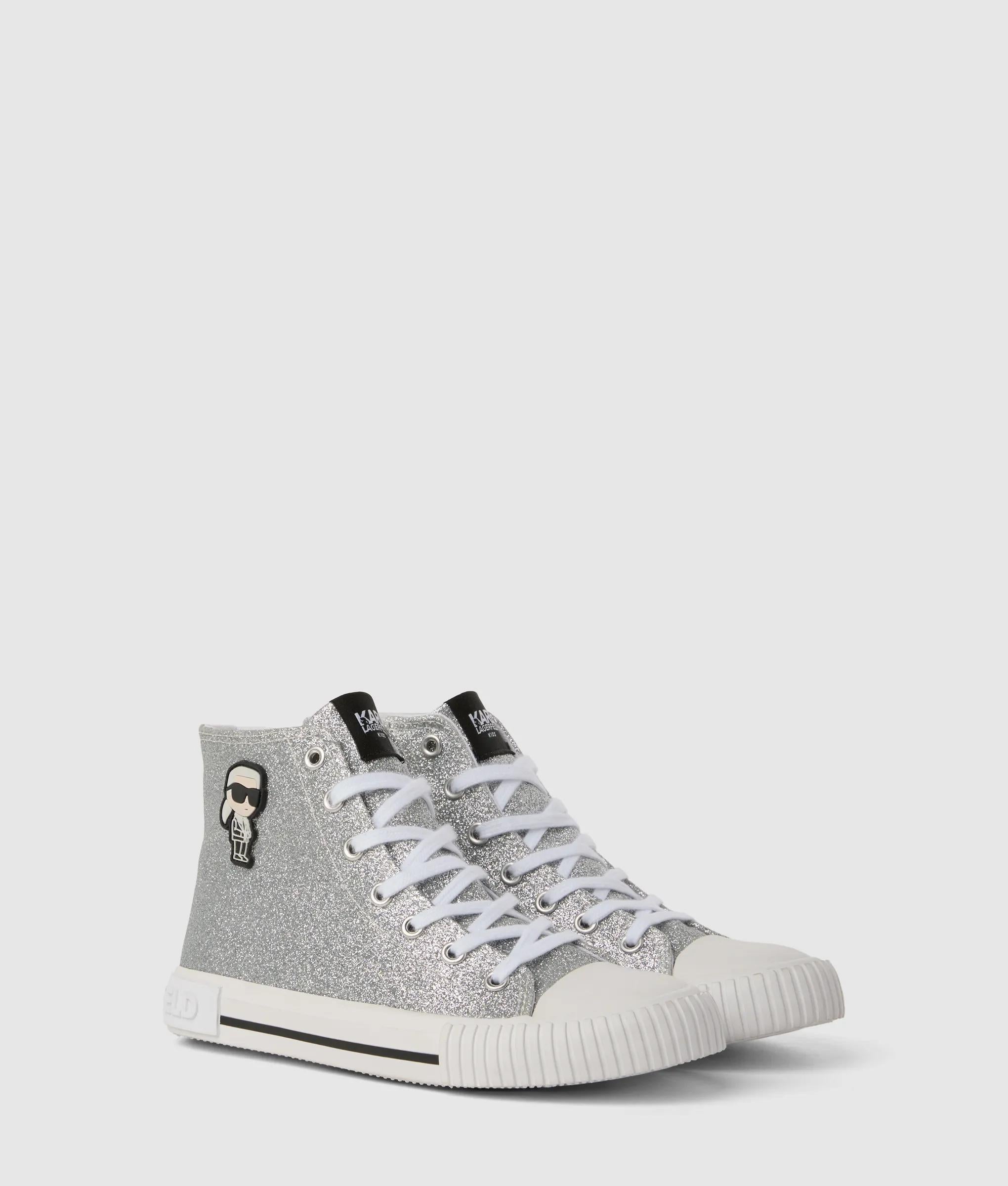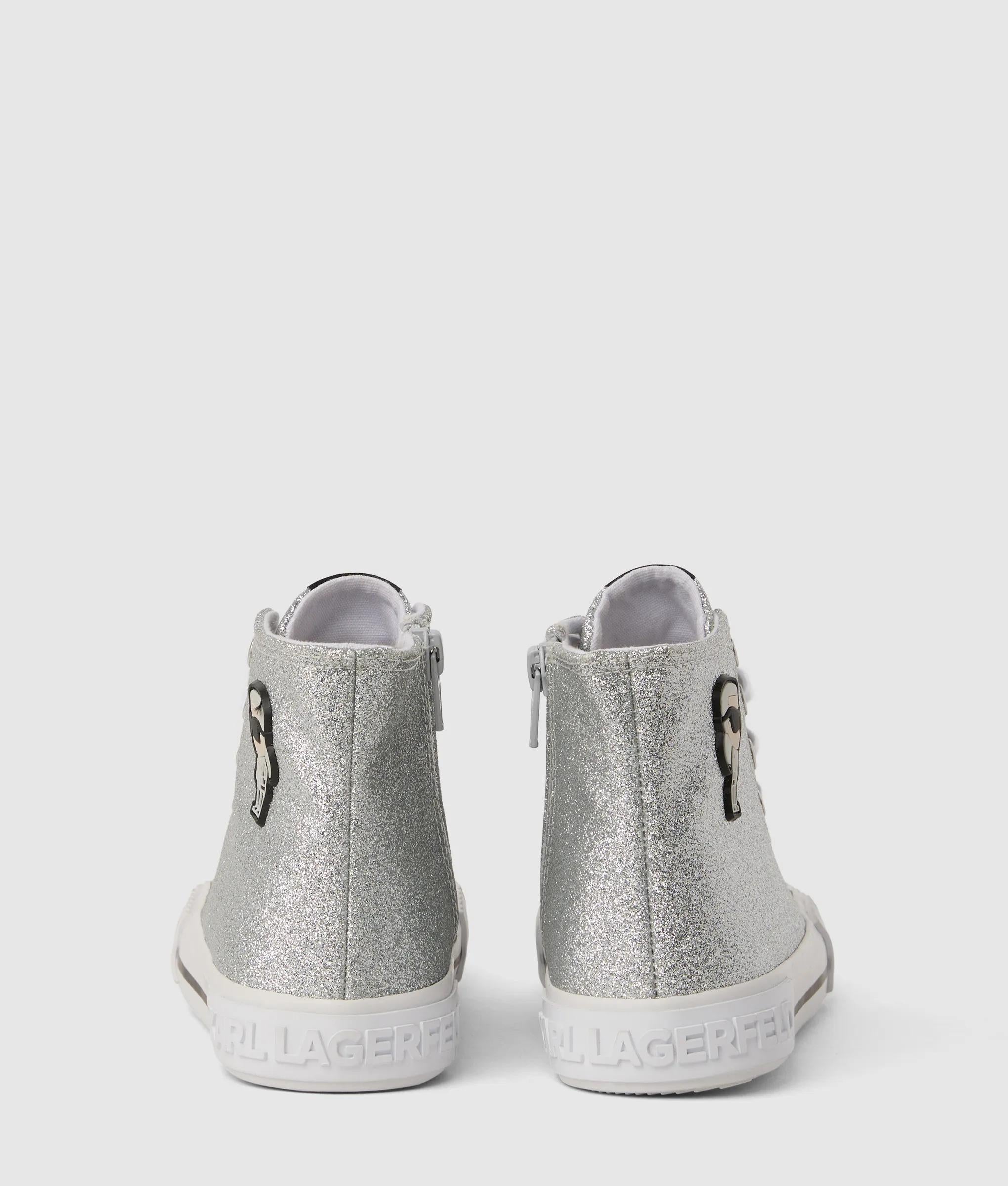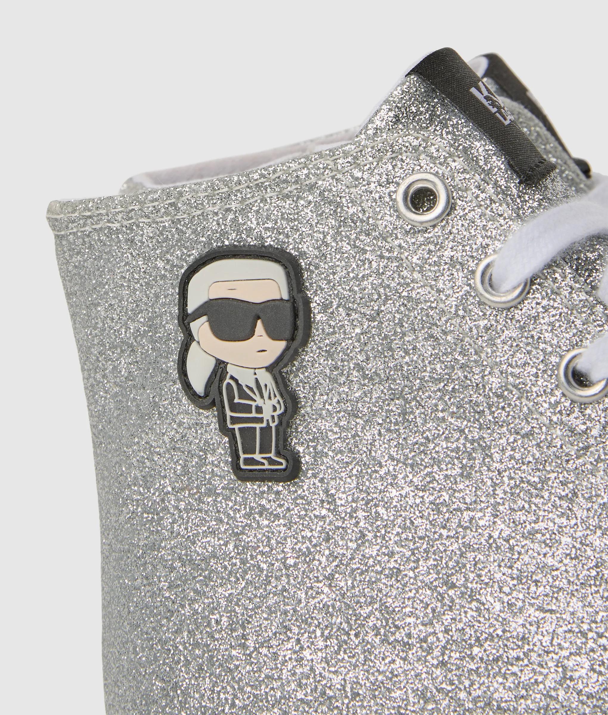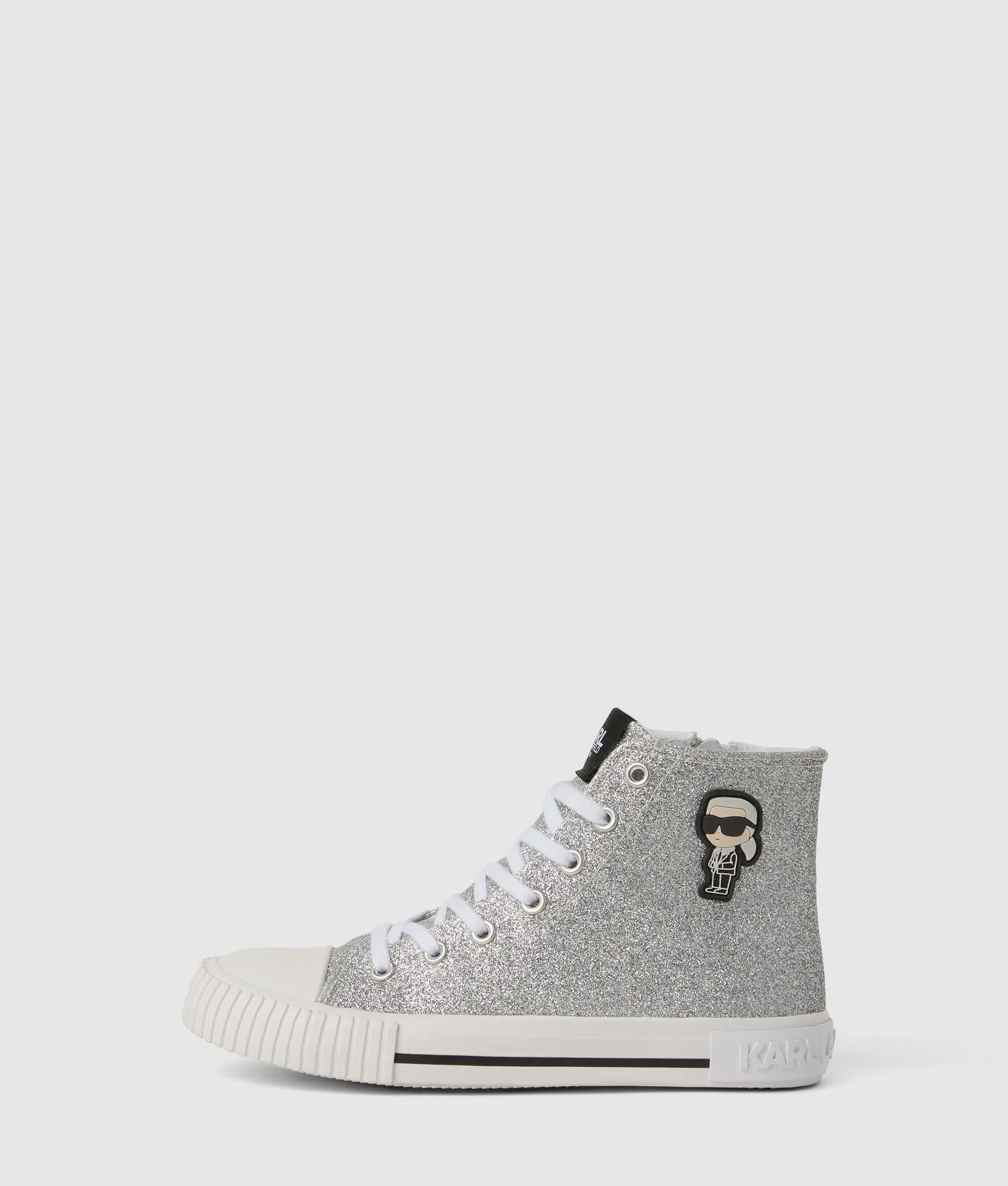 These high-top sneakers sparkle with glittering fabric and Ikon Karl artwork. The lace-up style features an inside zip fastening for easy wear, bringing practicality to the statement staples.