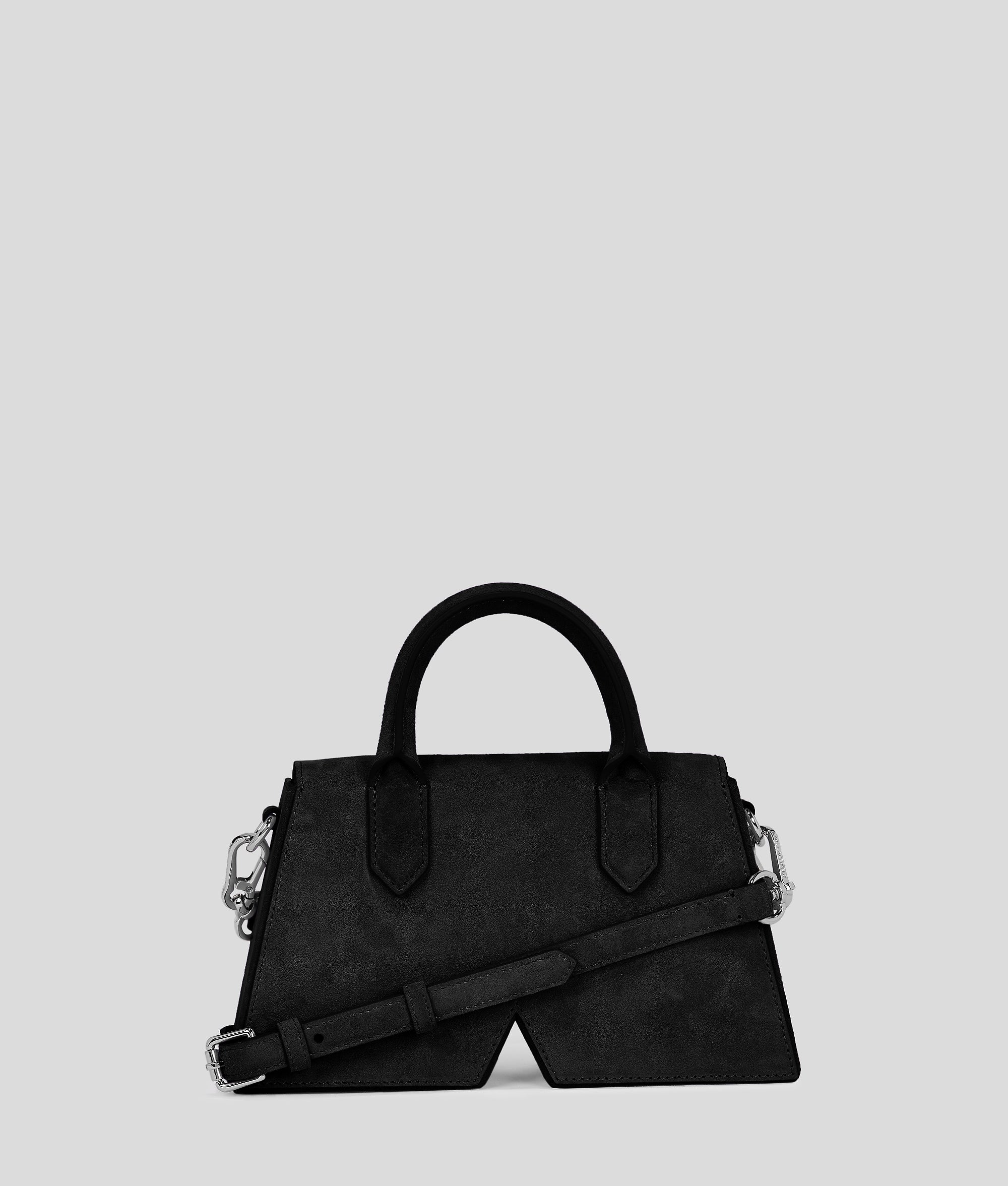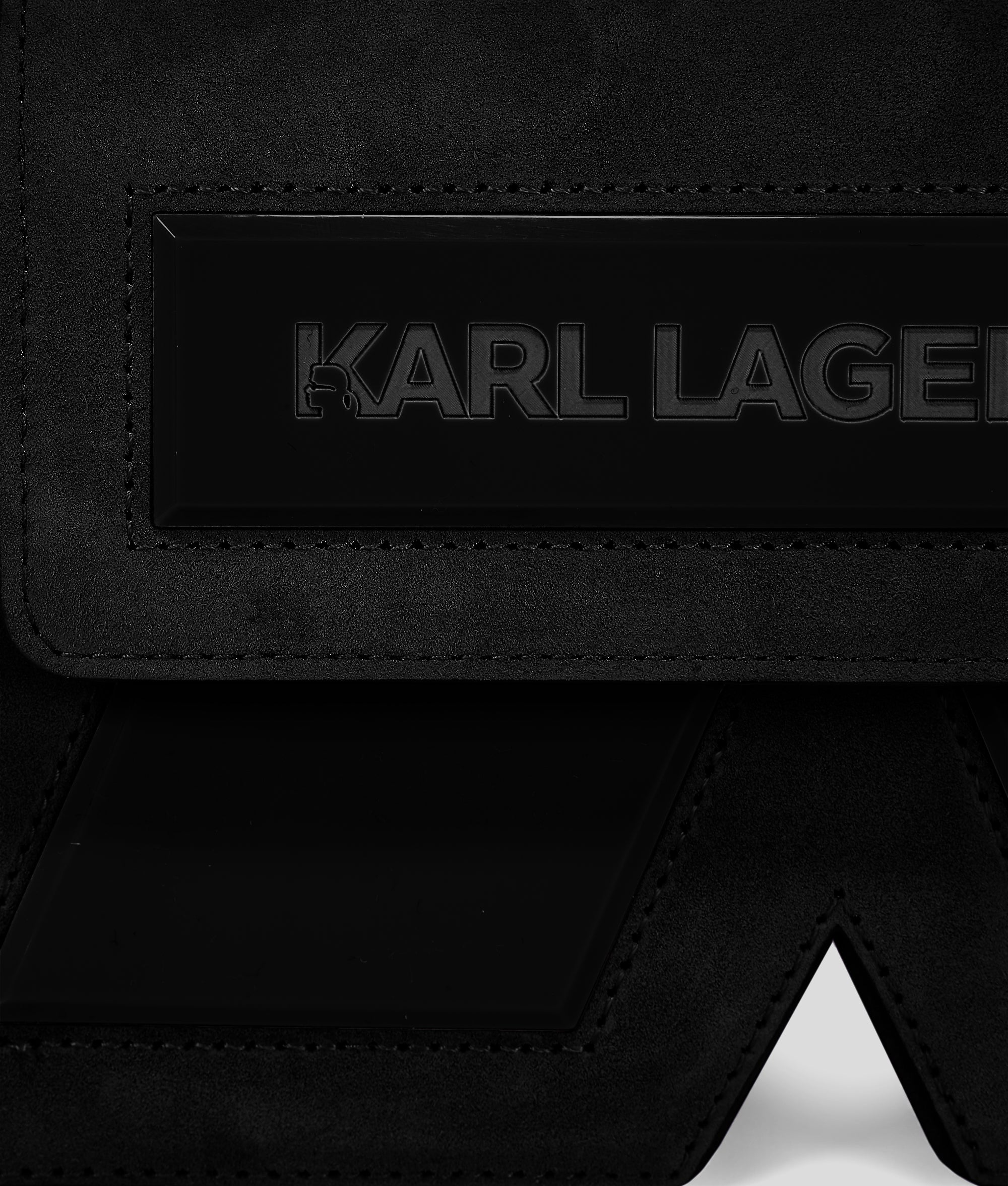 This contemporary crossbody is defined by an architecturally-inspired silhouette, reminiscent of Karl Lagerfeld’s iconic initial. The playful piece is made from rich suede in delicate seasonal hues and is adorned with polished resin highlights topped with the unmissable KARL logo. A bold top handle and optional strap complete the statement design with versatile crossbody to clutch styling.