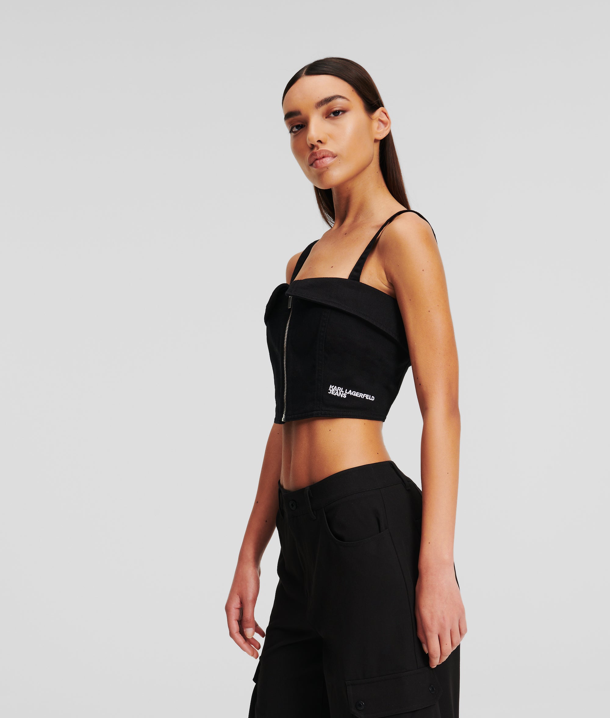 Unleash your inner cool with this ultra-fitted, cropped bustier top. A shiny silver zip at the front closure adds a touch of edge, while the folded detail at the neckline gives a polished twist. Topped with an embroidered KARL LAGERFELD JEANS logo the sleek design pairs seamlessly with high-waisted jeans or a denim maxi skirt.