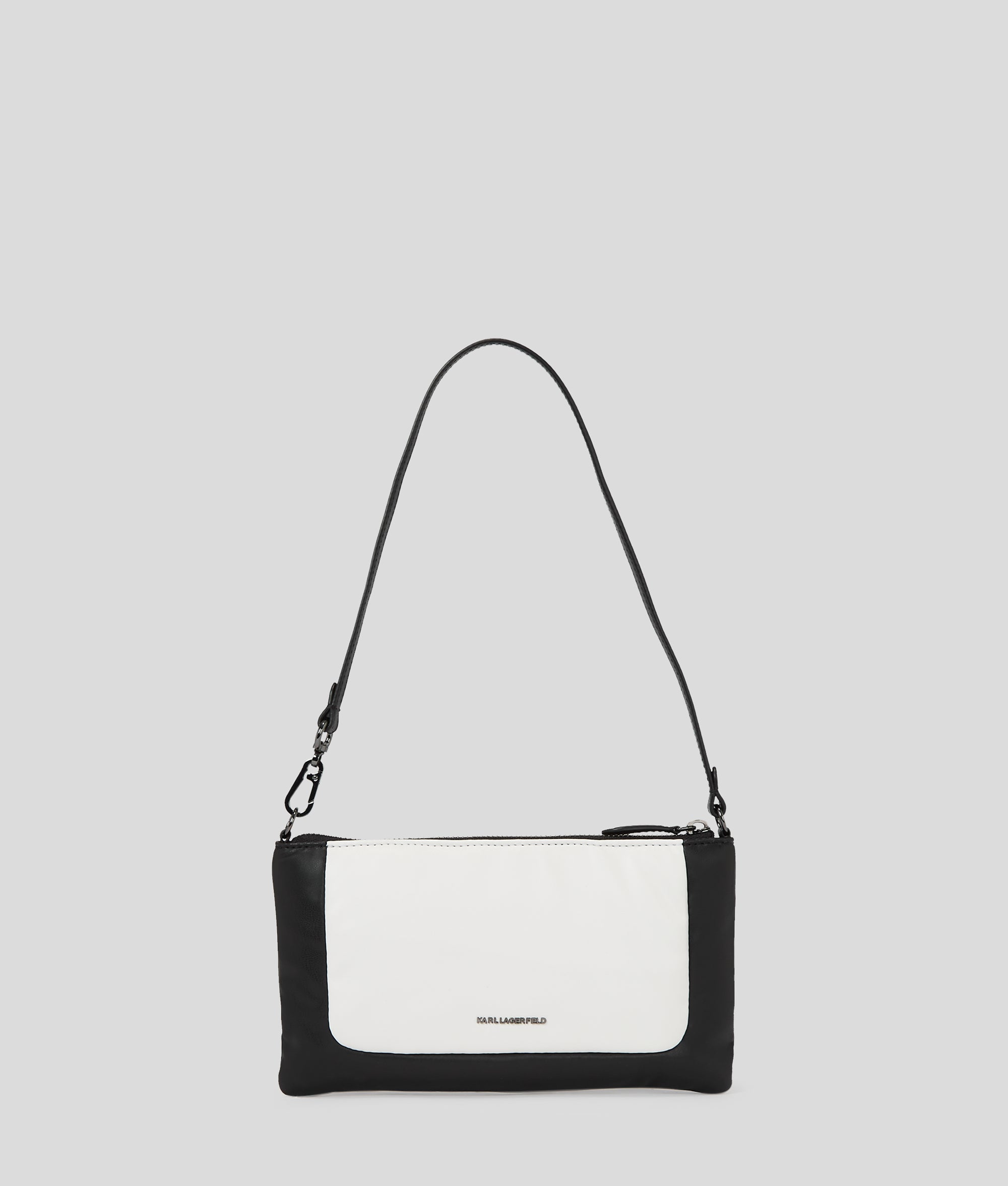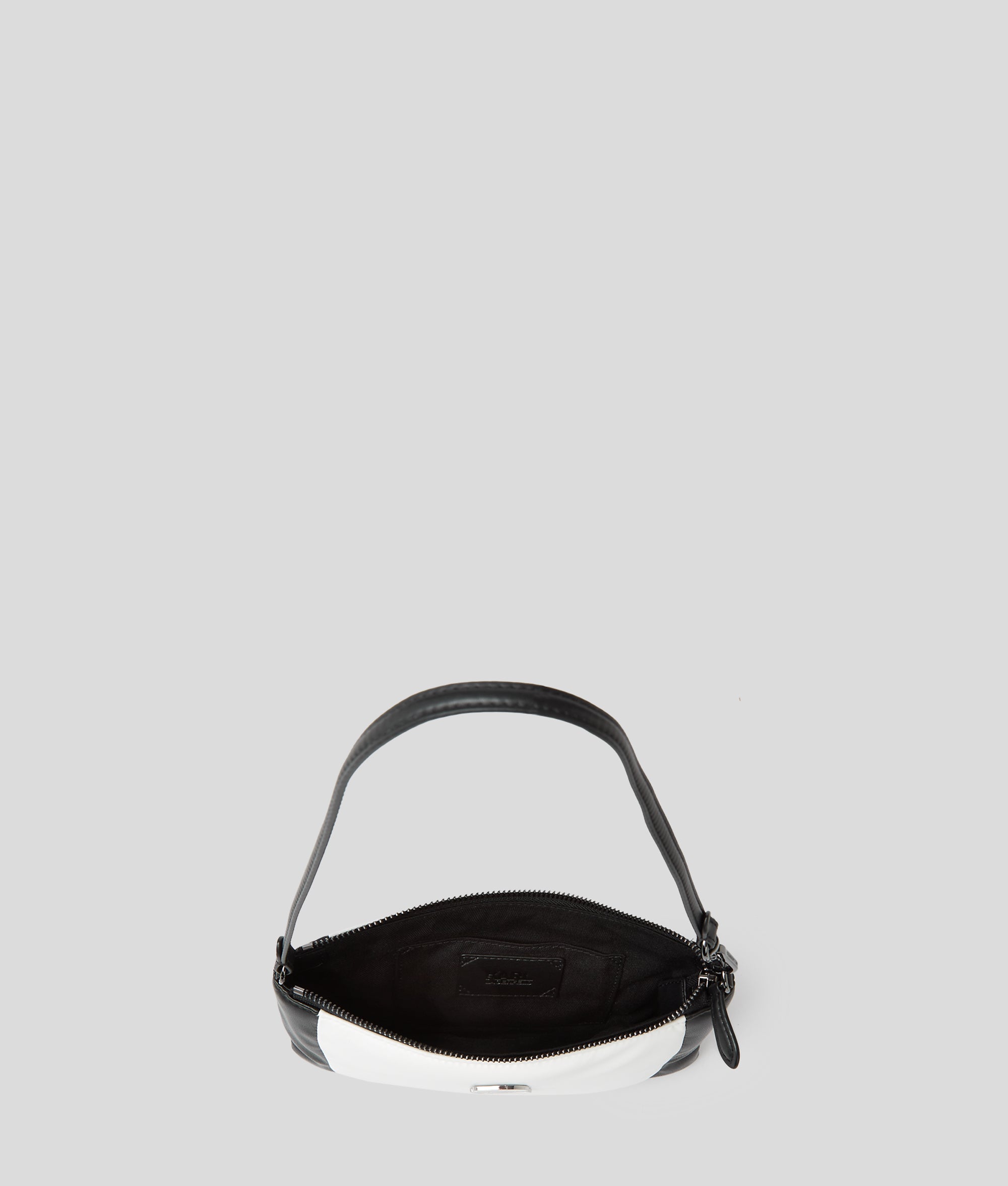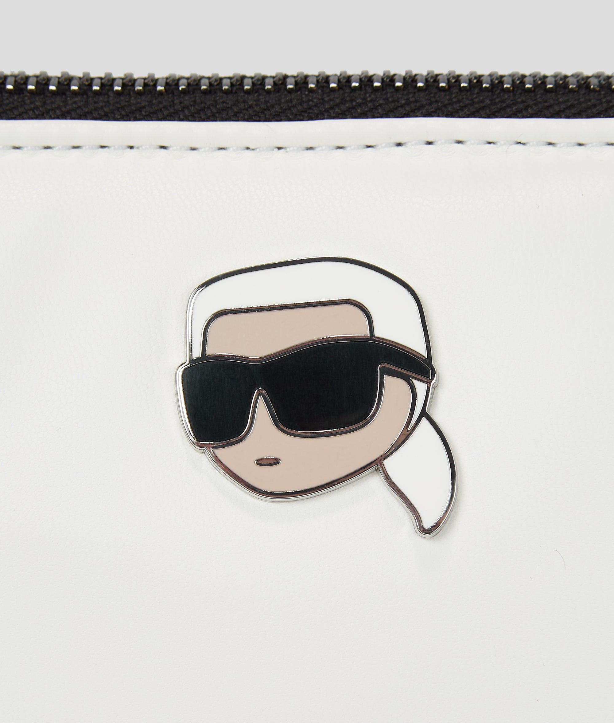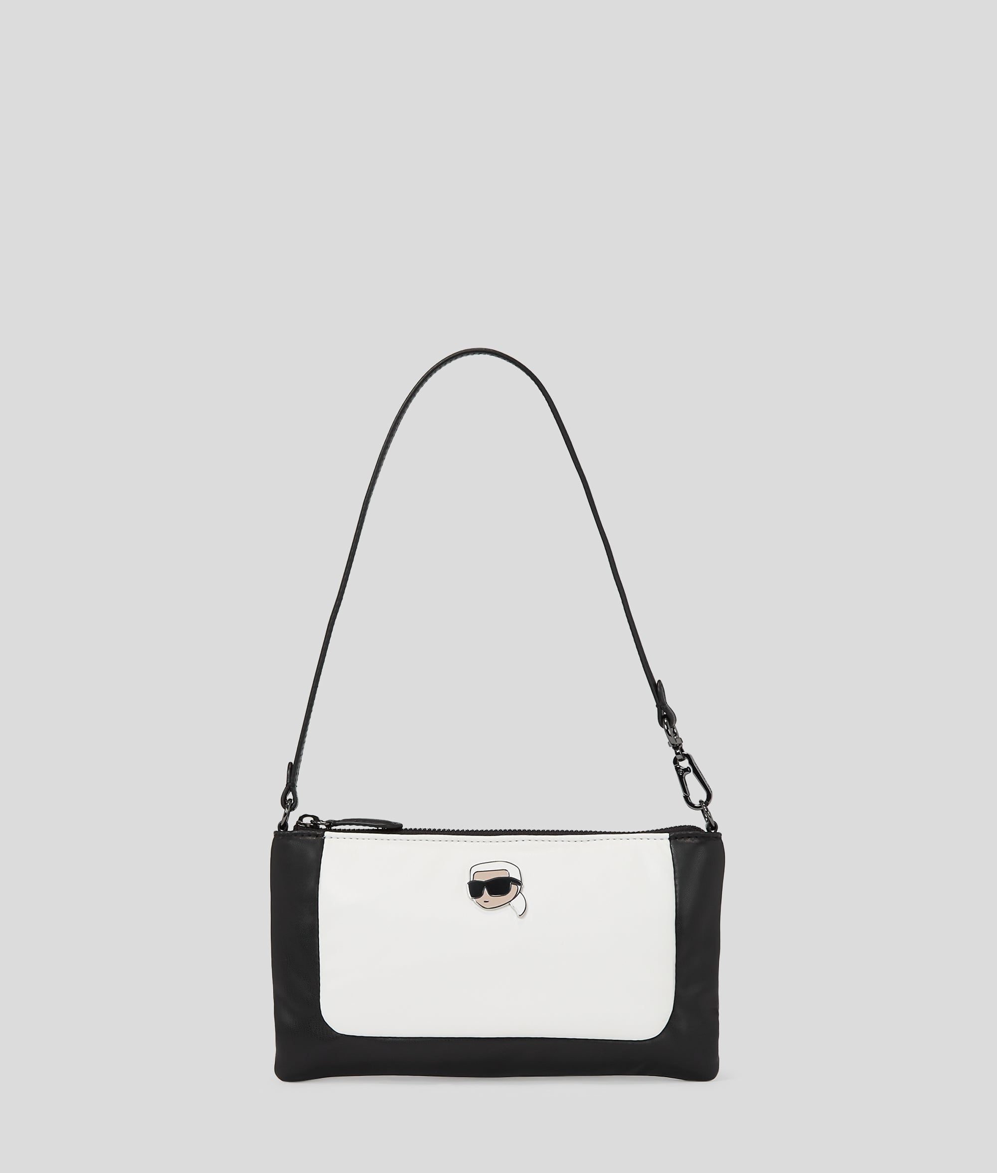 This technical leather pouch boasts a plush, pillowy silhouette and detachable strap allowing for shoulder-to-clutch styling. The evening accessory highlight is adorned with IKON Karl artwork for a playful finishing touch.