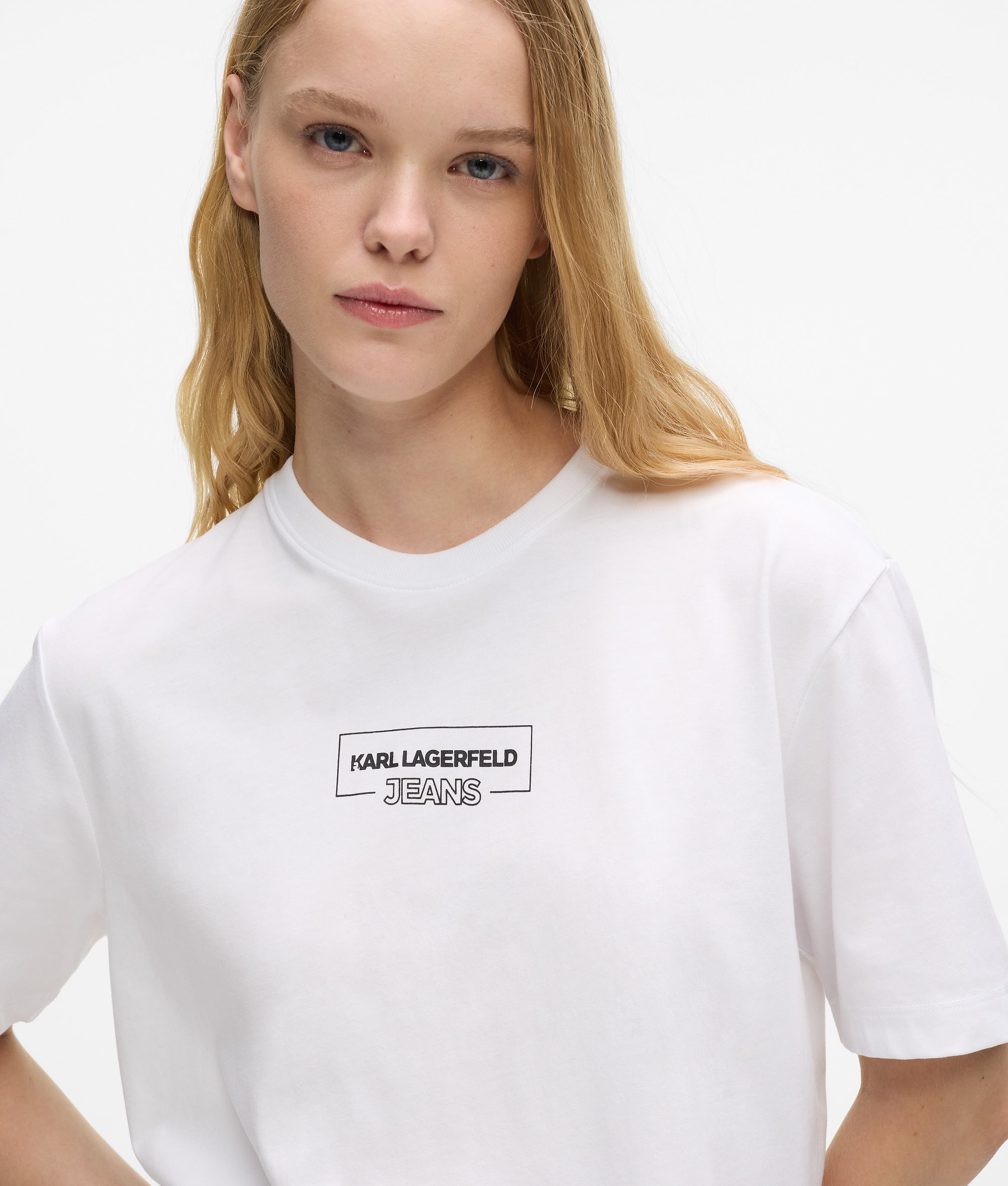 A casual staple transformed by iconic style. This classic crew-neck T-shirt is made from breezy cotton and topped with Karl Lagerfeld Jeans logo artwork at the chest.