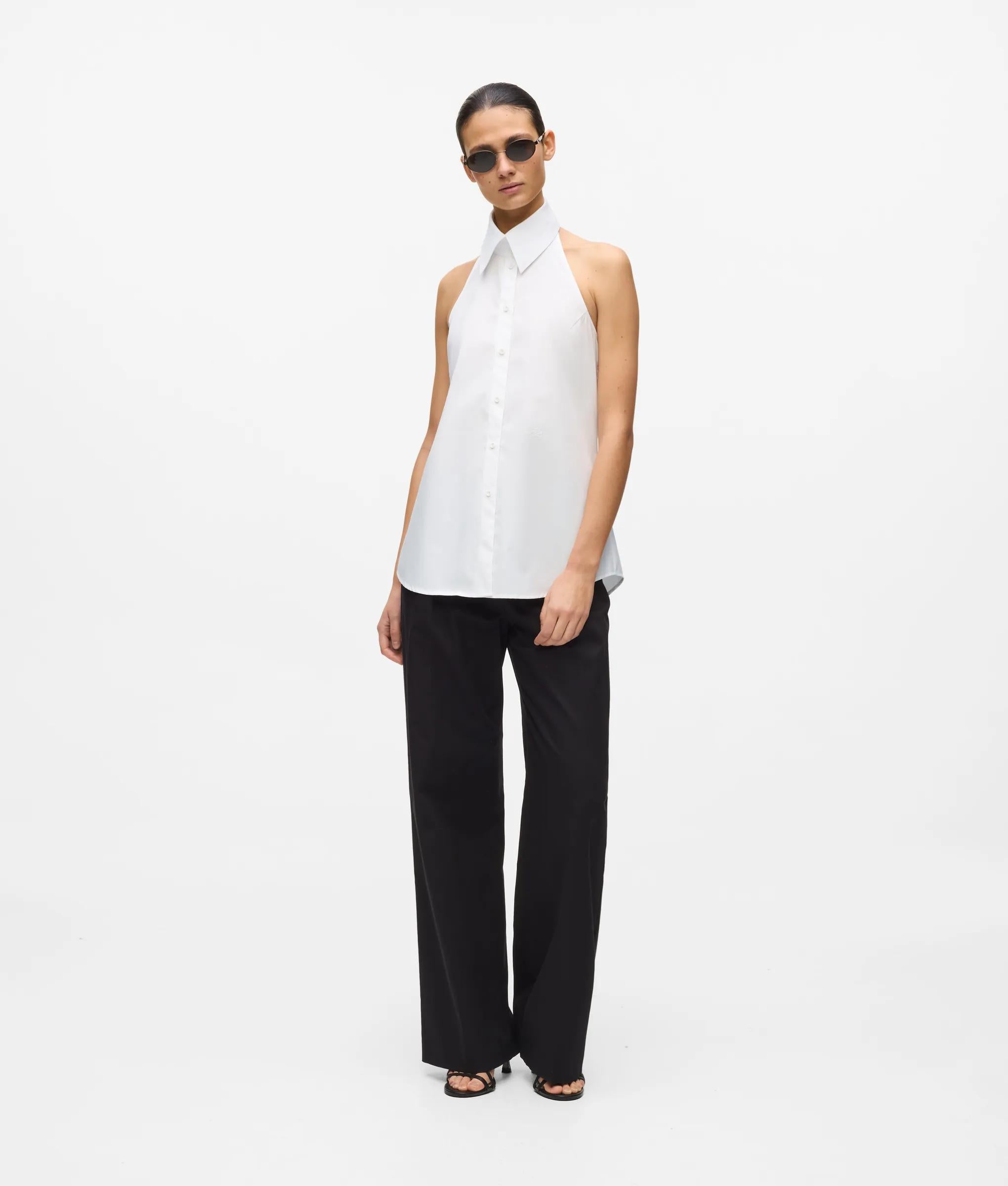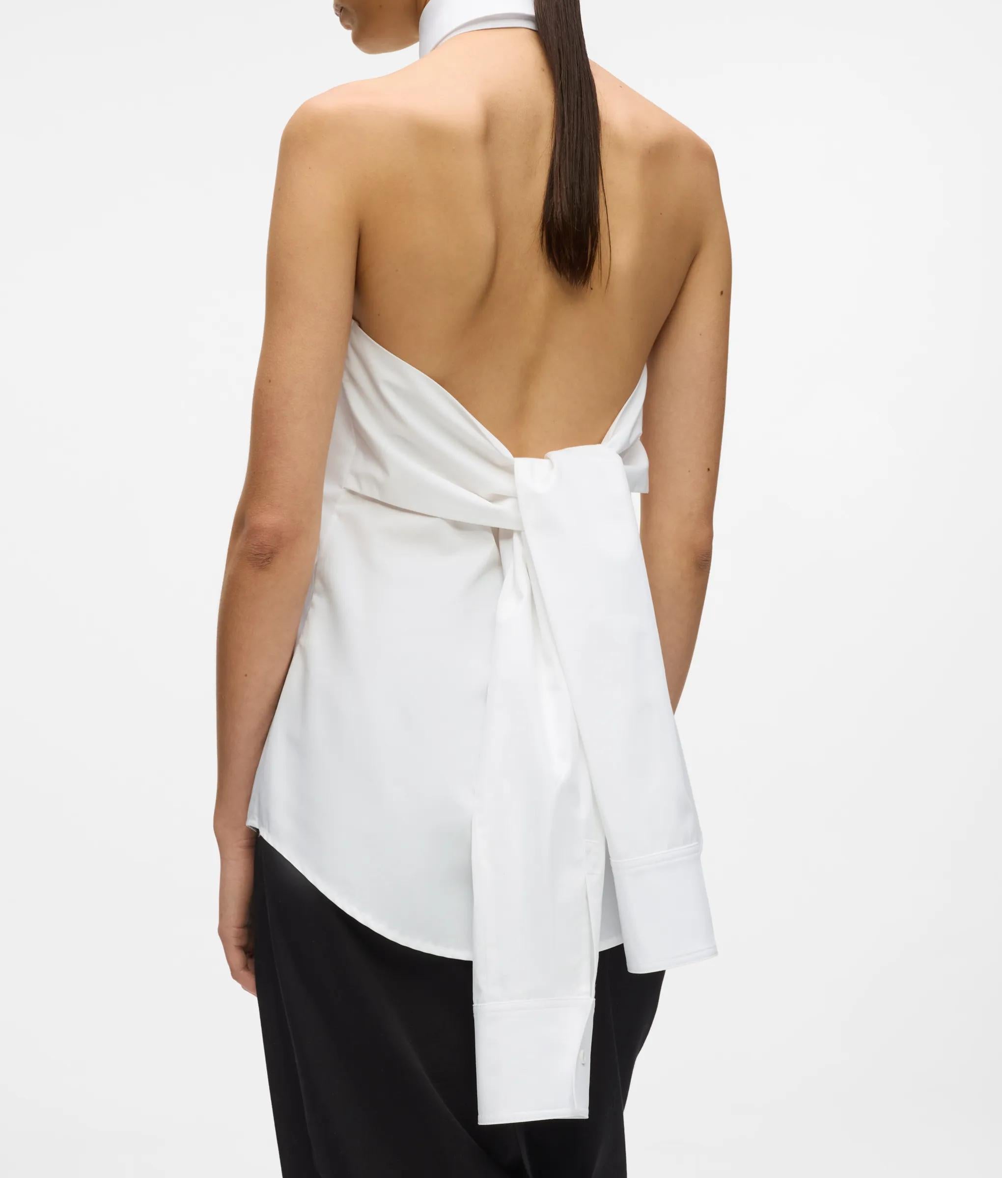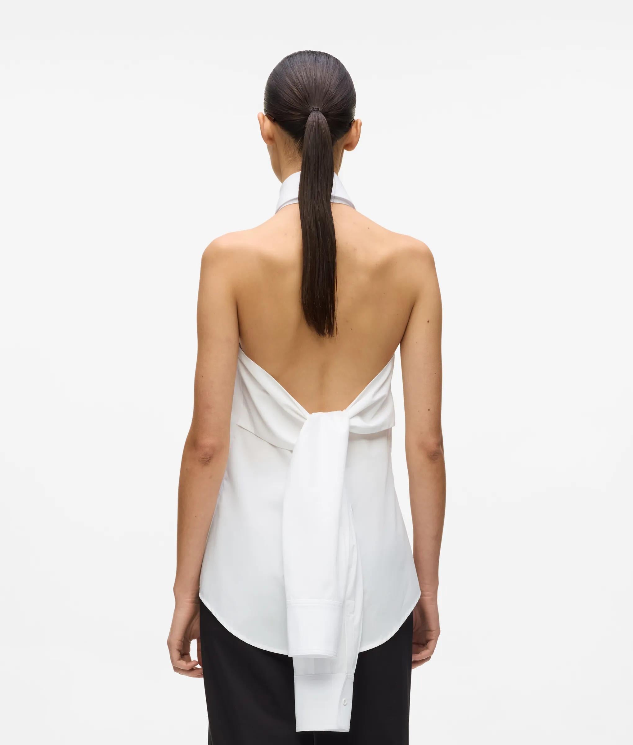 Playful and alluring, this halterneck silhouette offers a fresh summer take on the classic poplin shirt. The low cutaway back adds drama, while decorative sleeves tie at the back for a modern finish.
