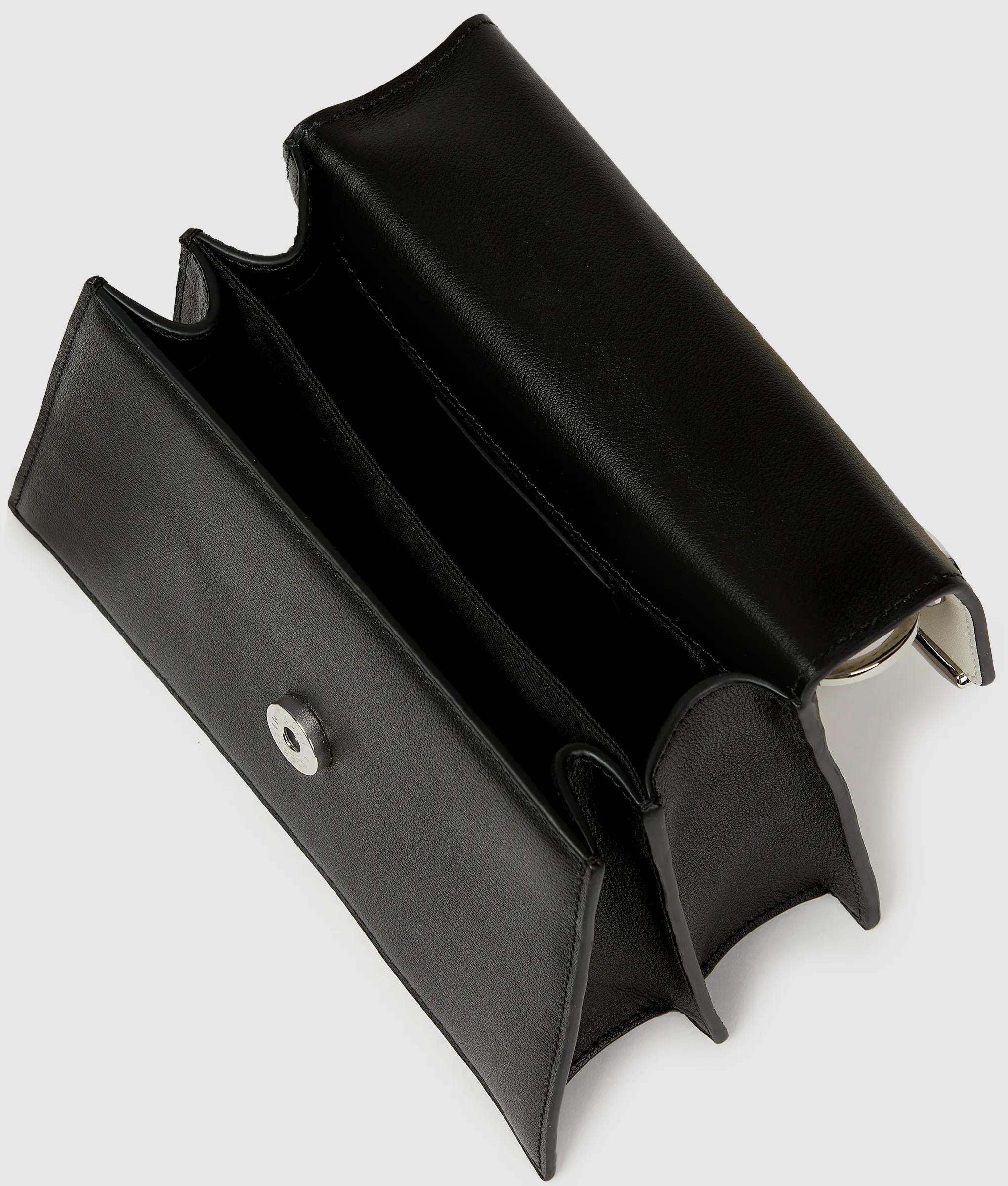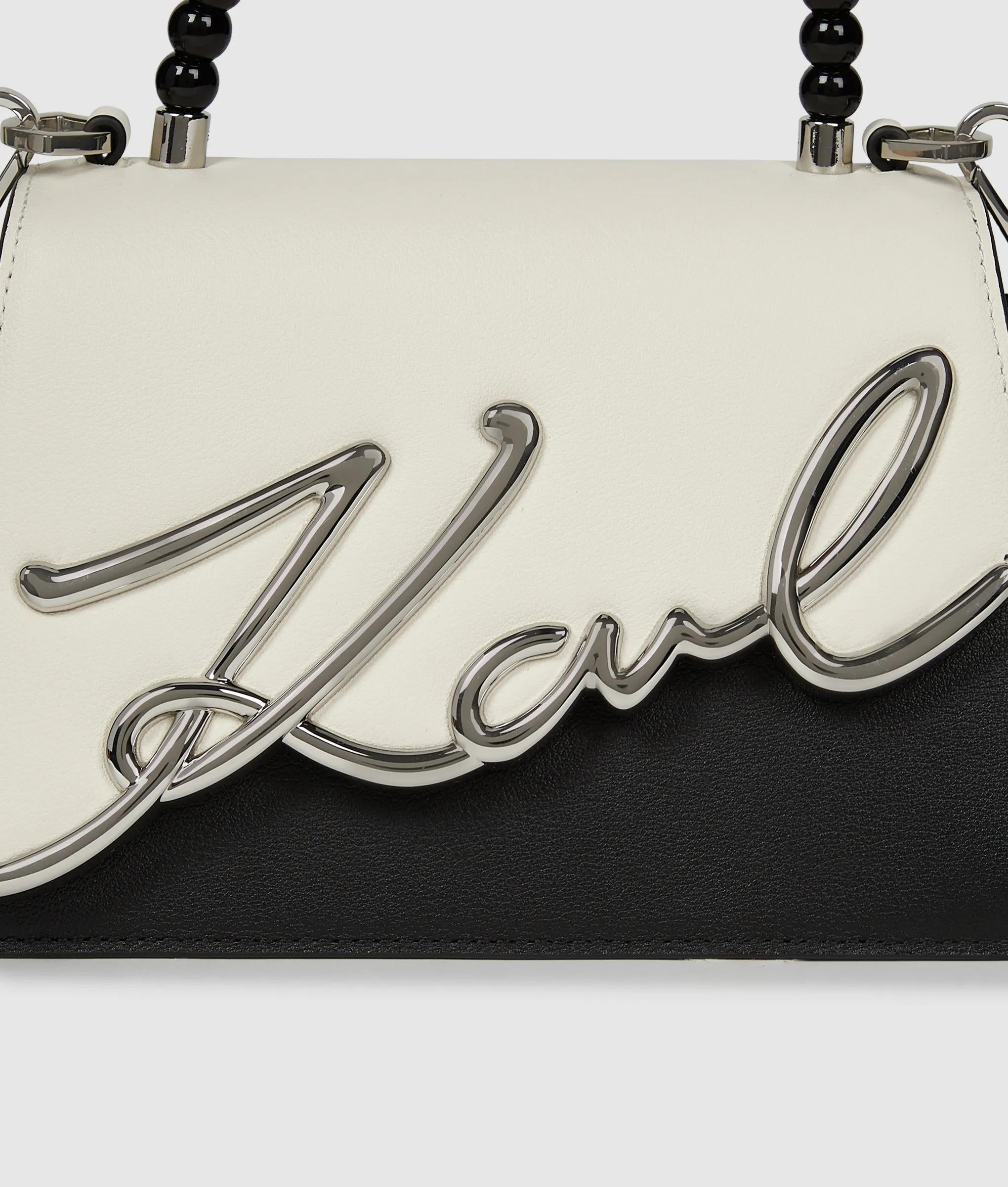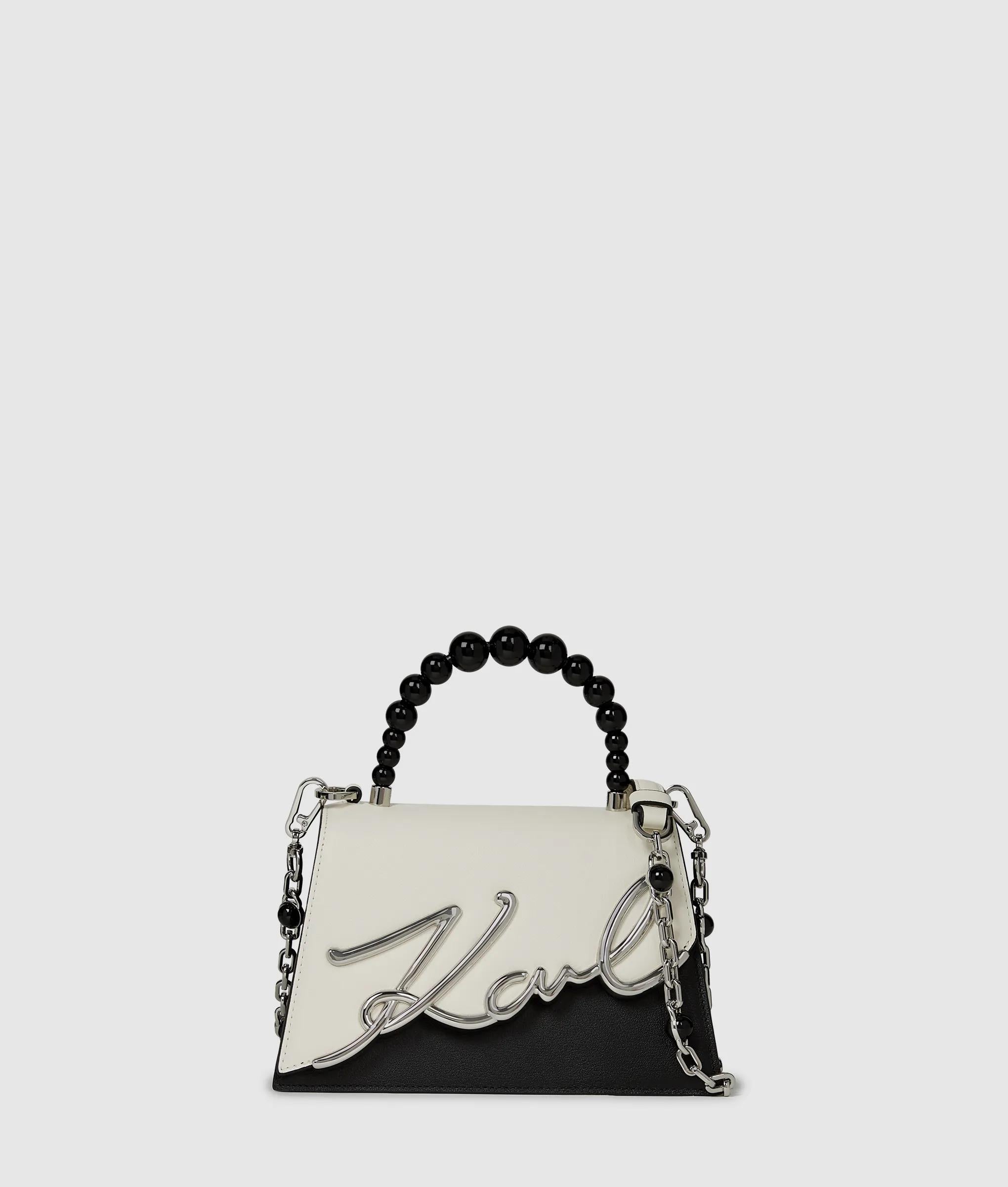 Bring a touch of drama with this top handle bag, inspired by Karl Lagerfeld's iconic ballet and opera designs. Dramatic color-blocking and versatile straps embellished with resin pearls take center stage.