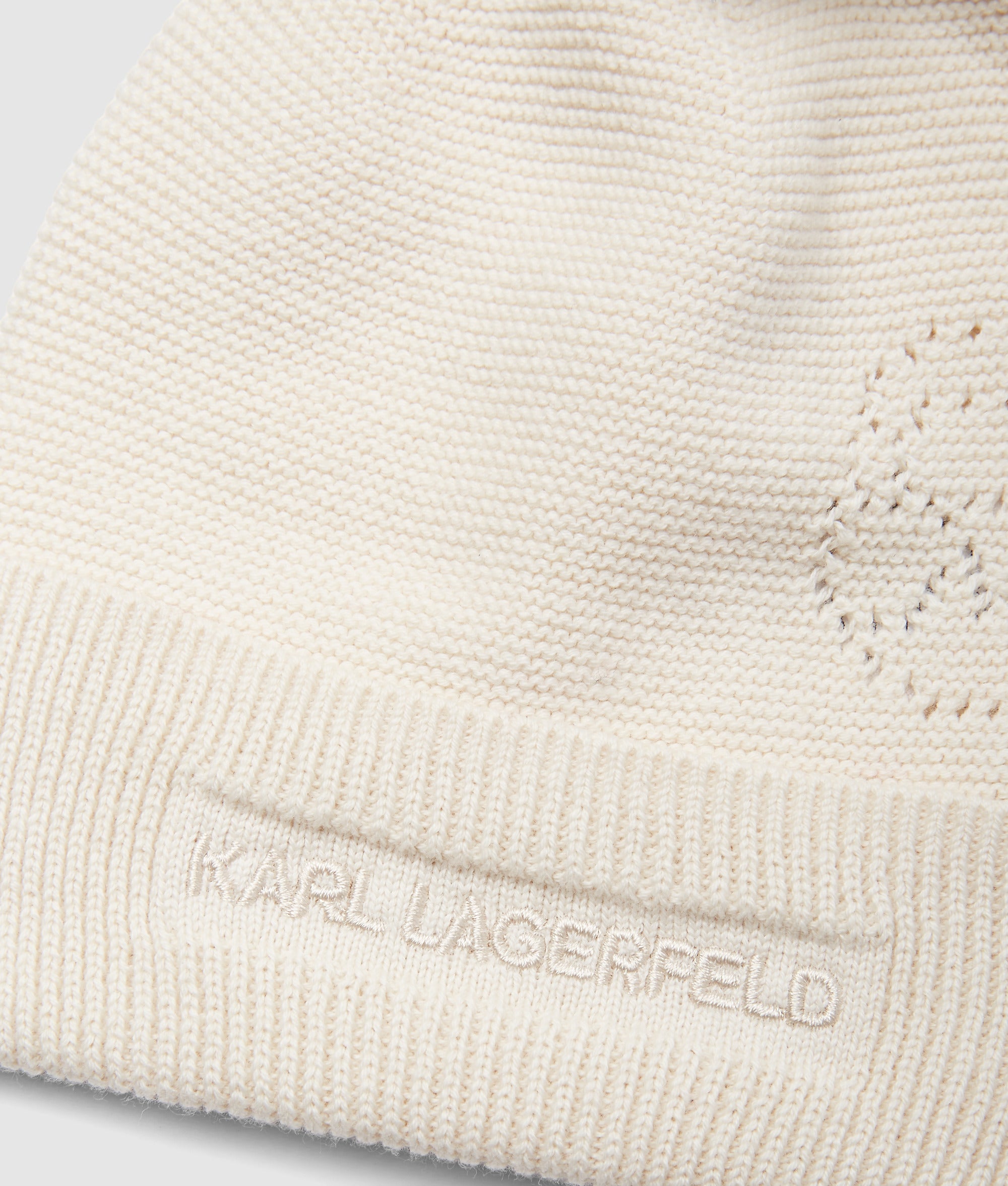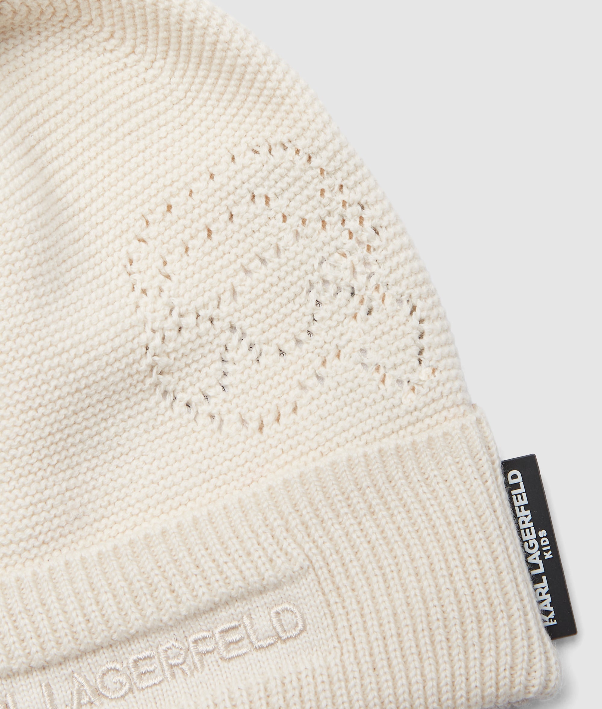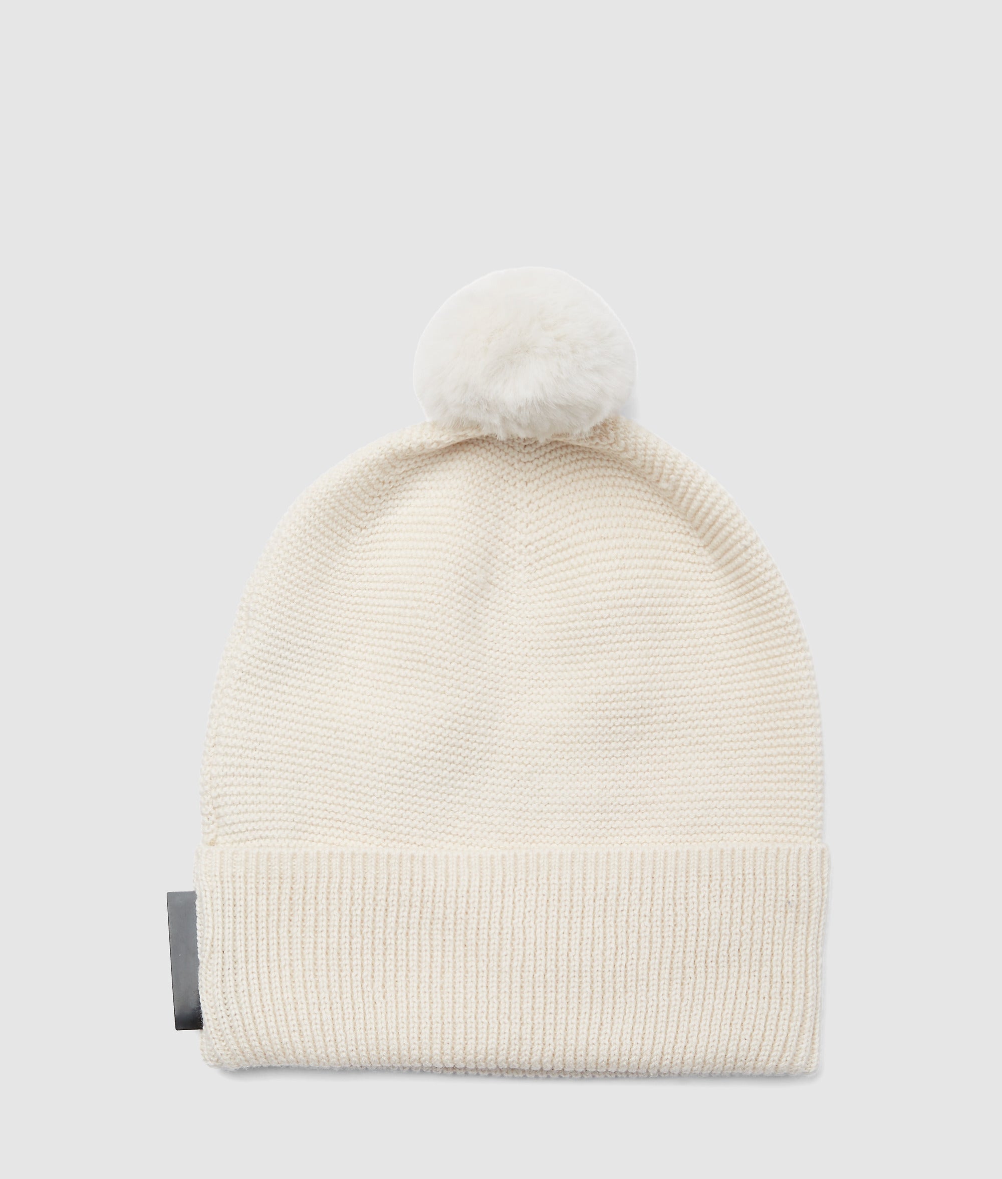 A playful pom-pom tops this cozy knitted beanie, while a ribbed brim adds gentle stretch and subtle logo detail for a snug, stylish fit for newborns.